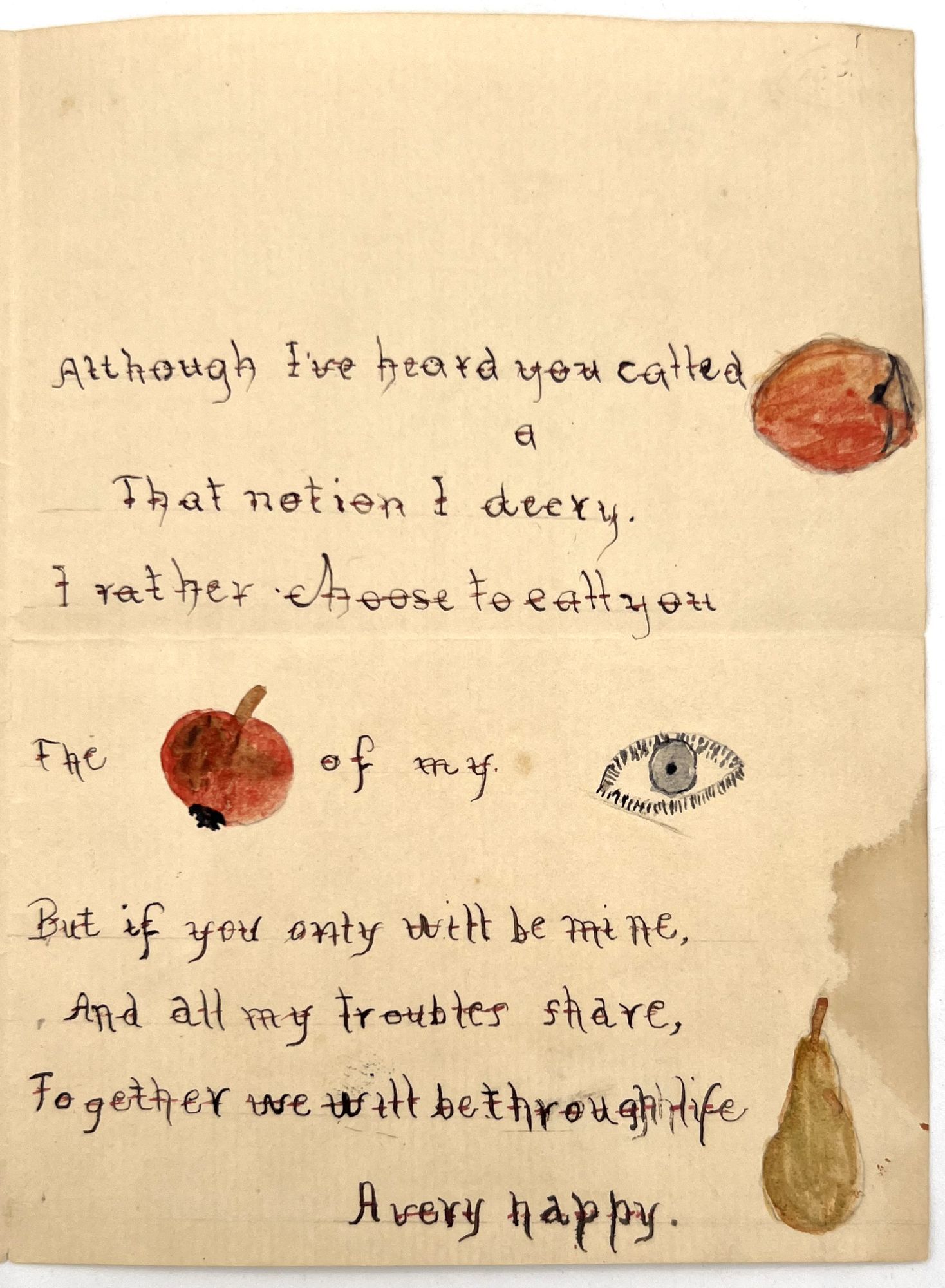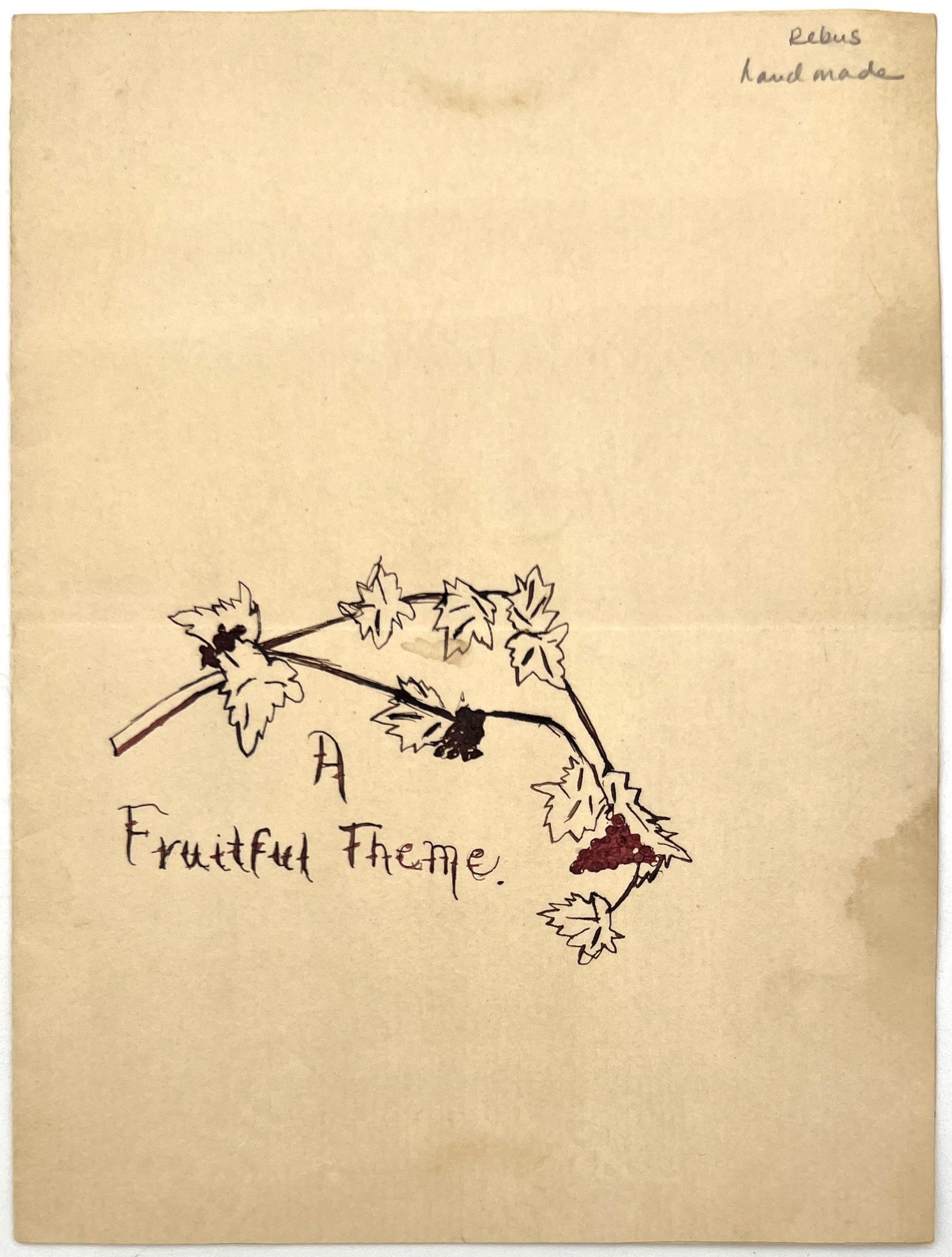 Water stain on margin. A single-fold 6 1/2" x 4 3/4" sheet with a grapevine on the cover titled A Fruitful Theme When opened a hand penned note