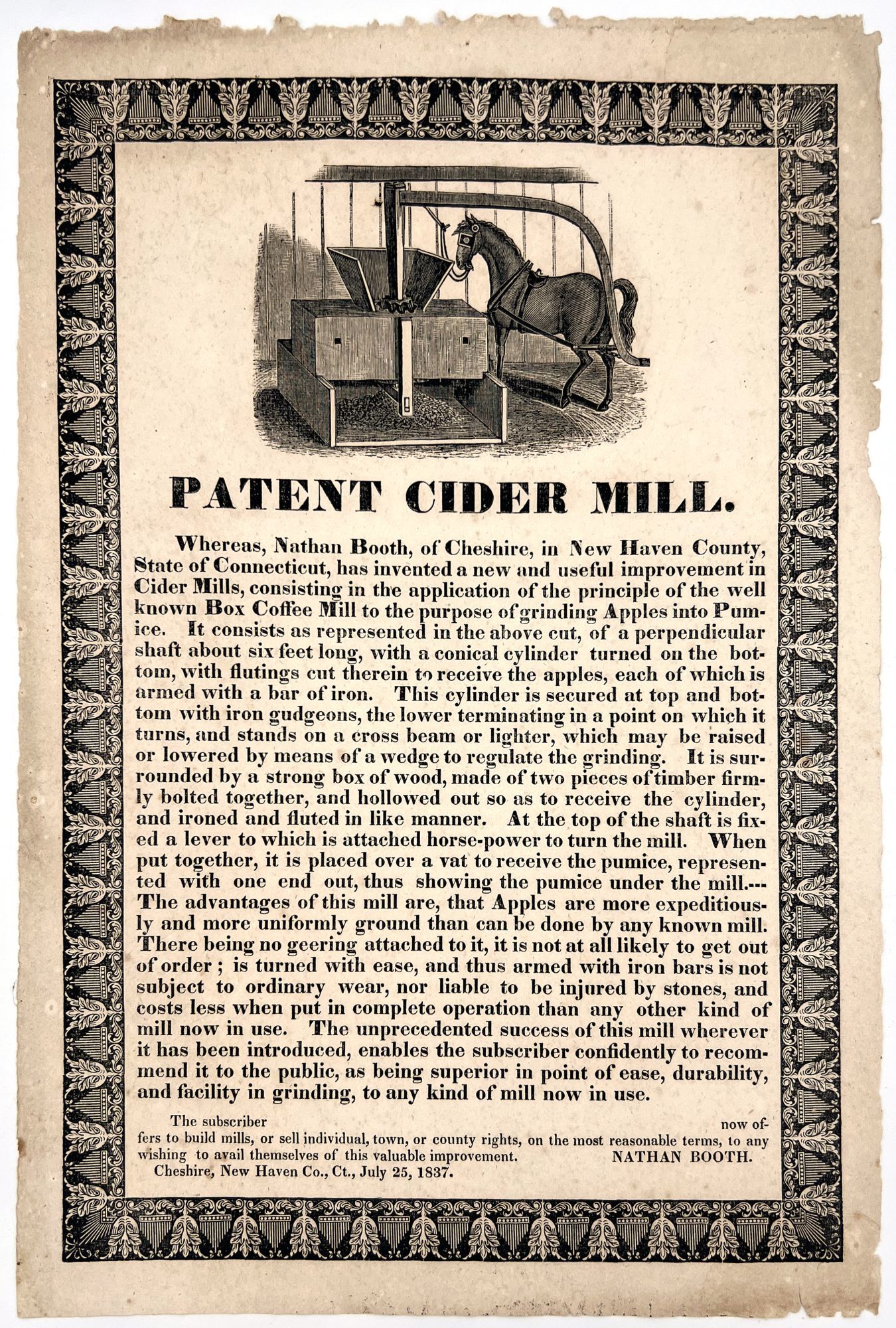 Cheshire CT, 1837. Light argin wear. Else fine.. A 15 1/2" x 11 1/2" broadside promoting a Patent Cider Mill, a new invention by Nathan Both, 1837. A 4" x 5 1/4" woodcut of the horse powered device and the horse. Designed after the Box Coffee Mill for the purpose of grinding Apples into Pumice. The narrative describes the device and operation in detail. Offered to the subscriber to build or sell mills to individual, town or county rights. Nathan Booth. Cheshire, New Haven Co. Ct., July 25, 1837. Geometric decorative devices border the page. Reverse is blank. The National World War I Museum and Memorial.
