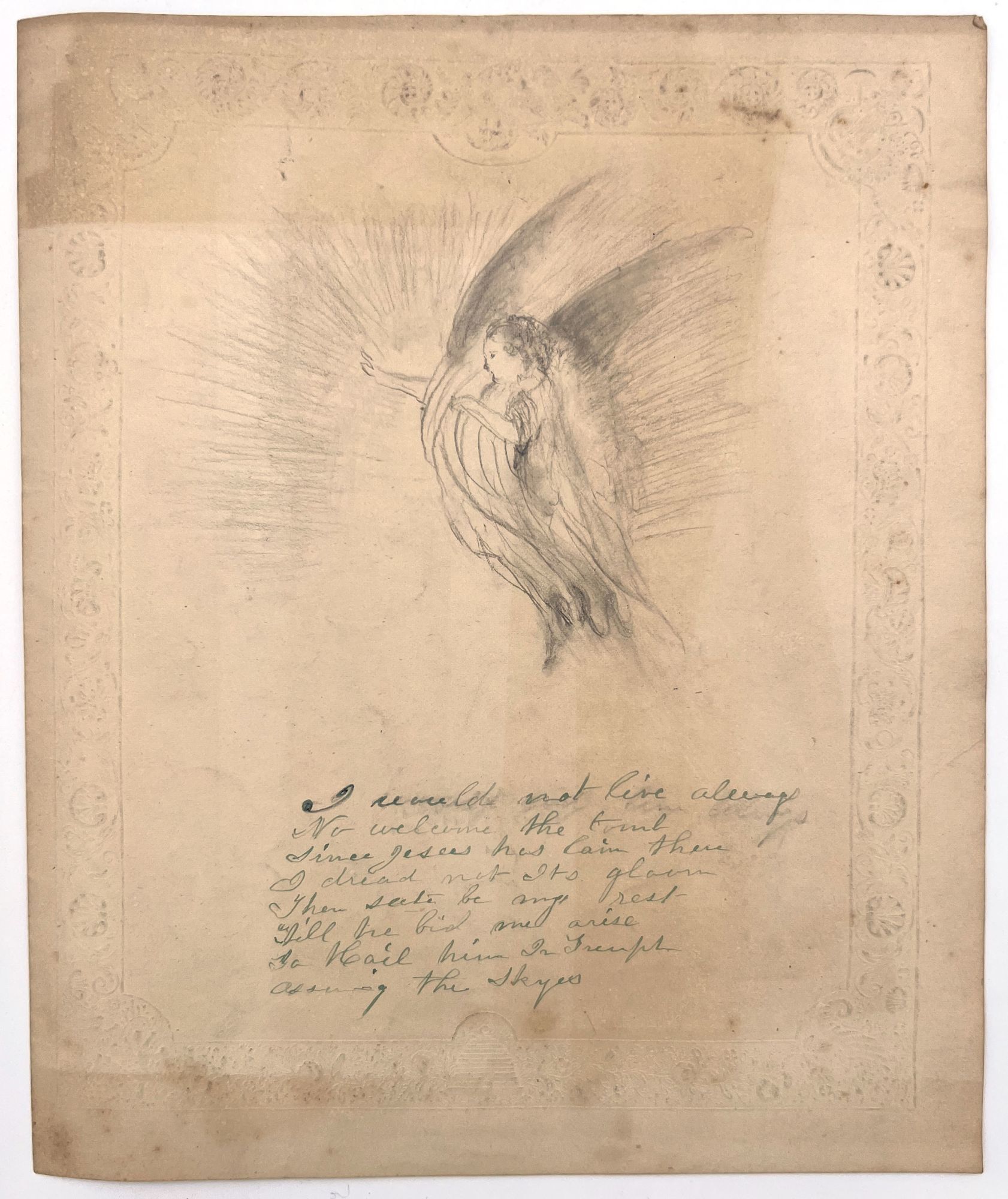 A pencil drawing of an angel on a 9 1/2" x 8" single-fold letter sheet with embossed border decoration.. The angel is somewhat naive surrounded by a halo The penned verse reads "I would not live always, No welcome the time, Since Jesus has rain these I dread not It's glory The sate be my rest Till I've his met arise to Hail him in Fearful assuring the Skyes" Inside is blank.