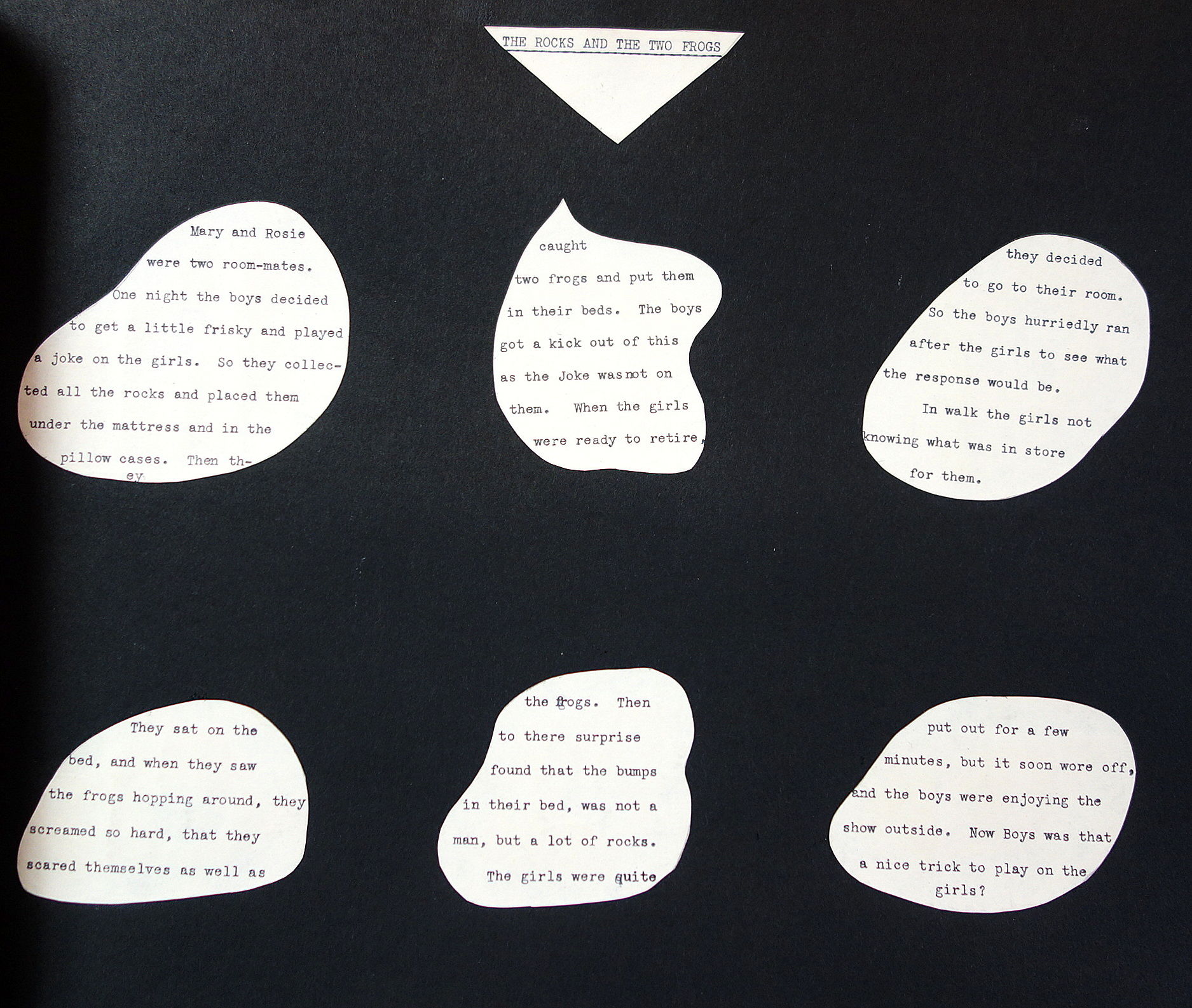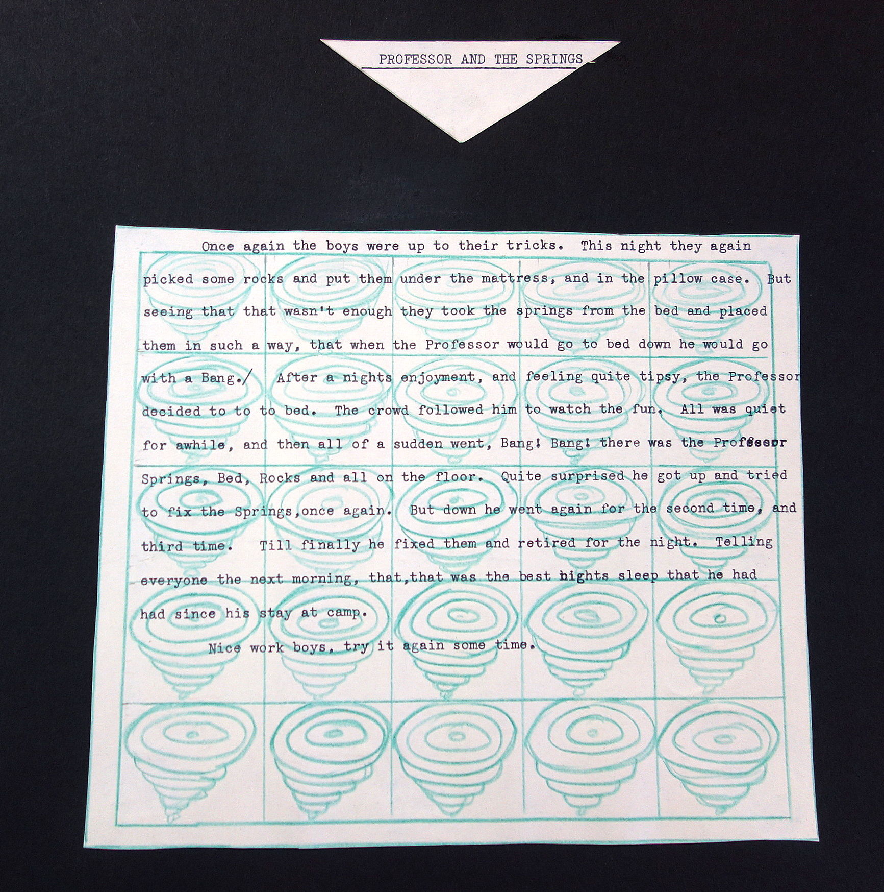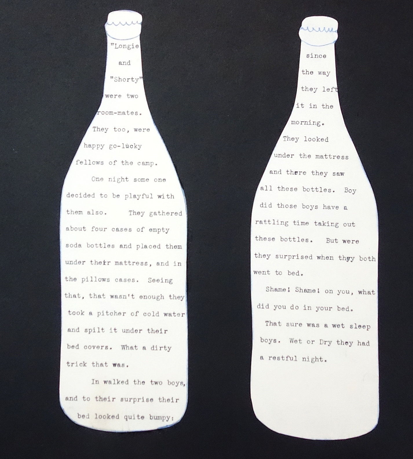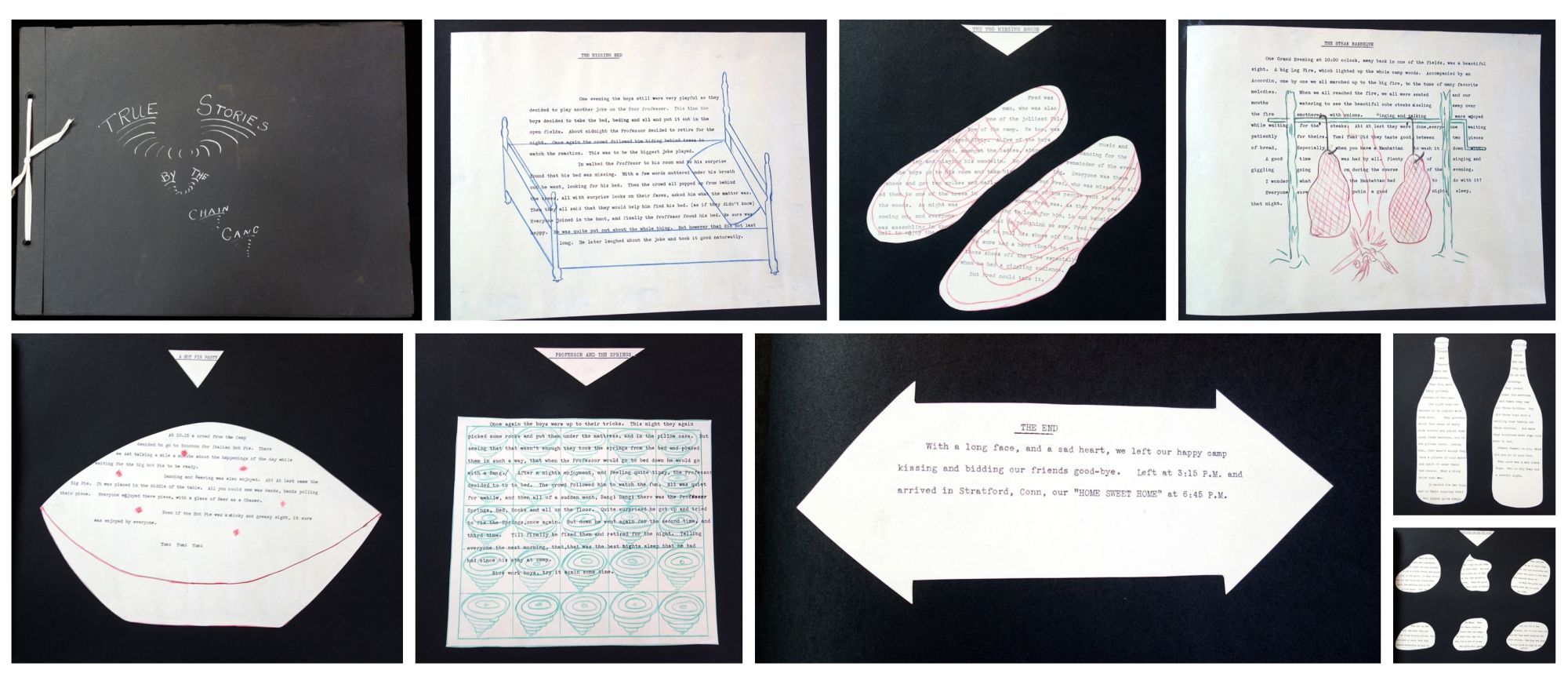 1930. The retelling of camp pranks on typewritten cut-outs artfully arranged in seven (7) pages. The pages are titled