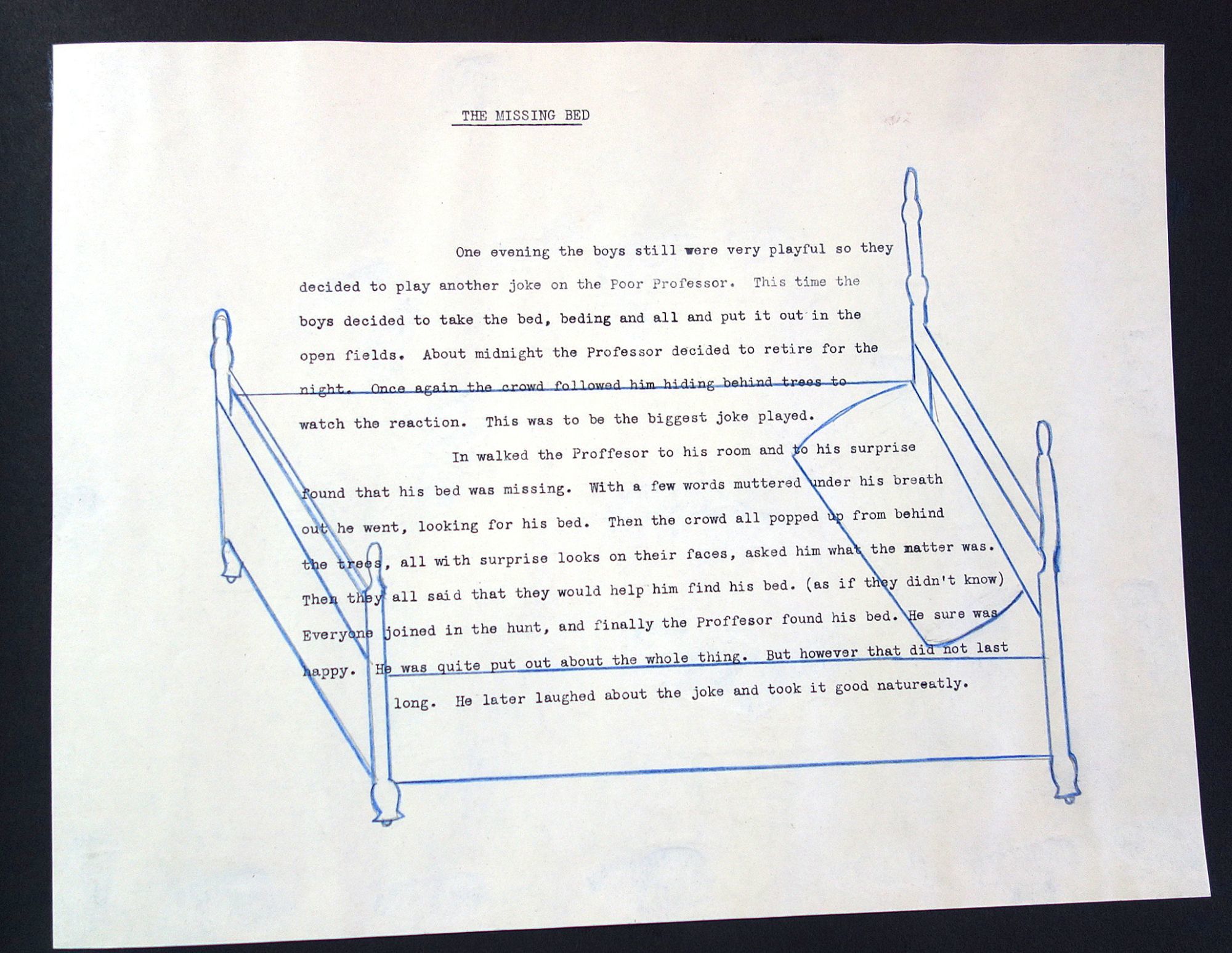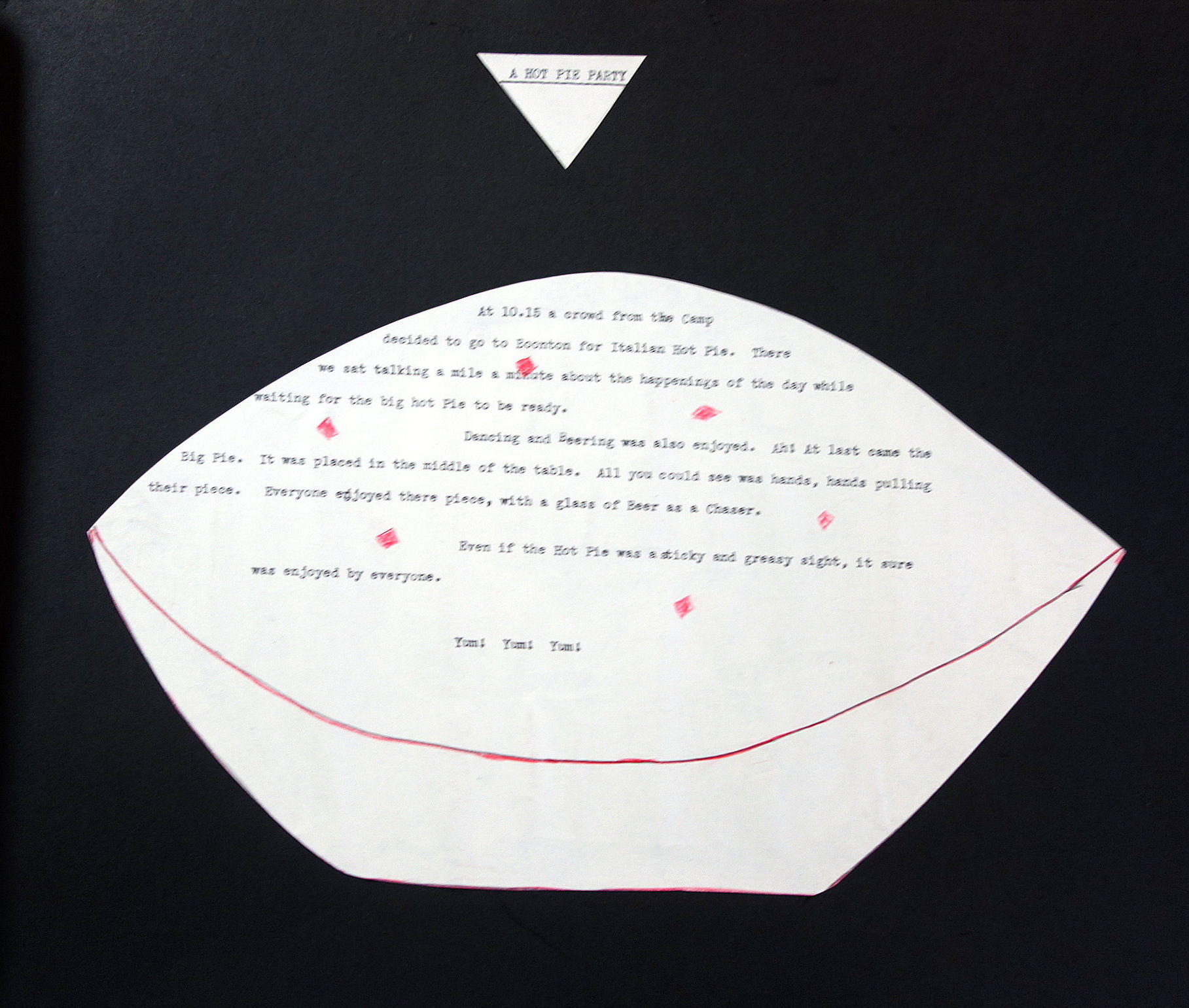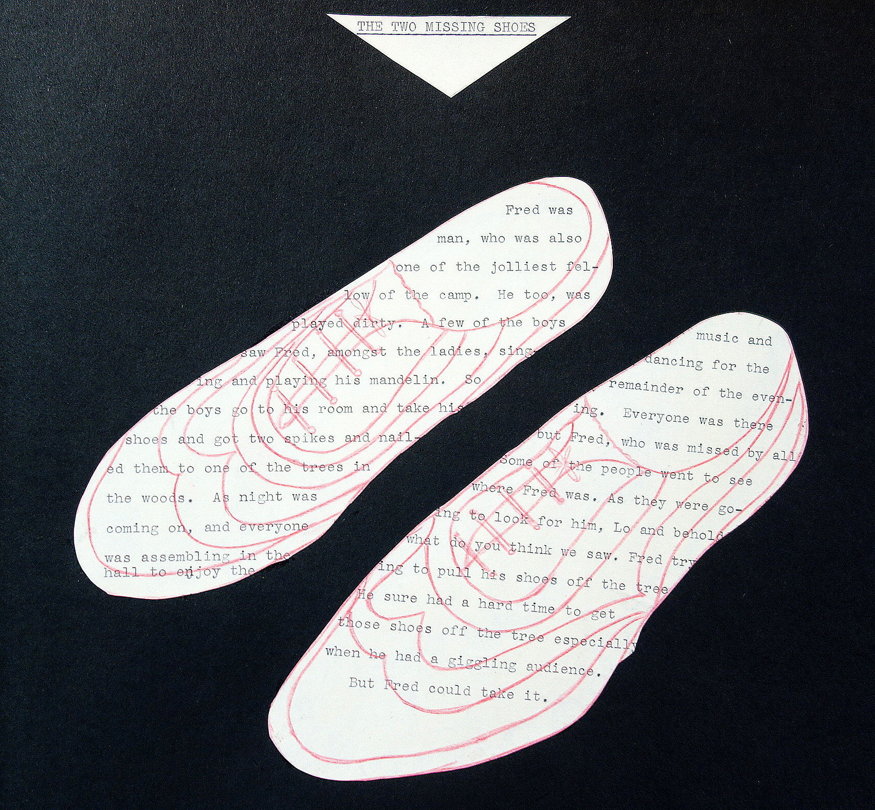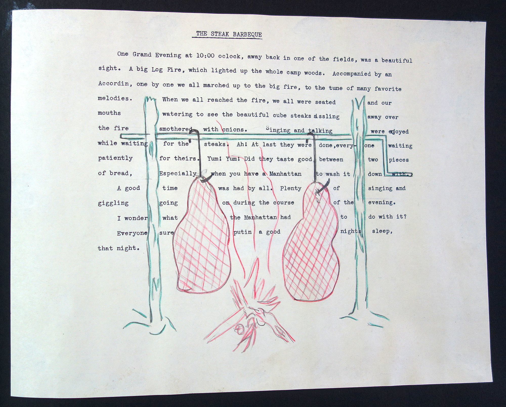 1930. The retelling of camp pranks on typewritten cut-outs artfully arranged in seven (7) pages. The pages are titled