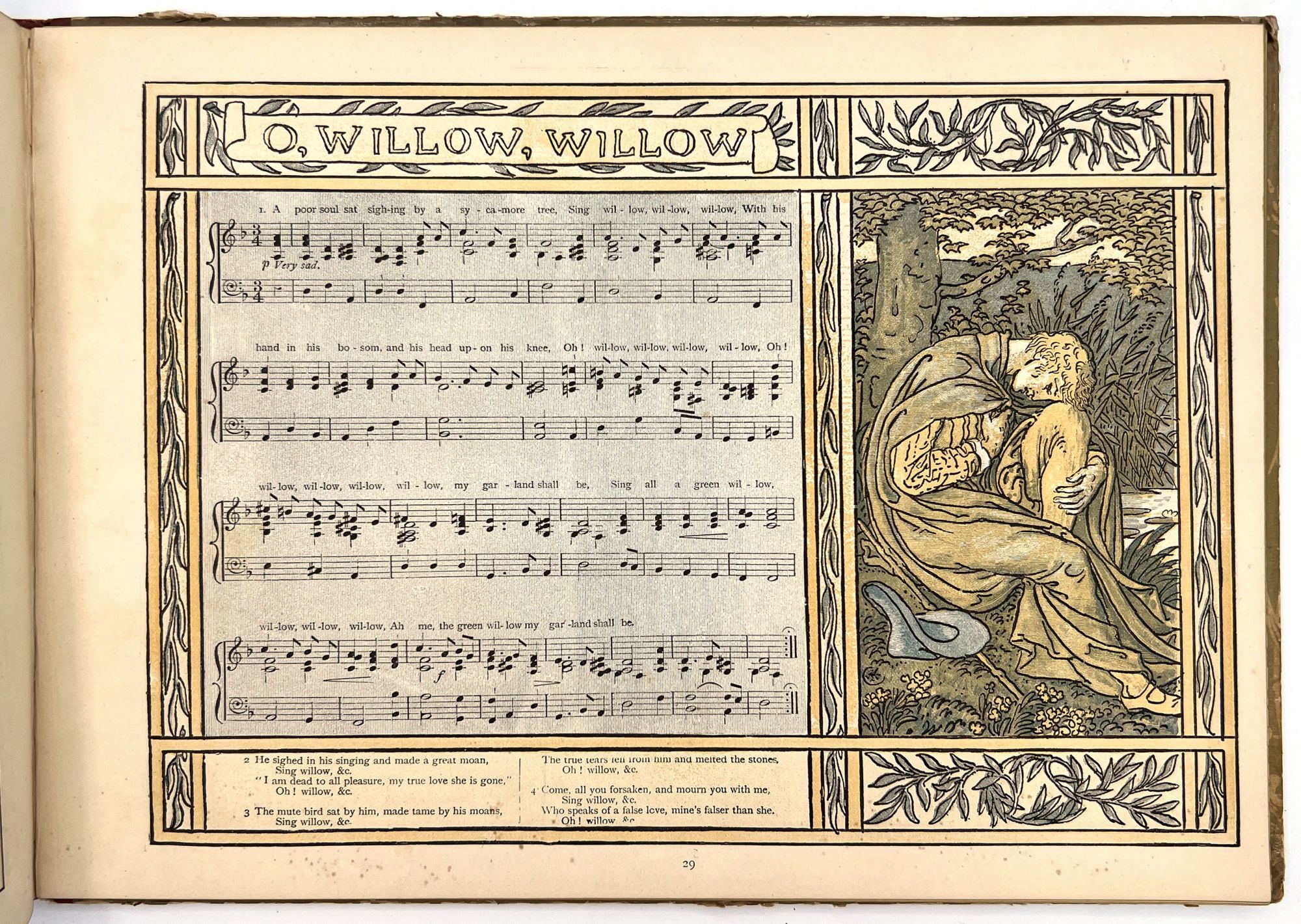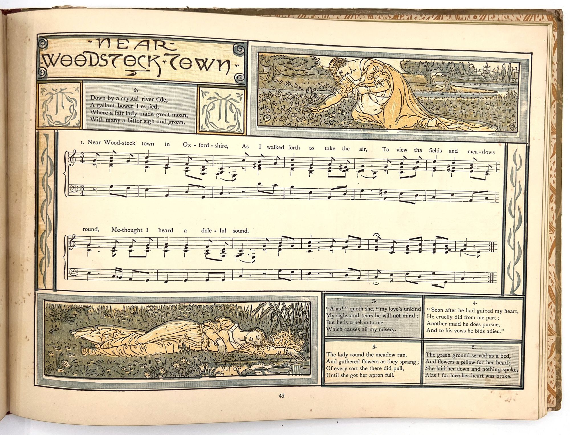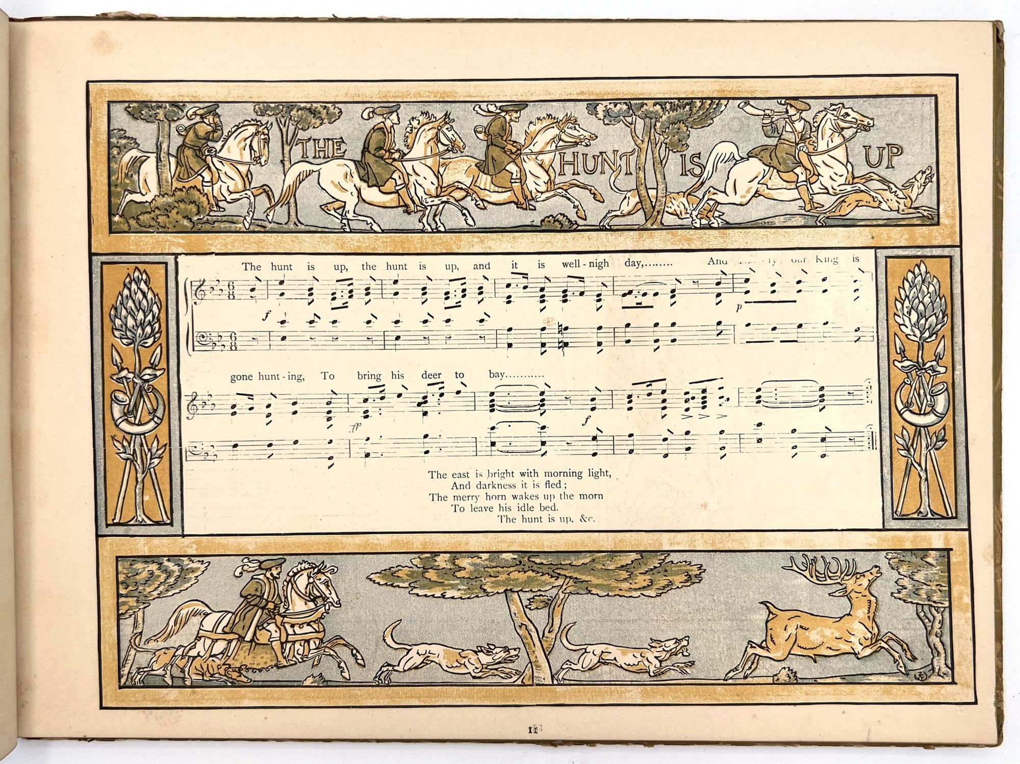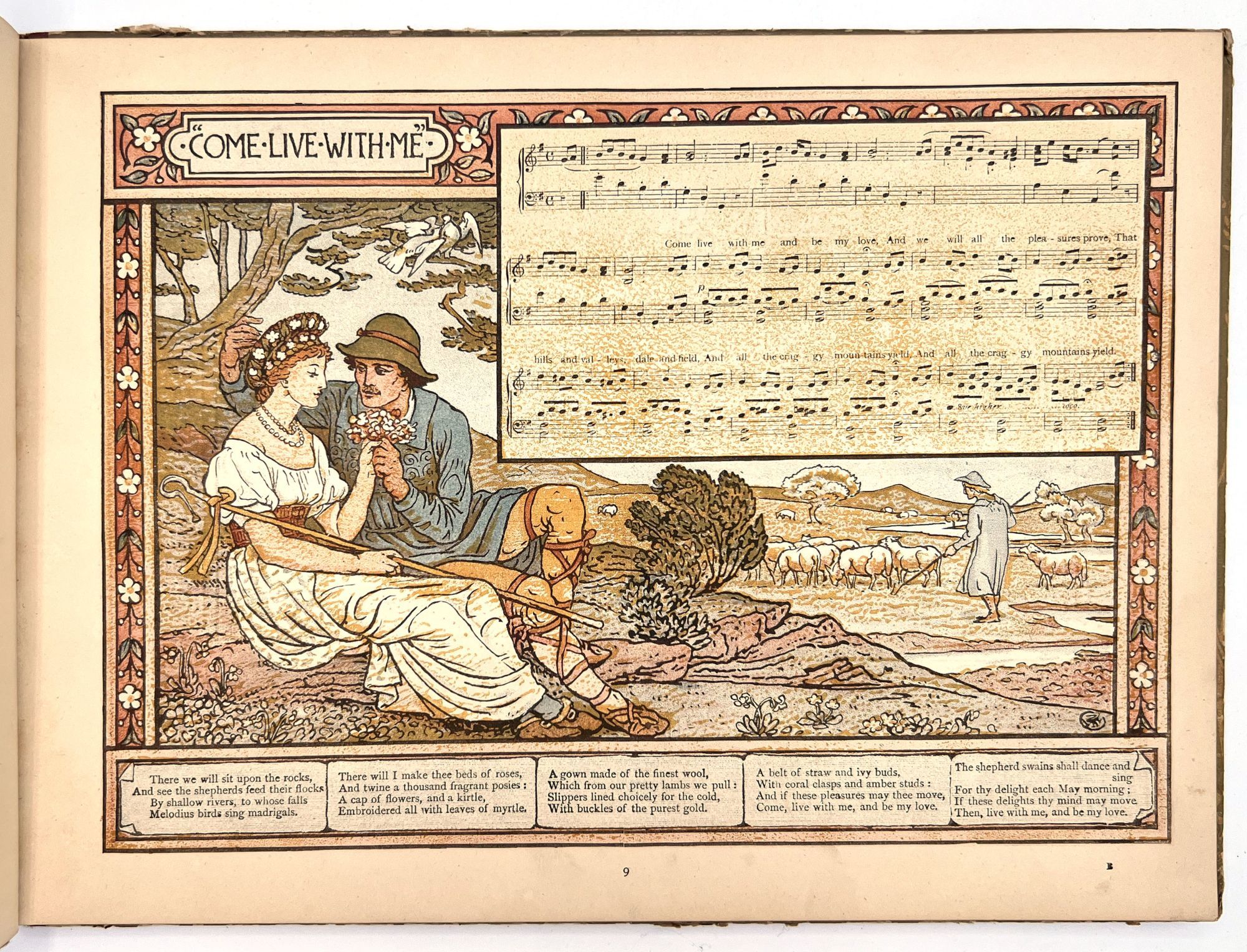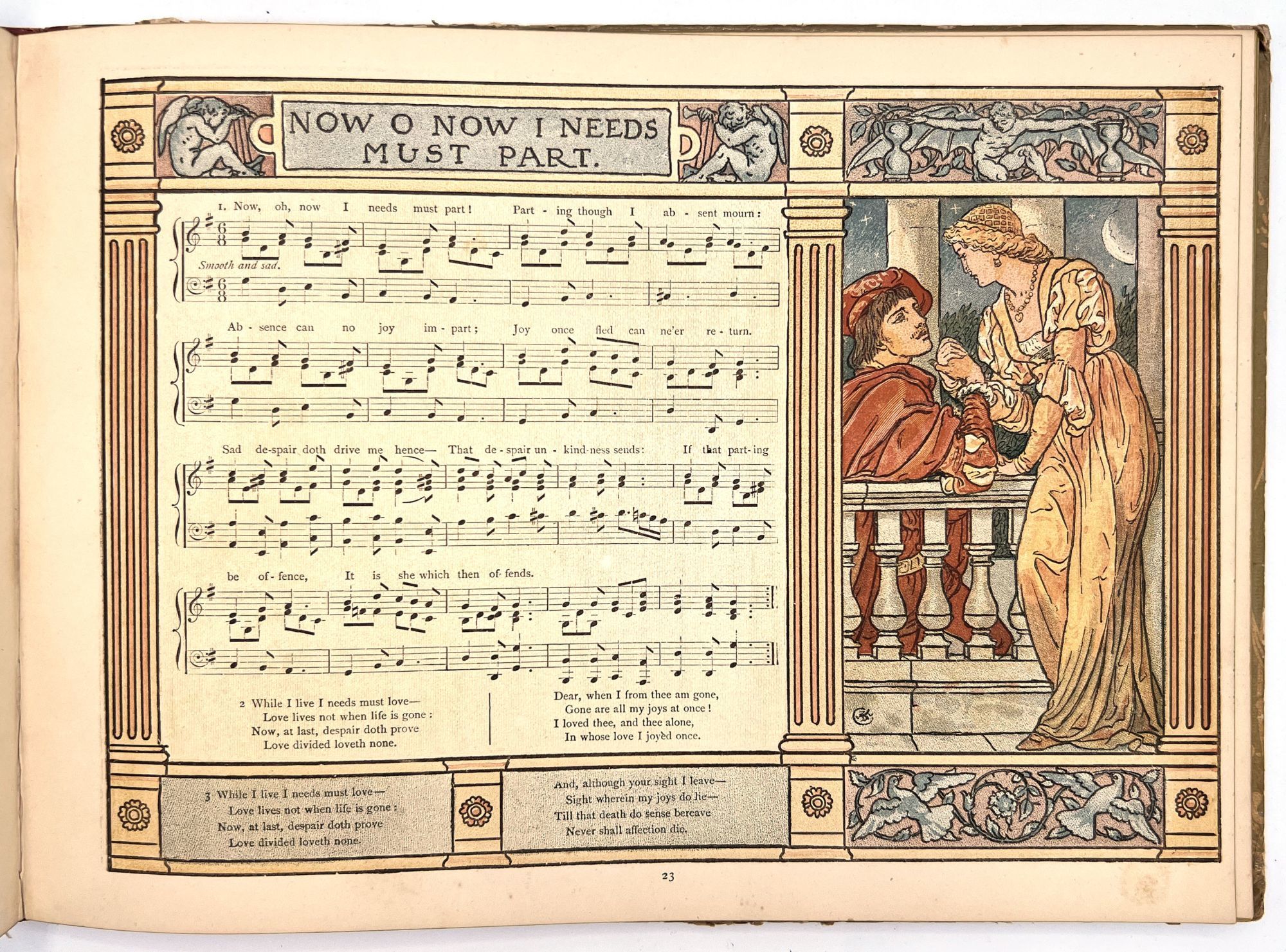 A hard cover book with pictorial covers with 51 pages of song including printed music and musical score. Arranged and with accompaniments by Theo. Marzials ; set to pictures by Walter Crane; engraved and; printed in colours by Edmund Evans. Profusely illustrated in the fanciful Victorian style of Walter Crane, both full page and in-text illustrations. Contents include The