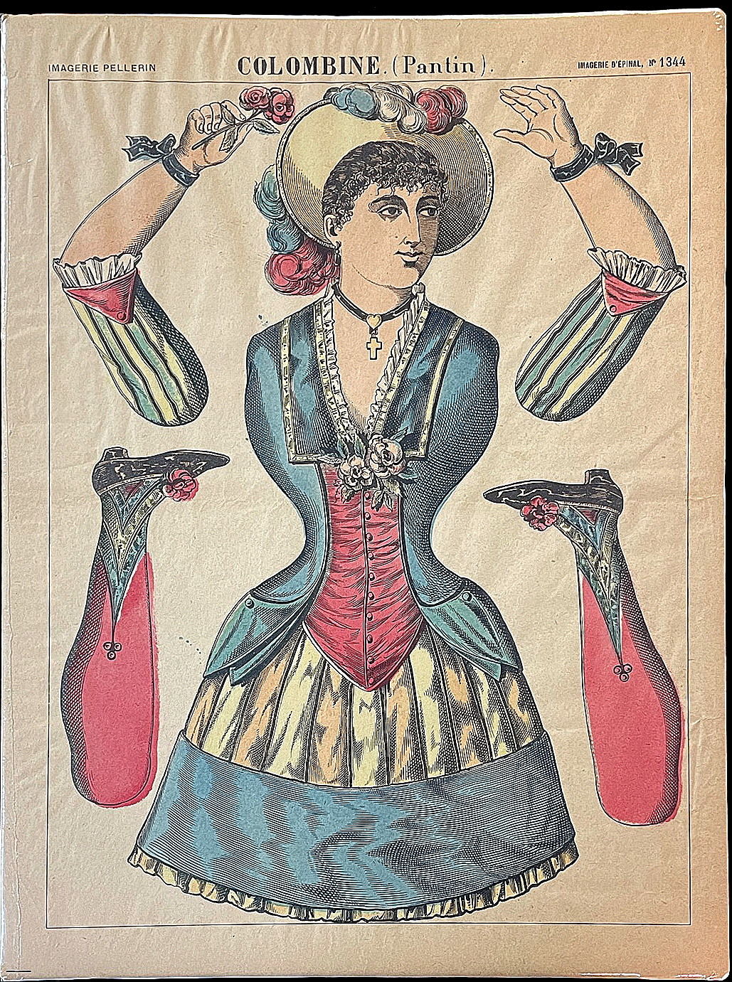 This listing is an uncut Colombine (Pantin), Imagerie Pellerin, Imagerie D'Epinal No. 1344. Published by Pellerin of Epinal, France. c 1850. The French Pantins of the 17th and 18th centuries were another form of paper doll. Usually published on sheets with six parts to each paper doll or "jumping jack" The sheets were mounted on cardboard and cut-out. The Pantins were quite popular in France in the 17th and 18th Century. Finely attired woman with plumed hat and rose.