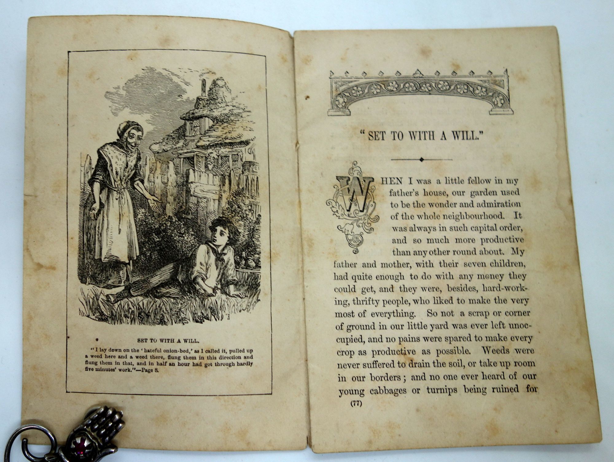 London: T. Nelson and Sons, 1861. Signs of wear on spine, discoloration on leaves and back cover.. 16 pages. Written by Catherine D. Bell under the pseudonym "Cousin Kate". Engraved frontisepiece, and decorative elements on page 4. Tan wrapper printed with red ink. Ornate decorative border includes a biblical parable and illustrations. Story of a young boy learning about the value of hard work. 4 1/2" x 3". OCLC-1 (Aug, 2018).