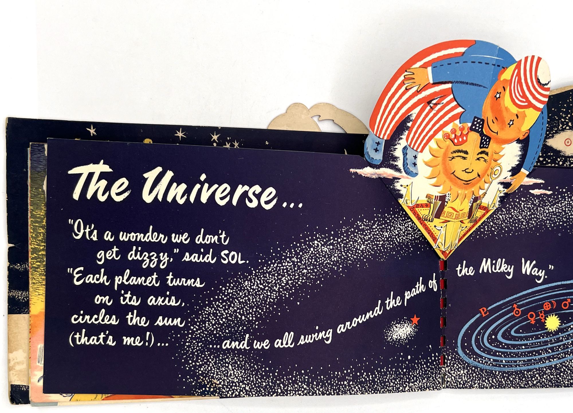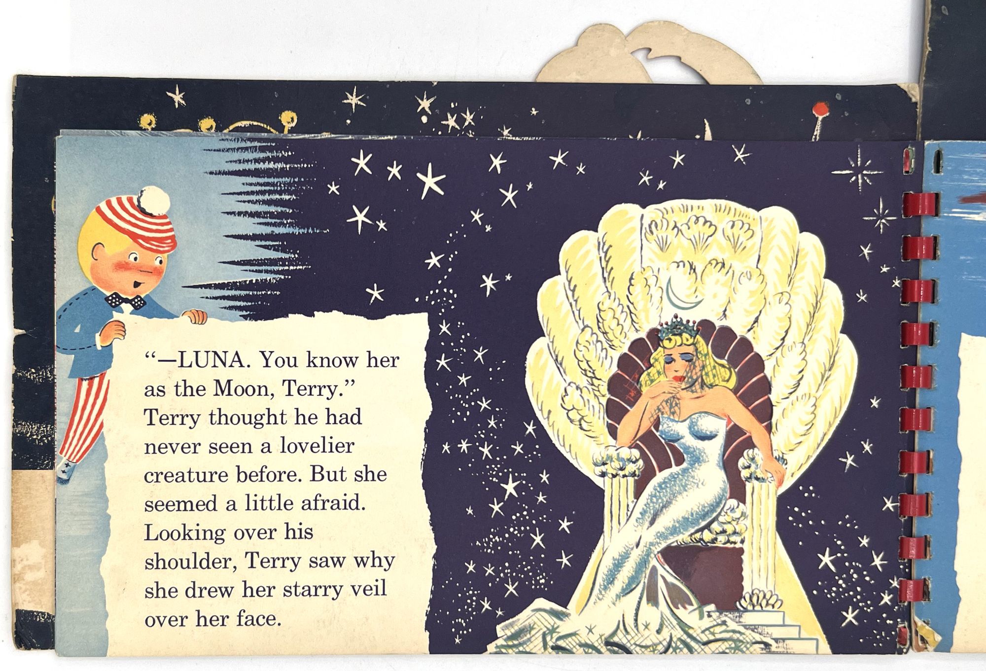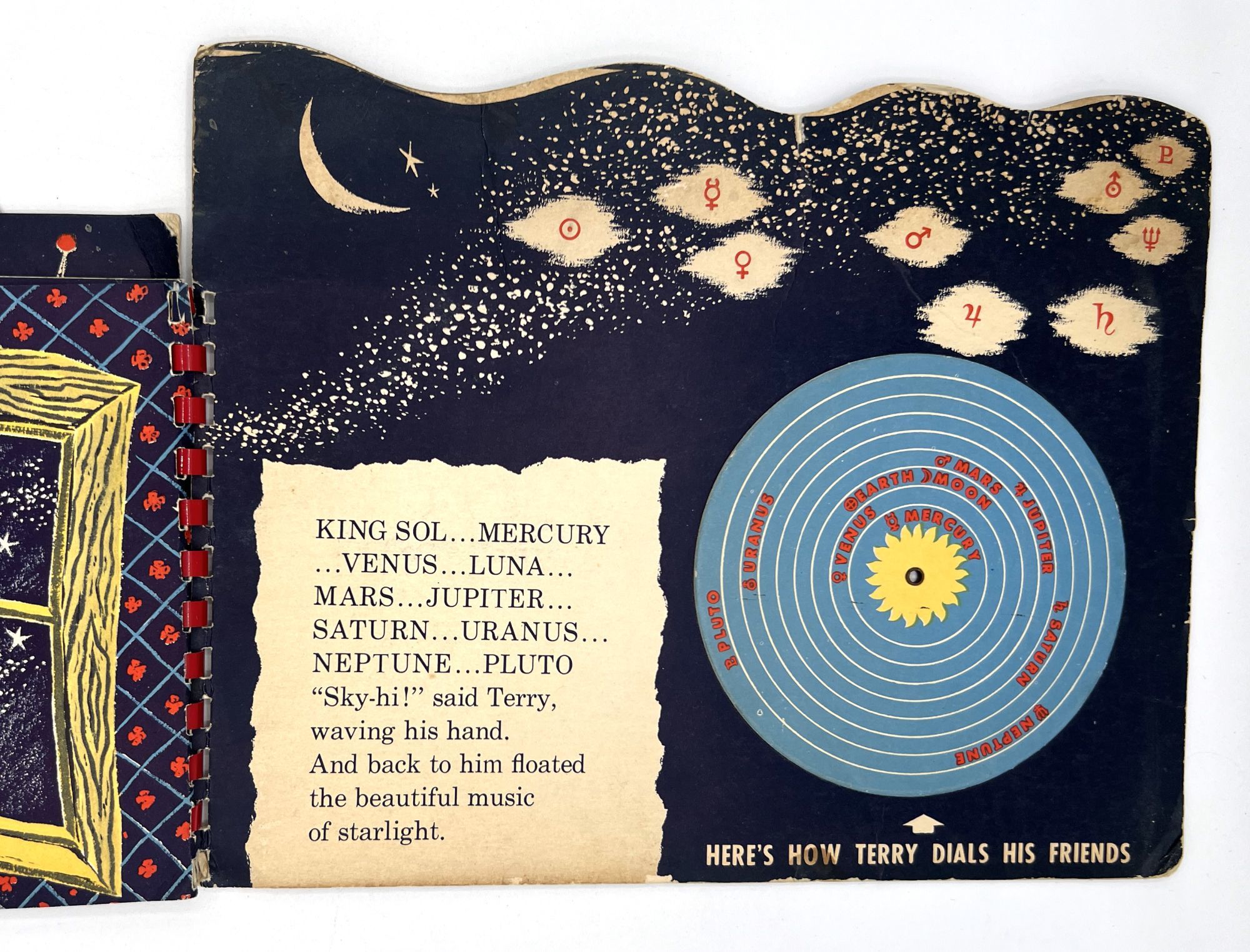 USA: Personal History Agency, inc, 1952. 4to. Unpaginated. A die-cut Terry is grommeted to front cover allowing him to tumble about space, giving the reader an introduction to Terry's trip, as he fell off the edge of dreamland and visits the universe including the pop-up sun and each of the fanciful planets in the Solar System. Includes information on the planetary symbols, the winter and summer constellations and a vovelle wheel with the positions of the planets. Educational and entertaining. Well read with general edge wear. Ink signed by previous owner front and back covers.