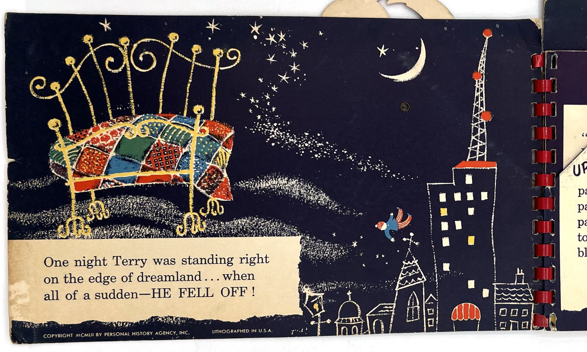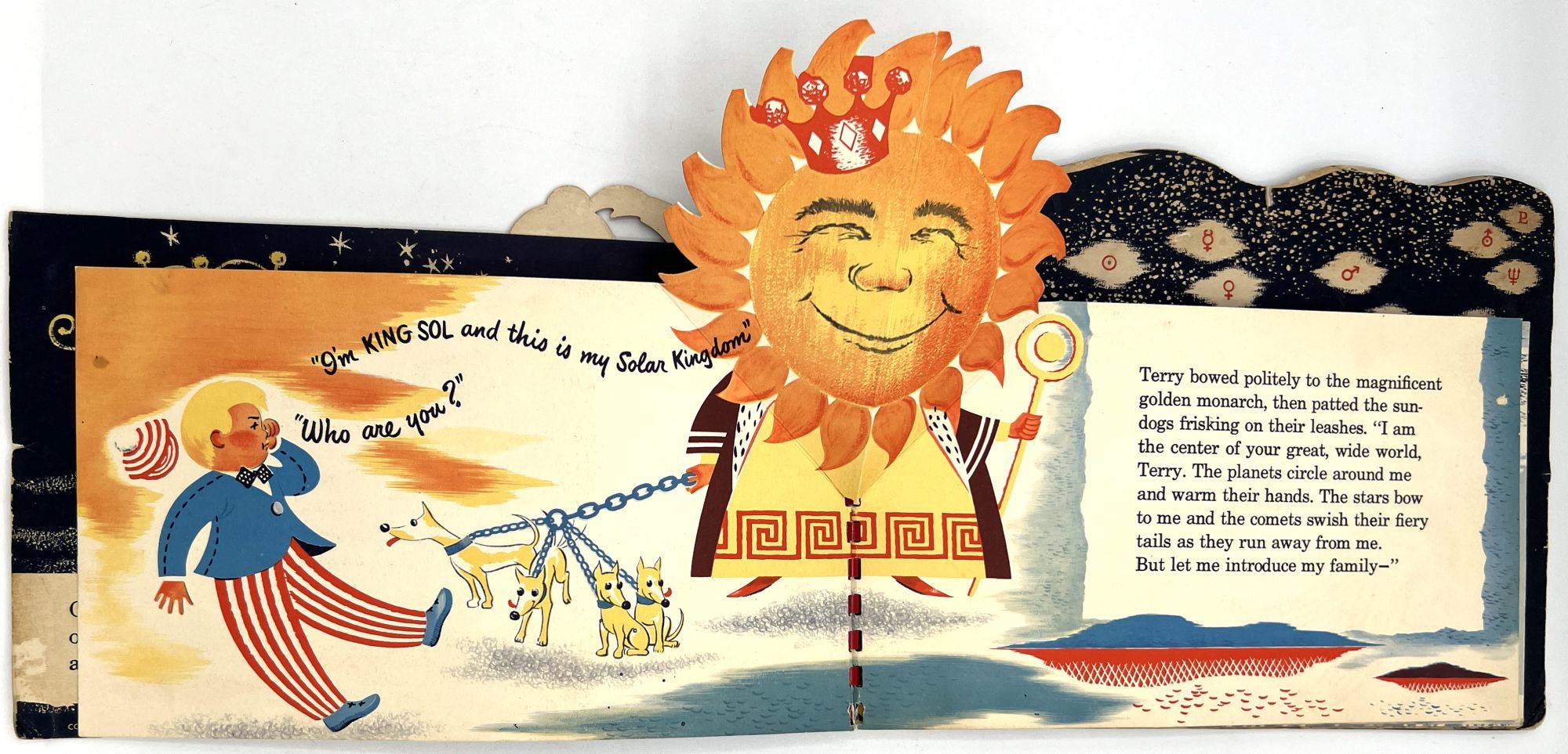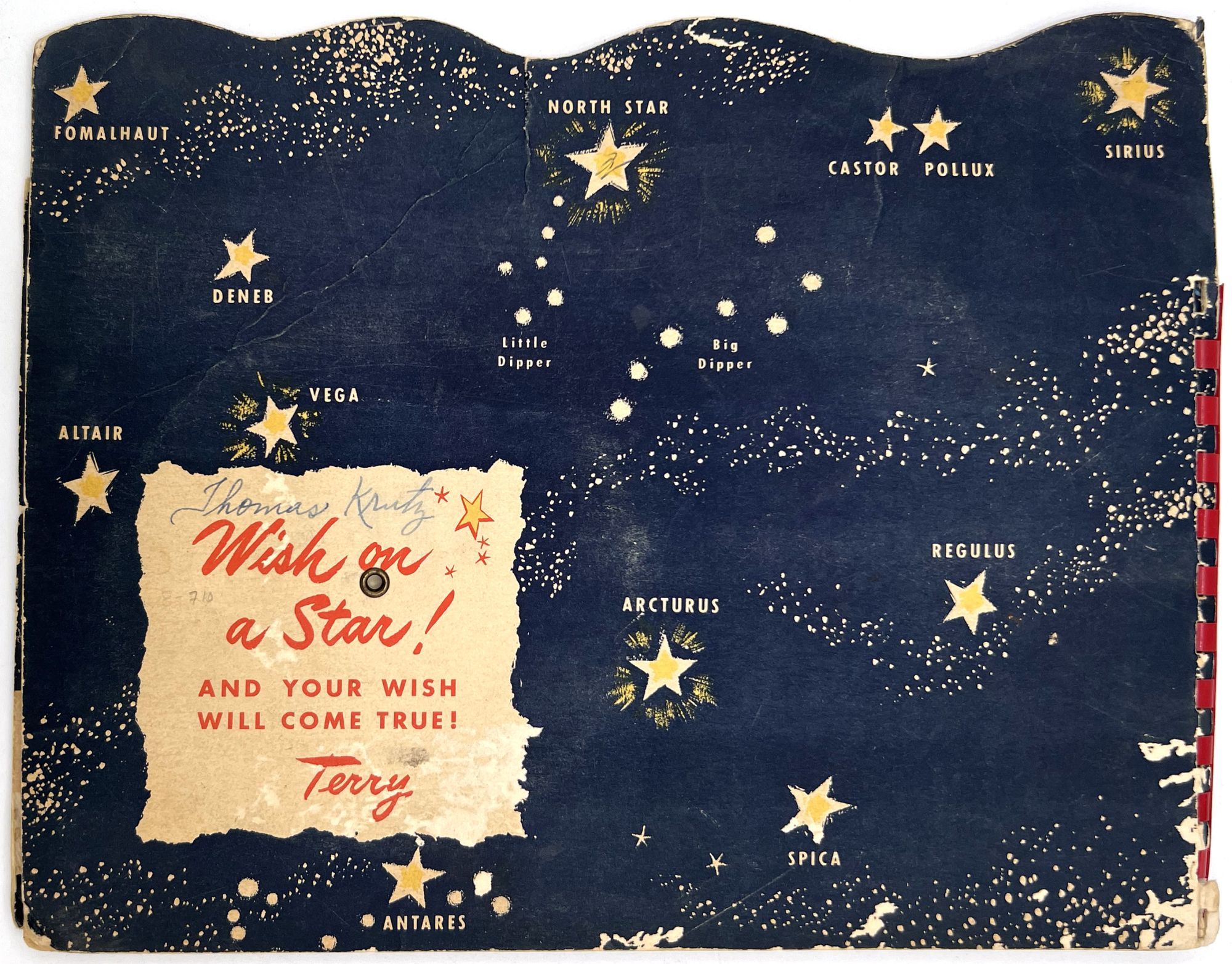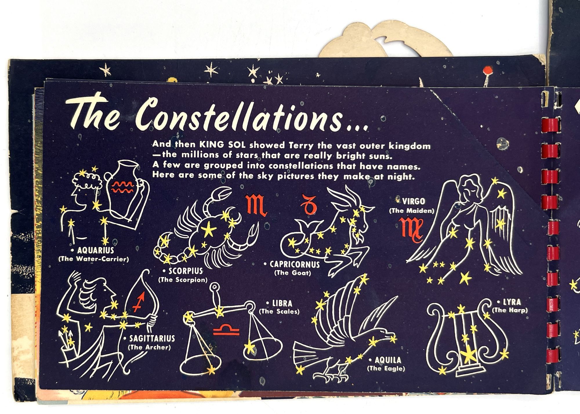 USA: Personal History Agency, inc, 1952. 4to. Unpaginated. A die-cut Terry is grommeted to front cover allowing him to tumble about space, giving the reader an introduction to Terry's trip, as he fell off the edge of dreamland and visits the universe including the pop-up sun and each of the fanciful planets in the Solar System. Includes information on the planetary symbols, the winter and summer constellations and a vovelle wheel with the positions of the planets. Educational and entertaining. Well read with general edge wear. Ink signed by previous owner front and back covers.