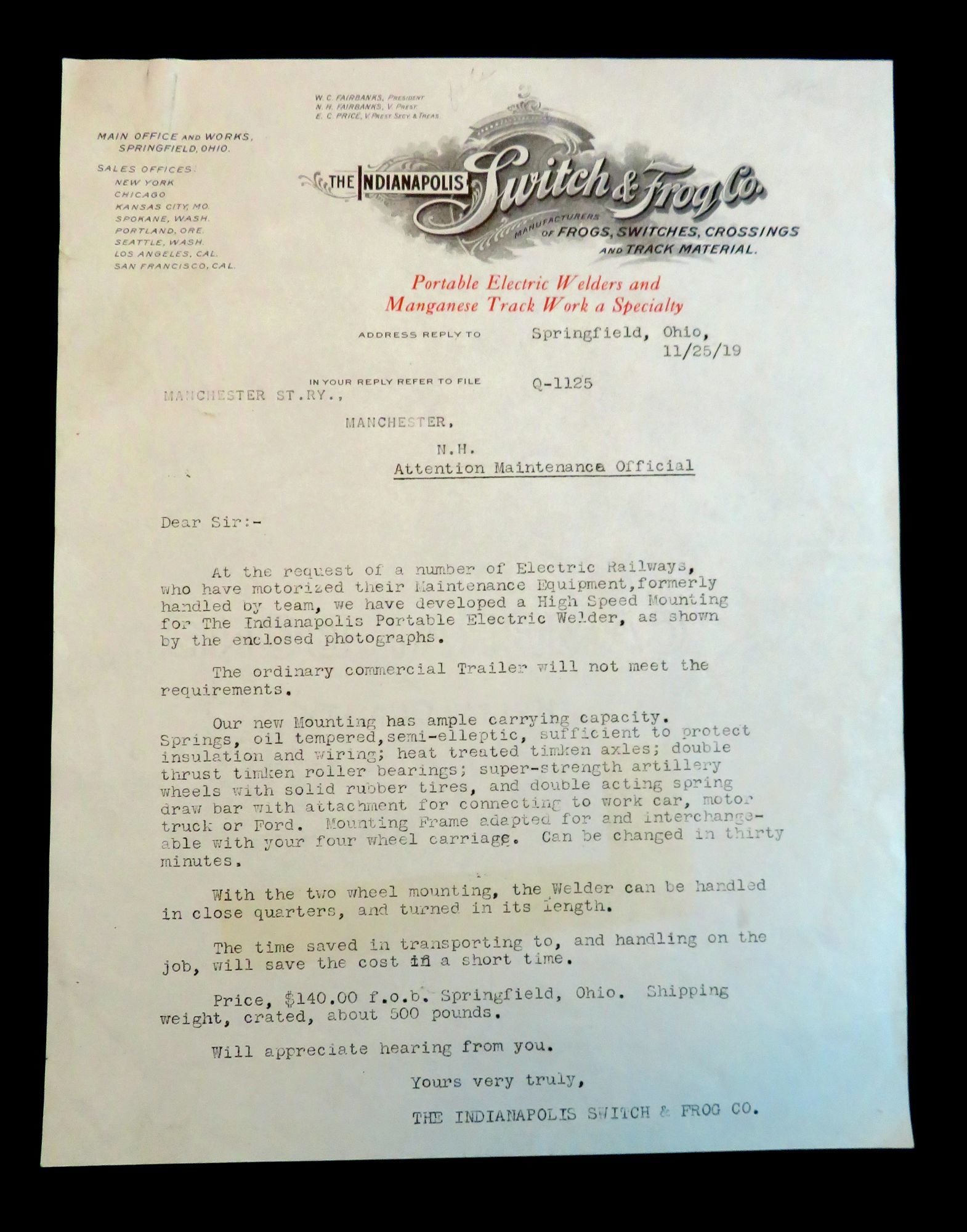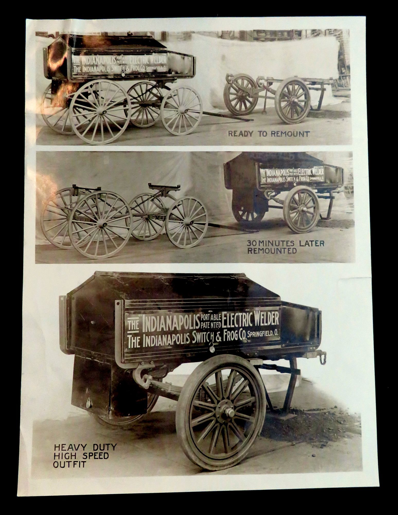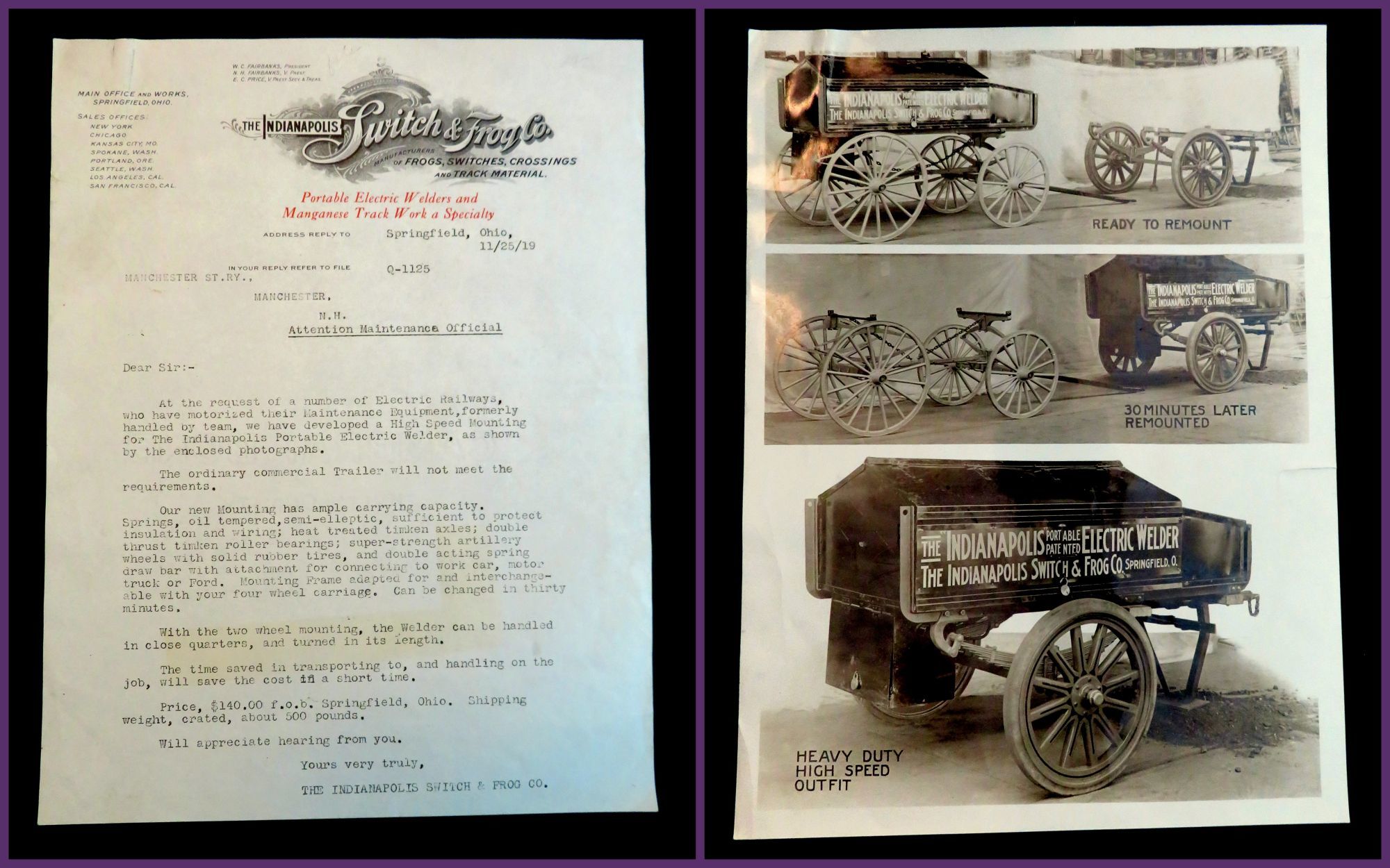The Indianapolis Switch & Frog Co, 25-Nov-19. General wear. Small cut on left edge of photograph.. A letter from the Indianapolis Switch & Frog Co. to the Maintenance Official of Manchester St. RY (Rail yard) in Manchester, NH, promoting their new high speed mounting device for their Portable Electric Welder. This 'mounting device' was essentially a new trailer for the welder to sit on. This new trailer was slimmer and went from a four wheels to two wheels. The letter itself appears to have been a generic letter send out to advertise the new device with the Manchester St. Rail Yard filled in . Accompanying the letter are three photographic images of the mounting device printed on a single sheet of photographic paper. The top photograph depicts the Portable Electric Welder on its original mounting device with the new one next to it with the caption "Ready to Remount". The middle photograph depicts the welder on its new mounting device, and the older four wheeled trailer now empty beside it with the caption "30 minutes later, Remounted". The bottom photograph is a close up of the new mounting device with the welder on it, with the caption "Heavy Duty High Speed Outfit". Measures 10 3/4" x 8 1/4" (letter), 10" x 7 1/2" (photograph).