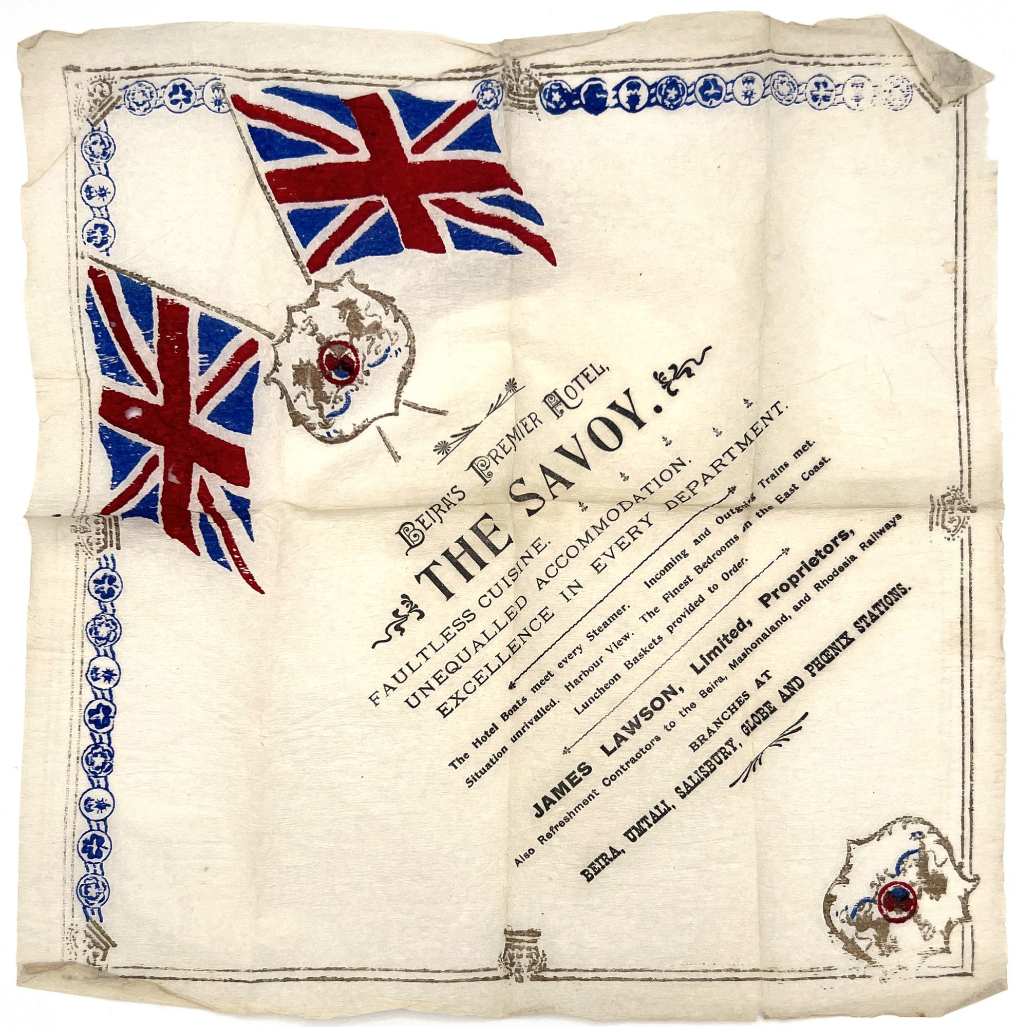 1900. A 14" x 14" crepe paper advertisement and/or napkin for Beira's Premier Hotel, The Savoy - Faultless Cuisine - Unequalled Accomodation - Excellence in Every Department. The attributes continue. James Lawson, Limited Proprietors, Also Refreshment Contractors to the Beira, Mashonaland, and Rhodesia Railways. Branches at Beira, Umtali, Salisbury, Glove and Phoenix Stations. Adorned with crossed British flags and decorative border elements. Red, white and blue. Reverse is blank. Letterfolds; otherwise fine.