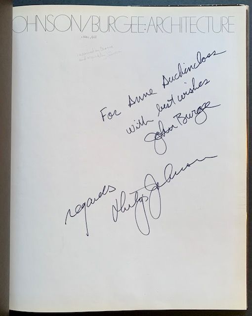 New York: Random House, 1979. Cloth. Near Fine/Very Good. INSCRIBED BY BOTH PHILIP JOHNSON AND JOHN BURGEE on the half-title. A sharp copy to boot of the 1979 stated 1st edition. Clean and Near Fine in a crisp, price-clipped, VG to VG+ dustjacket, with just a touch of light wear --and several very small closed tears-- along the panel edges. Tall quarto, rich color plates throughout.