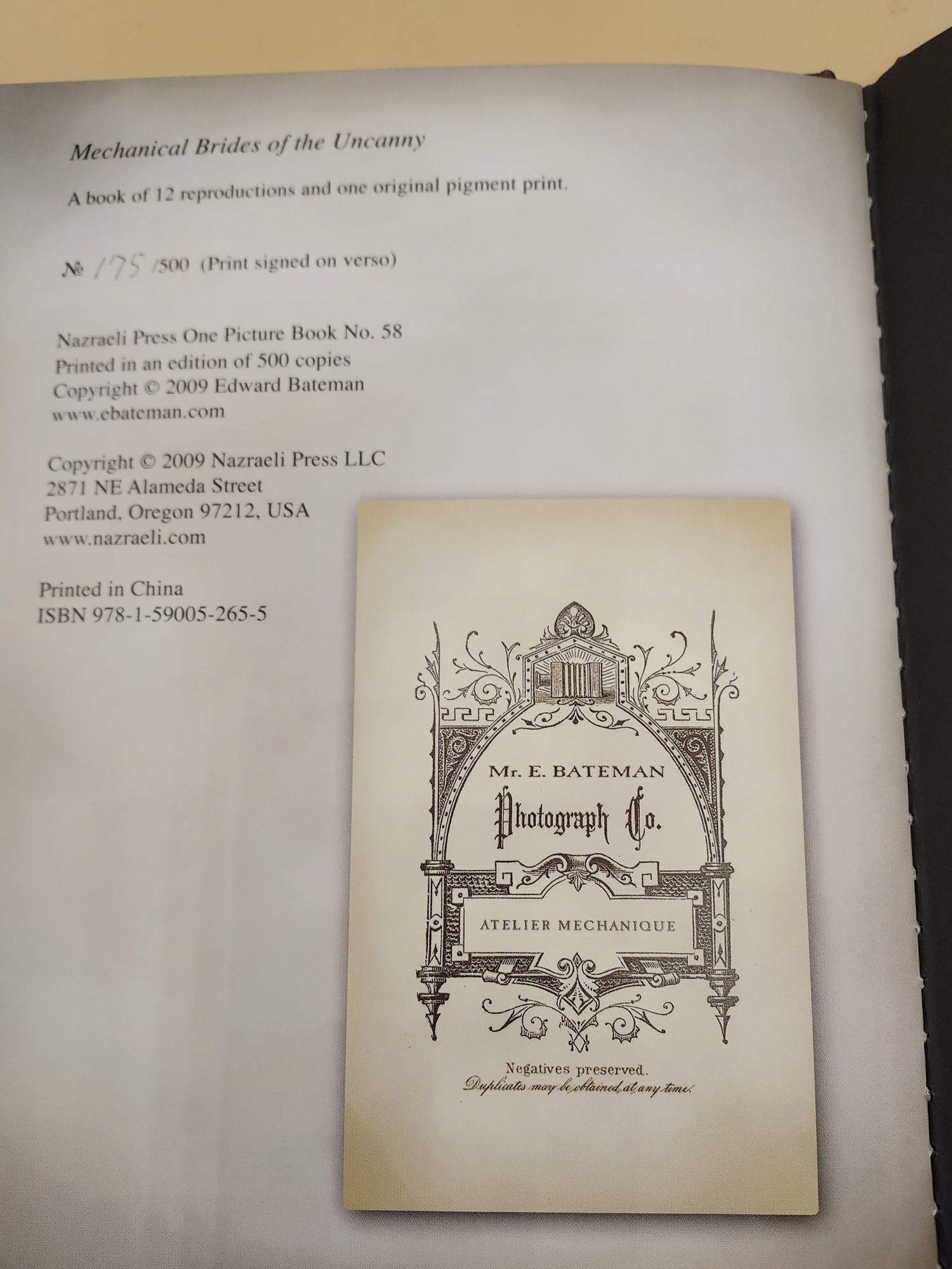 Portland,Oregon: Nazraeli Press, 2009. First edition. Hardcover. As new. Edward Bateman. SIGNED. Thin duodecimo [19 cm] Burgundy paper over boards. A book of twelve reproductions and one original pigment print by digital wizard, Edward Bateman. Nazraeli Press One Picture Book #58. The 13th plate, is laid in at the rear of the book and is signed by the artist. From the introduction..."Automatons became the next wonder of the age, and the camera turned its ever hungry gaze on them as well. This was an unprecedented development. Mankind has always looked at objects. For the first time in human history, objects were looking back. Robots (although the name would not be coined for 80 years) made excellent photographic subjects because of their ability to remain motionless for extended periods of time. And indeed, they were widely documented, although few examples remain today. Automatons became more than just sources of labor-they became companions and, following legislation passed during the upheaval of the Civil War, autonomous citizens." No. 175 in an edition limited to 500 copies.