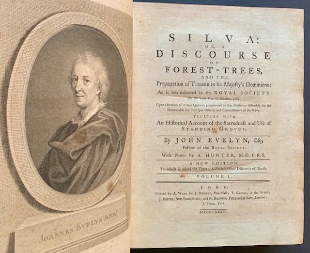 York, England: Printed by A. Ward for J. Dodsley, 1786. Full calf. Very Good +. The 1786 "new" edition. 2 volumes in 1, to which is added "The Terra: A Philosophical Discourse on Earth". With an engraved frontispiece portrait of John Evelyn by Bartolozzi, 3 folding (or double-page) tables and 4 engraved plates, including 1 folding and 1 with brown aquatint. An attractive, contemporary-to-the period full calf, with a ribbed spine and black leather title label. A handsome copy of the Hunter edition, well-preserved, very presentable and VG+ to Near Fine. With the armorial bookplate of "Charles Bodenham Esq." at the front pastedown. From the collection of the London bookseller John Chancellor of Kew Books. John Evelyn's legendary 1664 plea for reforestation (when the country was being depleted by glass factories, iron furnaces and the Royal Navy) has been credited with inspiring the planting of more than a million new trees. In fact, poet Robert Southey said "Silva" was "one of the few books in the world which completely effected what it was designed to do". (Henrey 138).