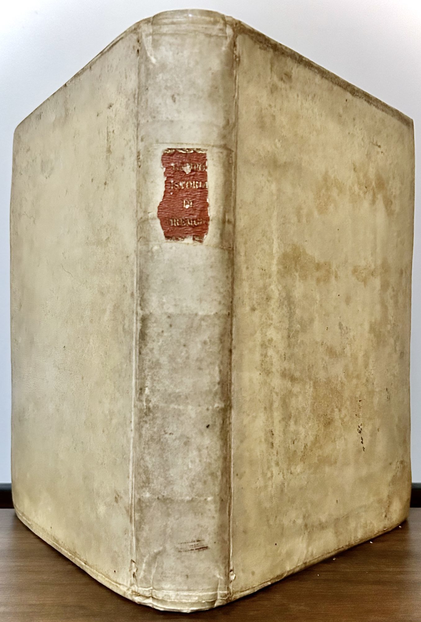 Milan: Gio. Battista Bidelli, 1645. leather_bound. Contemporary full vellum, remants of spine label. Very good. 228 (32) (a4-c4). 25.5 x 19 cm. Two parts in one volume. Engraved title by Blanc, portrait of the author on front leaf. Folded map of Cremona, folded plan map dated 1583, six engravings on four folded plates of Cremona Cathedral, the Torrazzo. Magnificently illustrated history of Cremona, one of the most beautiful illustrated books of the late Cinquecento. The work, divided in four books, contains the history of Cremona chronologically organized from the foundation by the Romans up to 1585. A fifth book, devoted to the description of the Cathedral and other churches, announced by the author was never published. The book is illustrated by 33 medallion portraits of Cremona prominent citizens and the dukes and duchesses of Milan by Agostino Carracci; many of the accompanying letterpress descriptions include a note as to the source of the image, including on page 104 a now lost portrait of Massimiliano Sforza by Leonardo da Vinci. First edition published 1585. ADAMS. C 489. BRUNET Vol 1, pt2. p.1526. "Un tres-bel exampl." CHOIX OLSCHKI IV. 425. CICOGNARA 397. MORTIMER ITALIAN. 100. Inner gutters with some soiling, closed tears to plate one and final leaf.