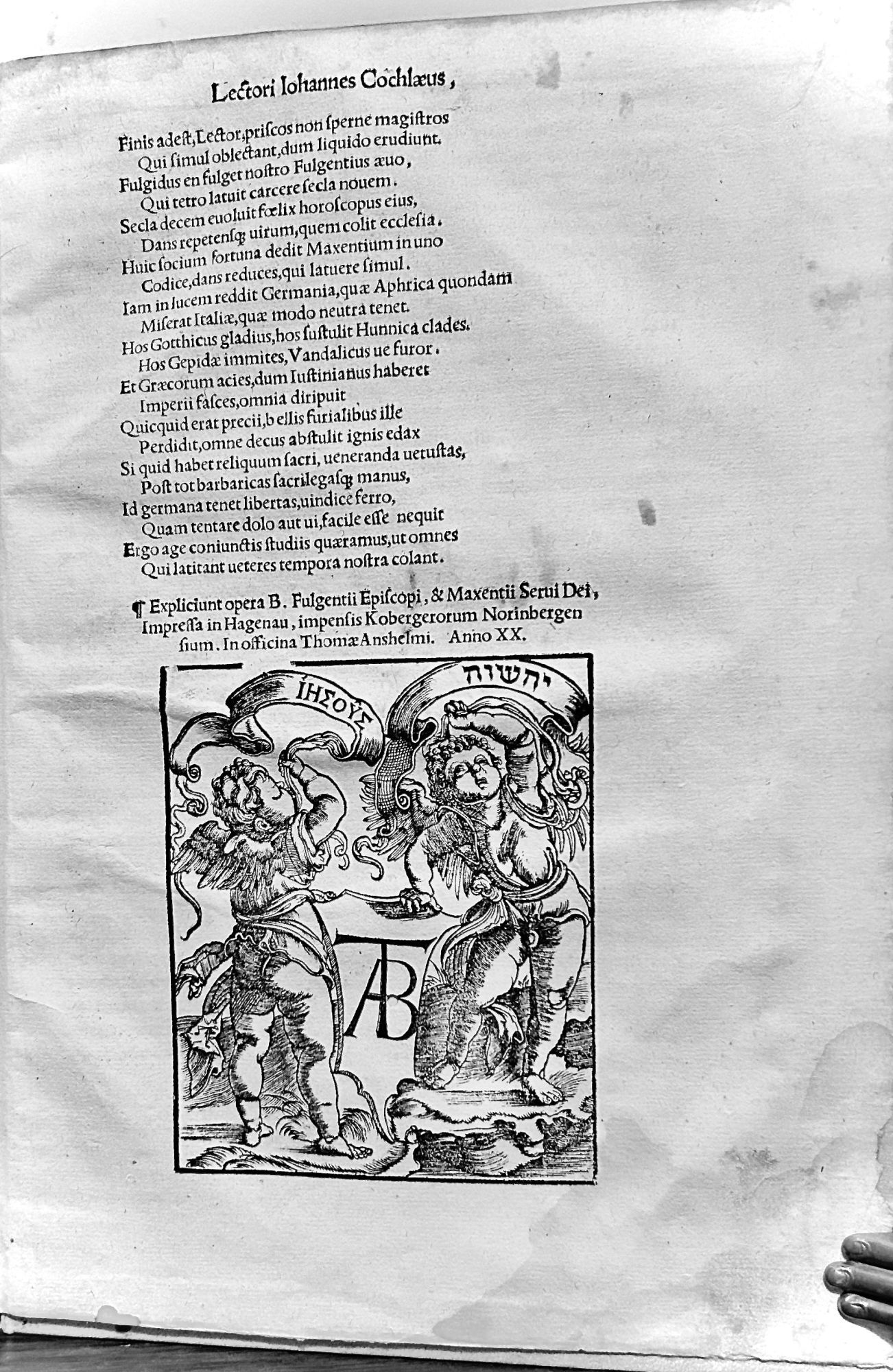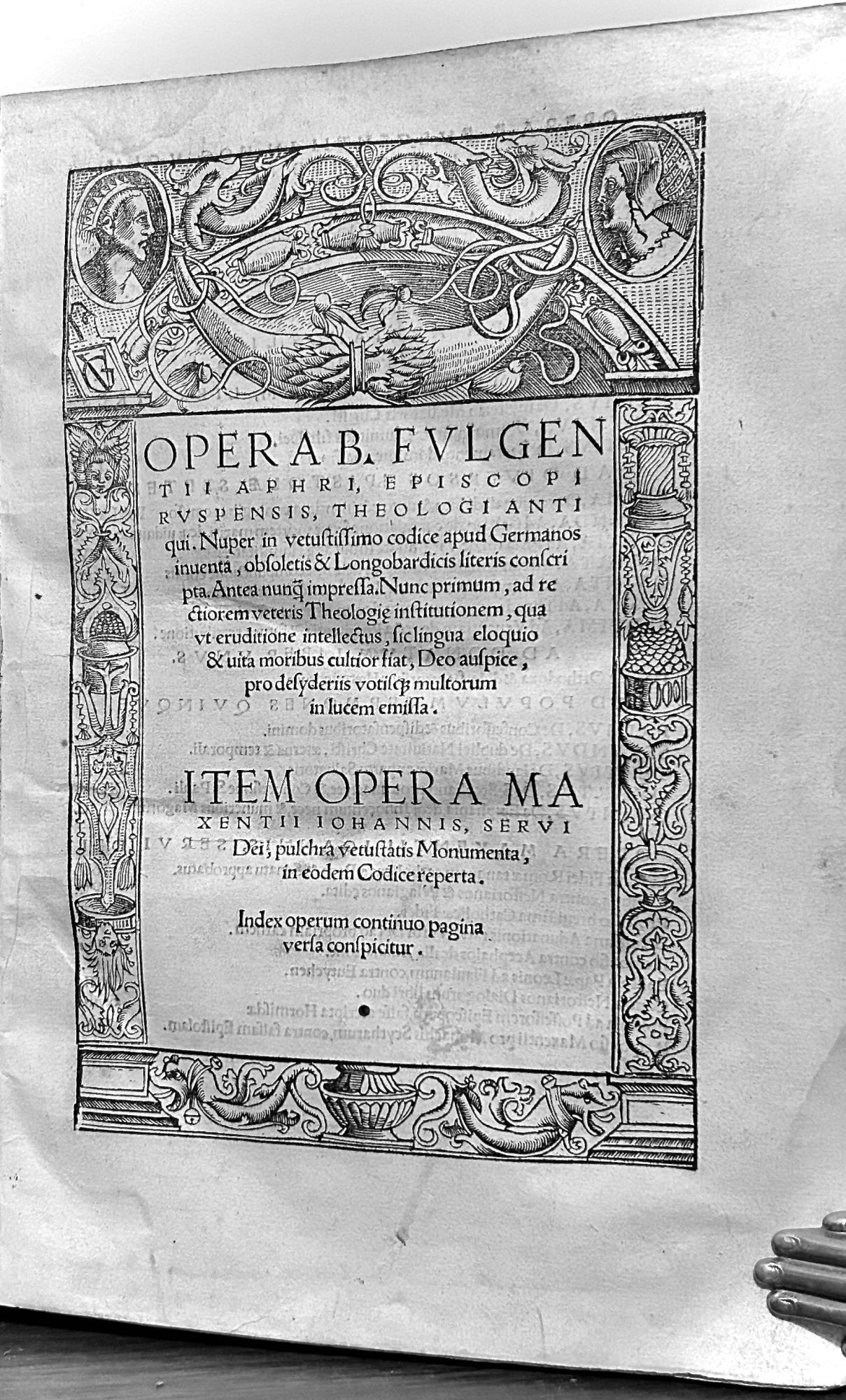 Heganau: Thomas Anshelm for Johann Koberger, 1520. First edition. leather_bound. Later full vellum. Very good. 102 leaves (35 leaves) (1 leaf). Folio, 29.5 x 22 cm. General and diviinional titles within woodcut borders. The author, born in modern day Tunisia in 462. He became a monk writing works to help instruct the Chrisitans of Africa. As bishop of Ruspe in Tunisia he was later banished to Sardinia in 520 after complaints from the local Arian clergy. The editor, a German humanist and a leading Roman Catholic was an opponent of Martin Luther. Cochlaeus’ early sympathy with Luther changed ca. 1520 into unremitting criticism. As adviser to papal nuncios and other ecclesiastical and secular dignitaries, he was prominent at several assemblies that strove to mend the religious split. Cochlaeus ranked among the most zealous theologians of his time, completely dedicated to his cause. His best known work was "Acts and Writings of Luther" (1549). Lower right corner stained, mostly marginal, contemporary ink marginalia. ADAMS F1136. OCLC: 837238277.