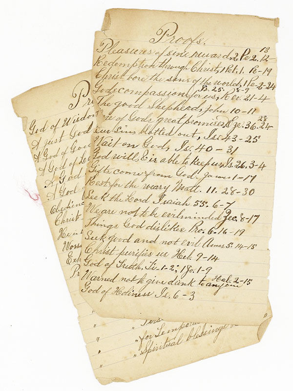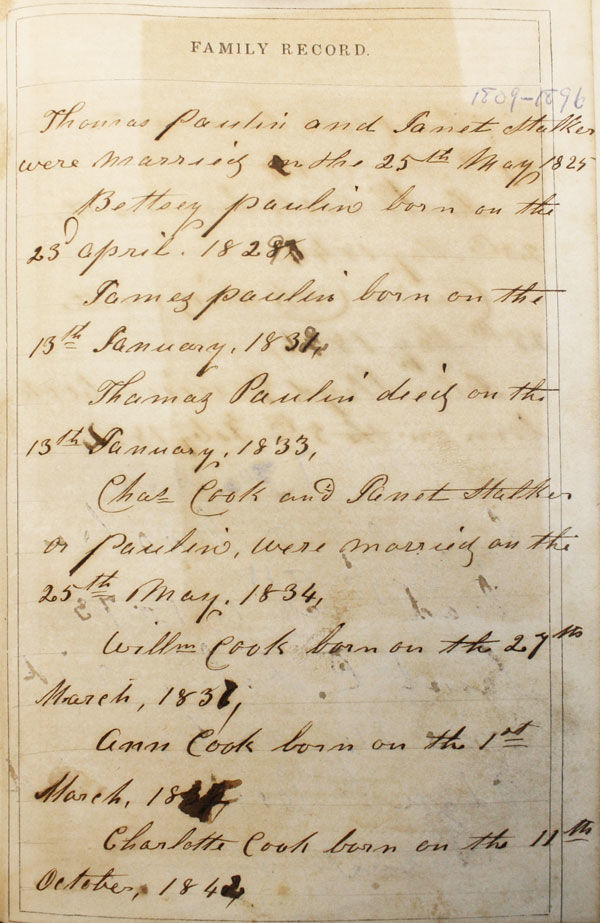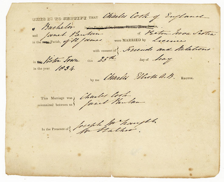 Bible and "book of ages" of the Captain Charles (1811-1873) and Janet (1809-1896) Cook[e] family. Family Record leaves at the end of the Old Testament filled nearly to completion by four generations of the family, from 1825 to 1954. Additionally laid in are the two marriage certificates, accomplished in manuscript, of Janet Cook, mère, the first dated 1825, to a Thomas Parton (?), the second, in 1834, to Charles. All told Janet would have nine children, two by her first husband, seven by her second. Also laid in: three pages on two leaves of slightly earlier manuscript holograph Bible quotes; and four newsclipped obituaries, of Janet and her children Annie and William, the last of an Elizabeth McIntosh, possibly Janet's great-granddaughter. Though American family bibles are not a huge scarcity, it is rather uncommon to find them kept so diligently over the course of four generations.