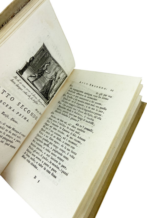 Venezia: Presso Antonio Zattae Figli, 1791. Very Good. Venezia: Presso Antonio Zattae Figli, 1791. First Edition. Small octavo (16cm.); later period-style parchment, two olive gilt-lettered morocco spine onlays, speckled endpapers; [8],196 [but 296]pp. ([*]4 A-S8 T4); steel engraved medallion to title page, fifteen engraved scenes printed in text throughout. Light wear to extremities, chiefly at corners, else a Very Good to Near Fine, superlatively fresh copy. Contents include three plays, among them Apostolo Zeno's comic dramatization "Don Chischiotte in Corte Della Duchessa."