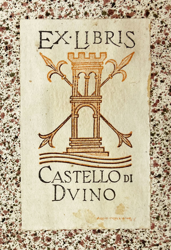 Provenance: Early 20th century ex libris of the Castello de Duino, the fourteenth-century fortification situated on the cliffs overlooking the Gulf of Trieste. By the late 19th century the Castle was home to Prince Alexander von Thurn und Taxis and his wife Princess Marie, who transformed the grounds into something of an artists' retreat where Rainer Maria Rilke penned his "Duino Elegies" in 1912. The contents of the Castle were auctioned off in 1997 and the grounds opened to the public.