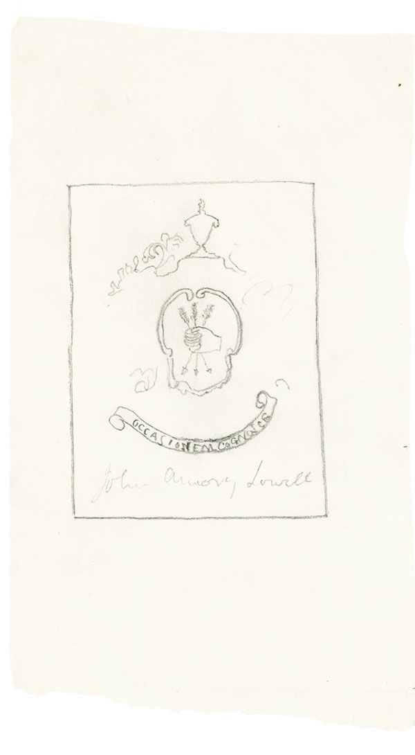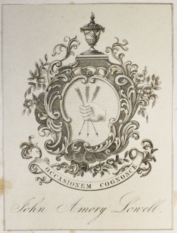 Provenance: Contemporary engraved armorial ownership bookplate of Boston Brahmin businessman John Amory Lowell (1798-1881) featuring his coat of arms: the rather felangist hand holding three downwardly pointing arrows, the traditional stag's head replaced by an urn, and the Latin "Occasionem Cognosce." Laid in is a pencil sketch on onionskin of the bookplate, though possibly a sketch made by the later owner, John Lowell, Jr., whose 1946 ownership inscription is on the front free endpaper.