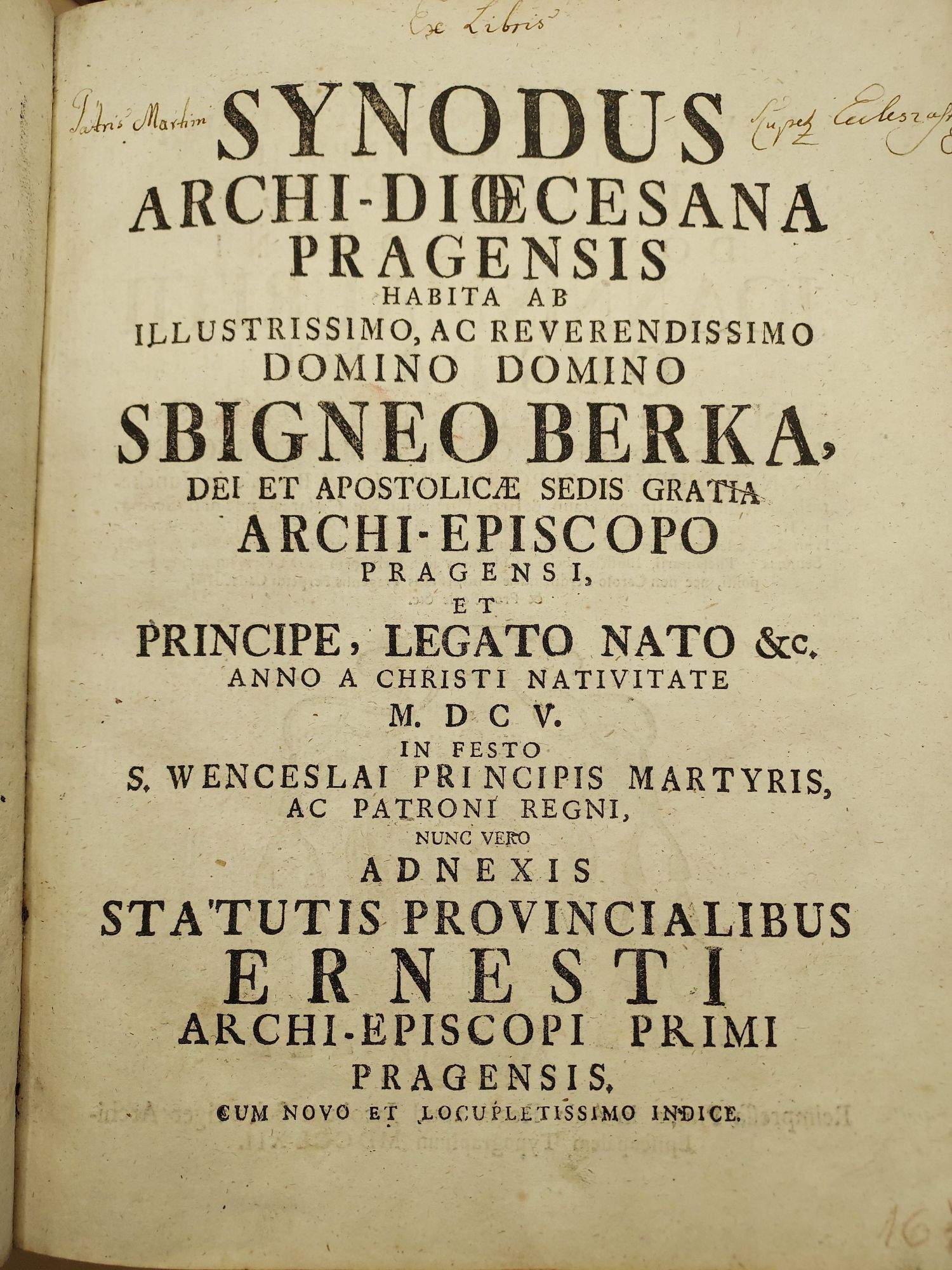 Synodus Archi-Dioecesana Pragensis Habita Ab Illustrissimo, Ac Reverendissimo Domino Domino Sbigneo Berka, Dei Et Apostolicæ Sedis Gratia Archi-Episcopo Pragensi, Principe, Legato Nato &c. Anno A Christi Nativitate M.DCV. In Festo S. Wenceslai Principis Martyris, Ac Patroni Regni, Nunc Vero Adnexis Sta 'Tutis Provincialibus Ernesti Archi-Episcopi Primi Pragensis. Cum Novo Et Locupletissimo Indice [Catholic Church]