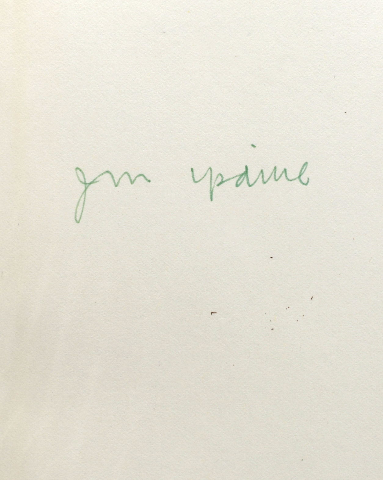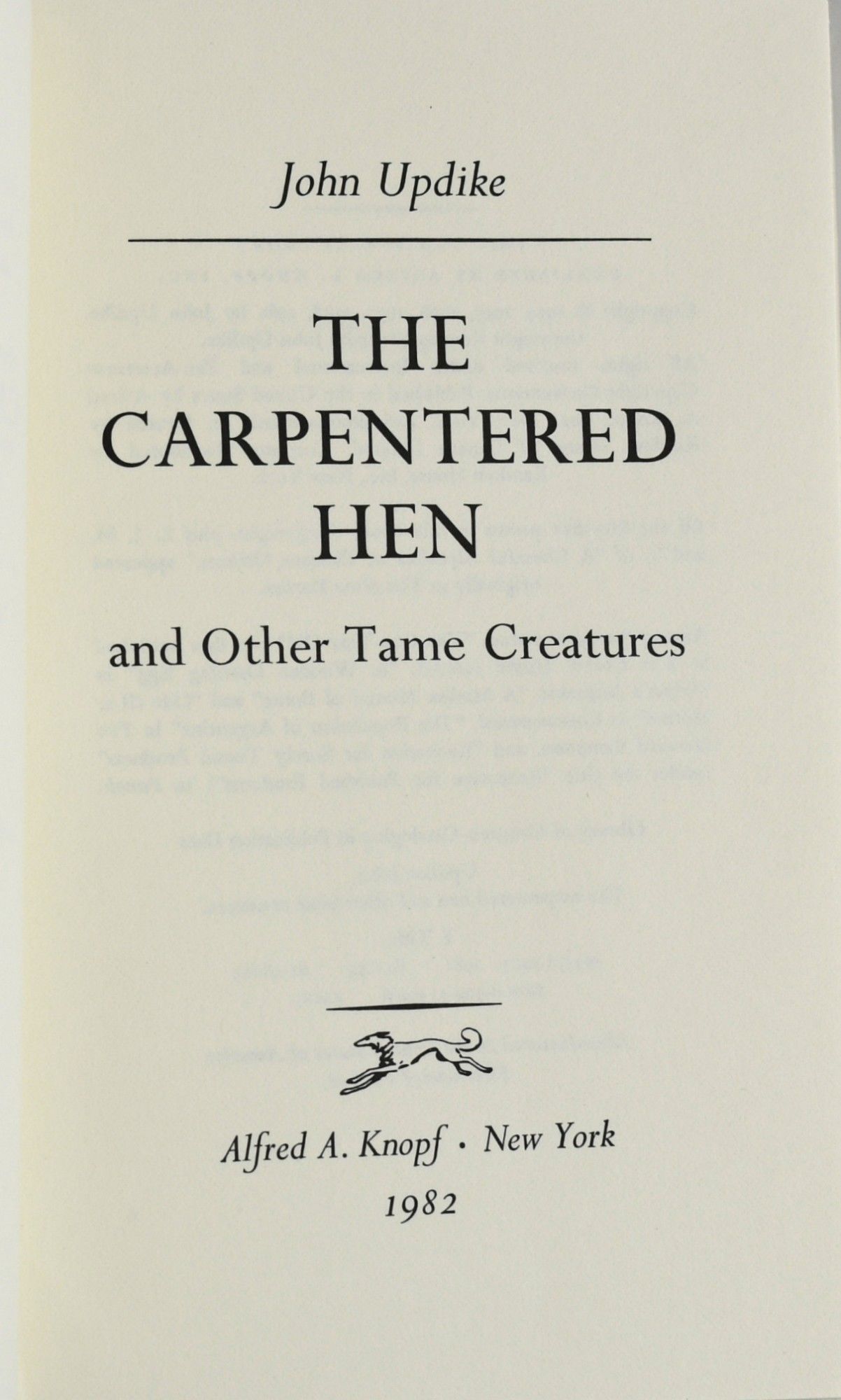 New York: Alfred A. Knopf, 1982. Reprint Edition. Near Fine binding/Near Fine dust jacket. 8vo.; in the publisher's burgundy cloth with titling in gold, and with dustjacket; xvii, [2], 3-84 pages; there is a very faint erasure mark on the endpaper; this copy is signed by John Updike (in green ink?) on the endpaper; the dustjacket has the merest trace of sunning to the spine; it has not been price-clipped.~~This is the First Knopf Edition, a re-issue of Mr. Updike first published book, originally publihsed in 1958.~~An attractive signed copy of the first printing of the re-issue. Near Fine binding / Near Fine dust jacket.