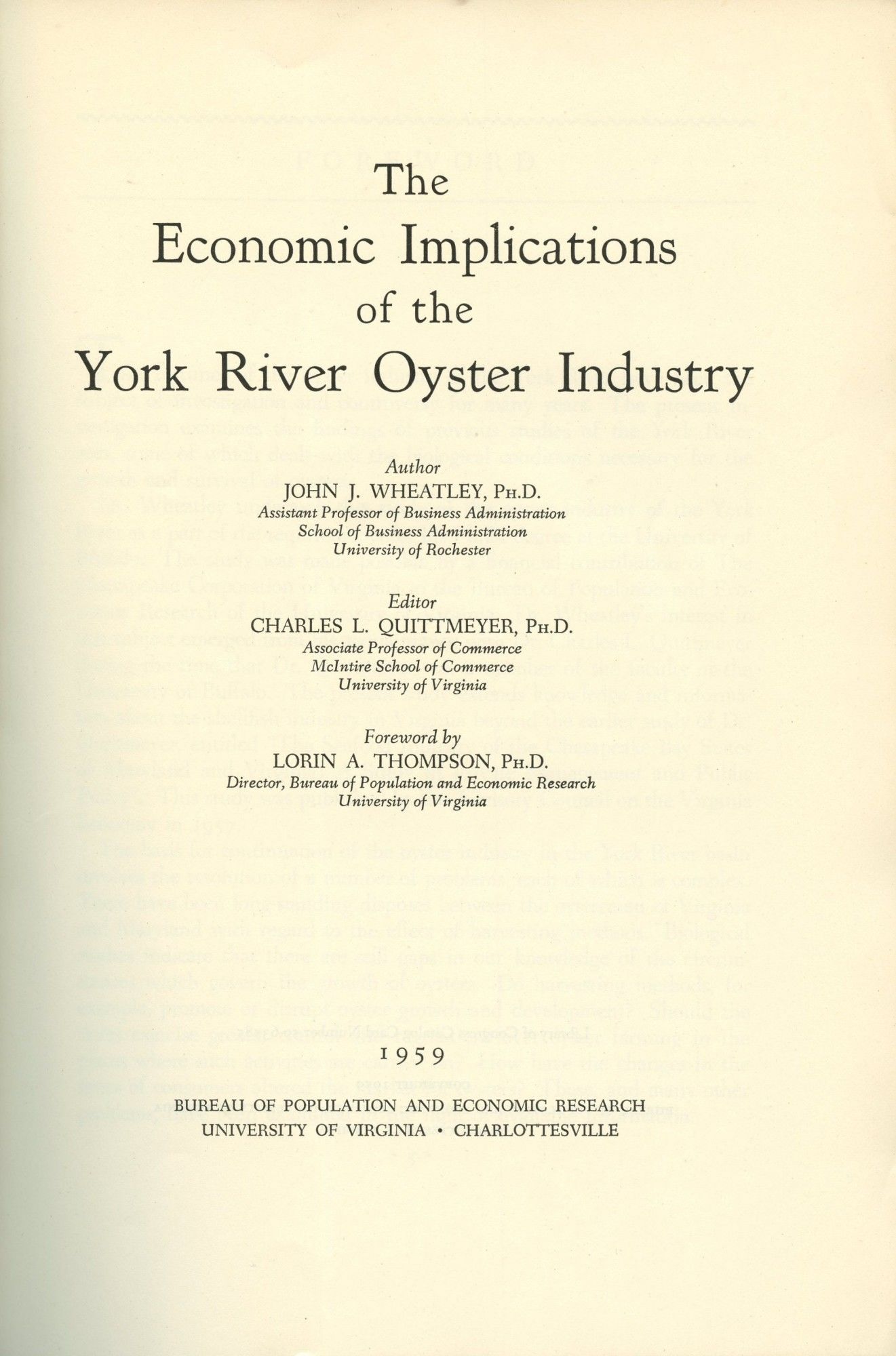 [VIRGINIA] [MARITIME] THE ECONOMIC IMPLICATIONS OF THE YORK RIVER OYSTER INDUSTRY