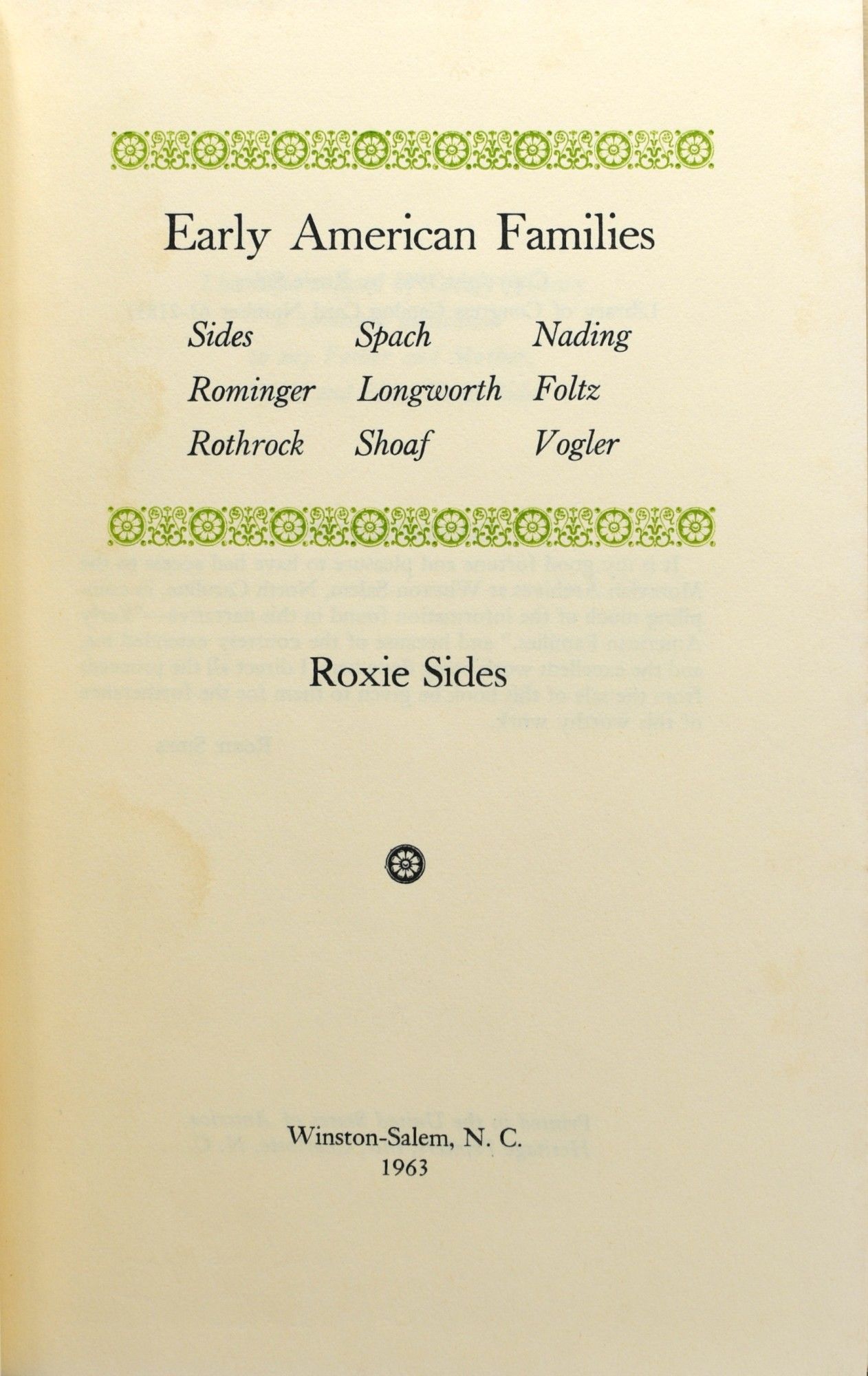 [SIGNED] [GENEALOGY] EARLY AMERICAN FAMILIES: SIDES, SPACH, NADING, ROMINGER, LONGWORTH, FOLTZ, ROTHROCK, SHOAF, VOGLER