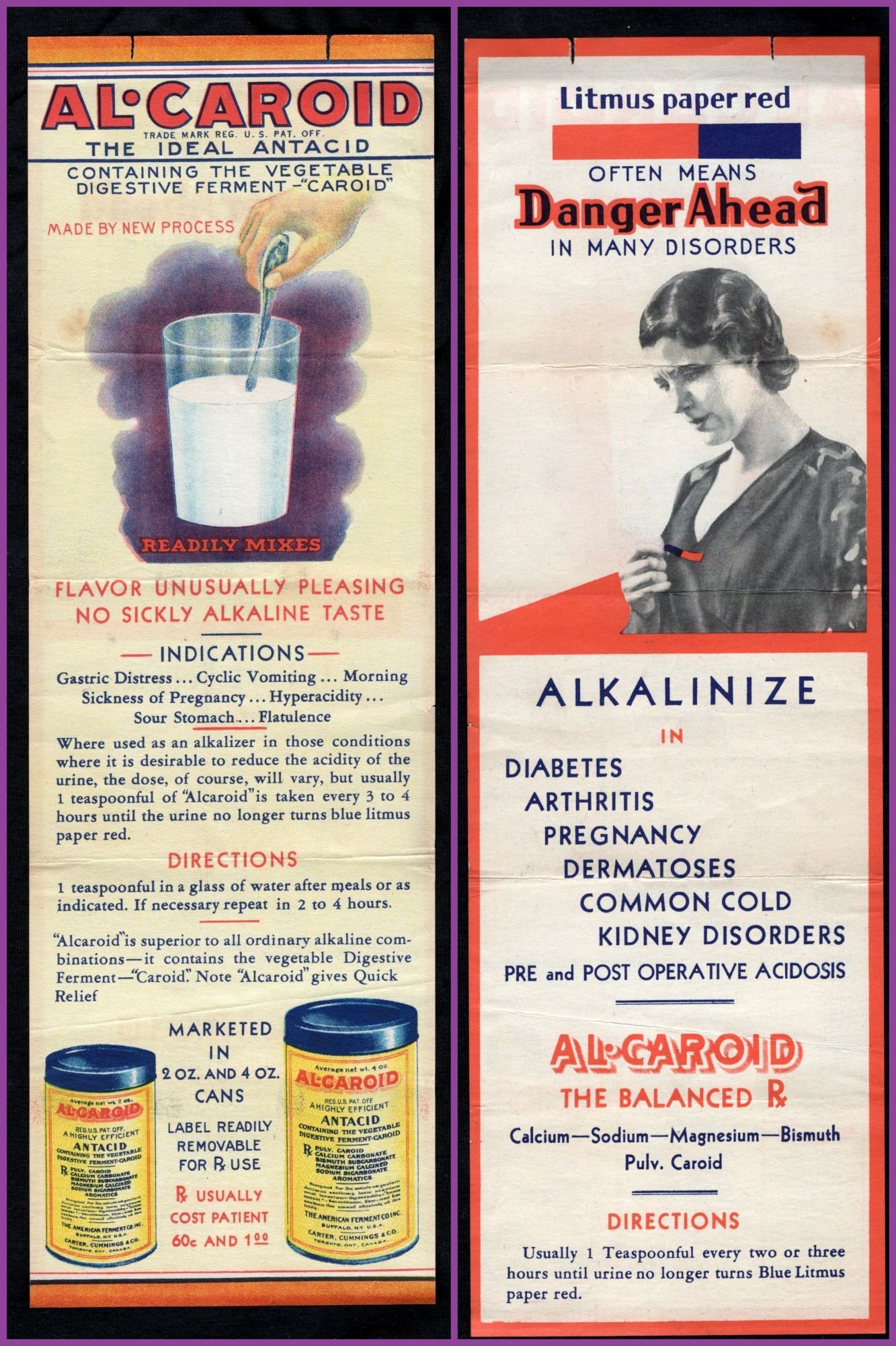 Toronto, Canada: Carter, Cummings, & Co, 1920. General wear. Crease folds.. An advertisement for Al-Caroid, which was an antacid containing the vegetable digestive ferment caroid. One side of the ad has a color illustration depicting the antacid being mixed into a class of water, with the caption "flavor unusually pleasing, no sickly alkaline taste". The mediation supposedly helped with gastric distress, cyclic vomiting, morning sickness, hyperacidity, sour stomach, and flatulence. At the base of the ad are instructions for use and two color illustrations of the antacid in a cans. The other side of the ad depicts a women in black & white, and states "Litmus paper red often means Danger Ahead in many disorders." The ad was asking women to check the PH of their urine using litmus paper, and if it turned red, it might be caused by or a sign of "diabetes, arthritis, pregnancy, dermatoses, common cold, kidney disorders, or pre and post operative acidosis." In order to fix this one could take a teaspoon every two or three hours until the litmus paper was no longer turning red in one's urine. Single page, double sided. Measures 10 3/4" by 3 1/2