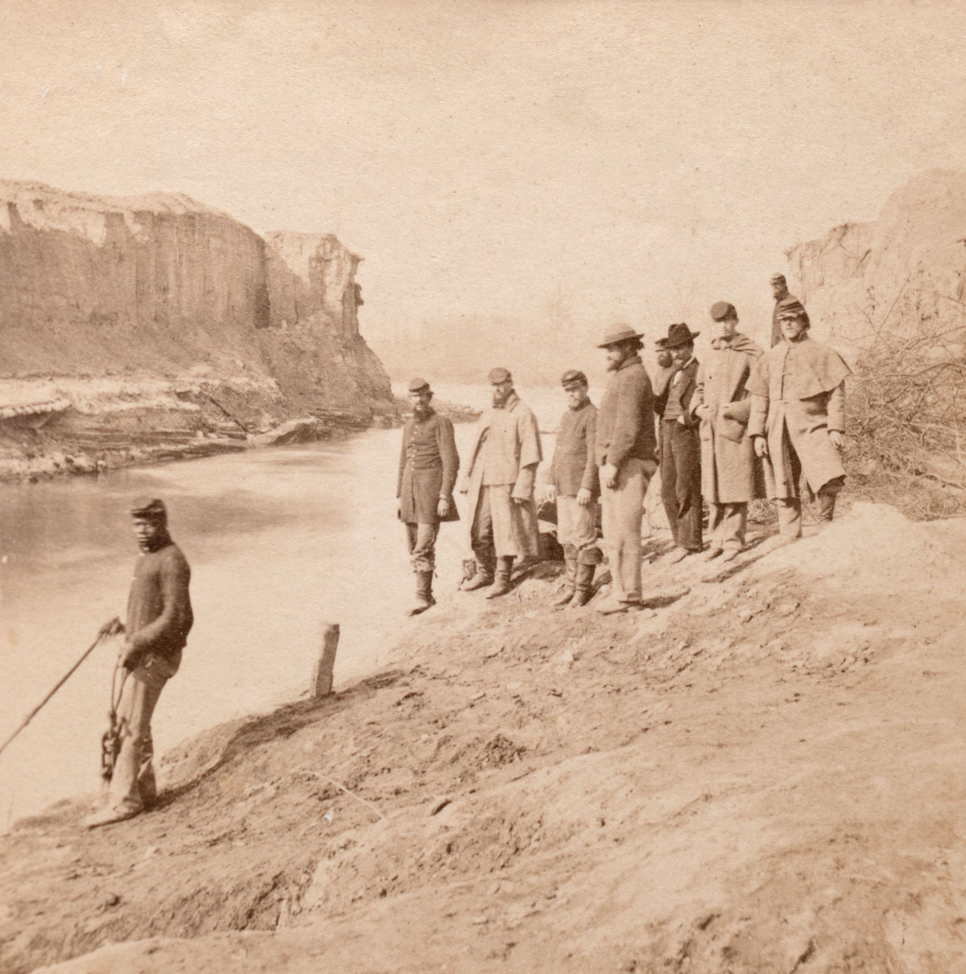 1865. Unmounted albumen half stereoview. 3-1/16 inches square. Unmounted albumen half stereoview. 3-1/16 inches square. Located on the James River in Chesterfield County, Virginia, the canal's 1864-65 construction was initiated by Union forces during the American Civil War to bypass a meander loop of the river around a peninsula known as Farrar's Island which was controlled by Confederate artillery. Miller reproduces this image his Photographic History of the Civil War (vol. 5, page 243), noting: "The excavation was forty-three yards wide at the top, twenty-seven at the water level ... The total excavation was nearly 67,000 cubic yards. The greater portion of the digging was done by colored troops who showed the utmost bravery under the constant fire of the Confederate batteries on the river.