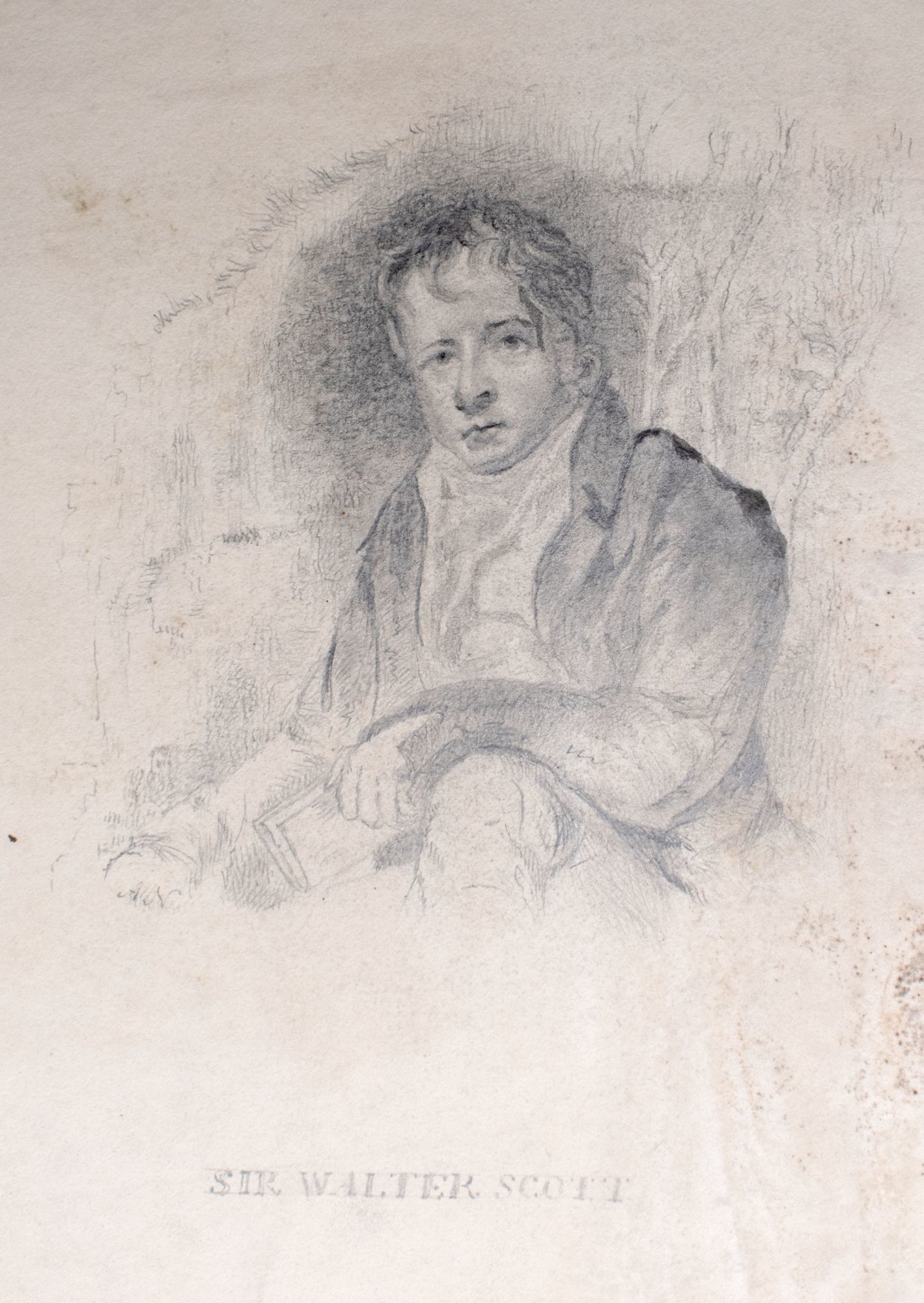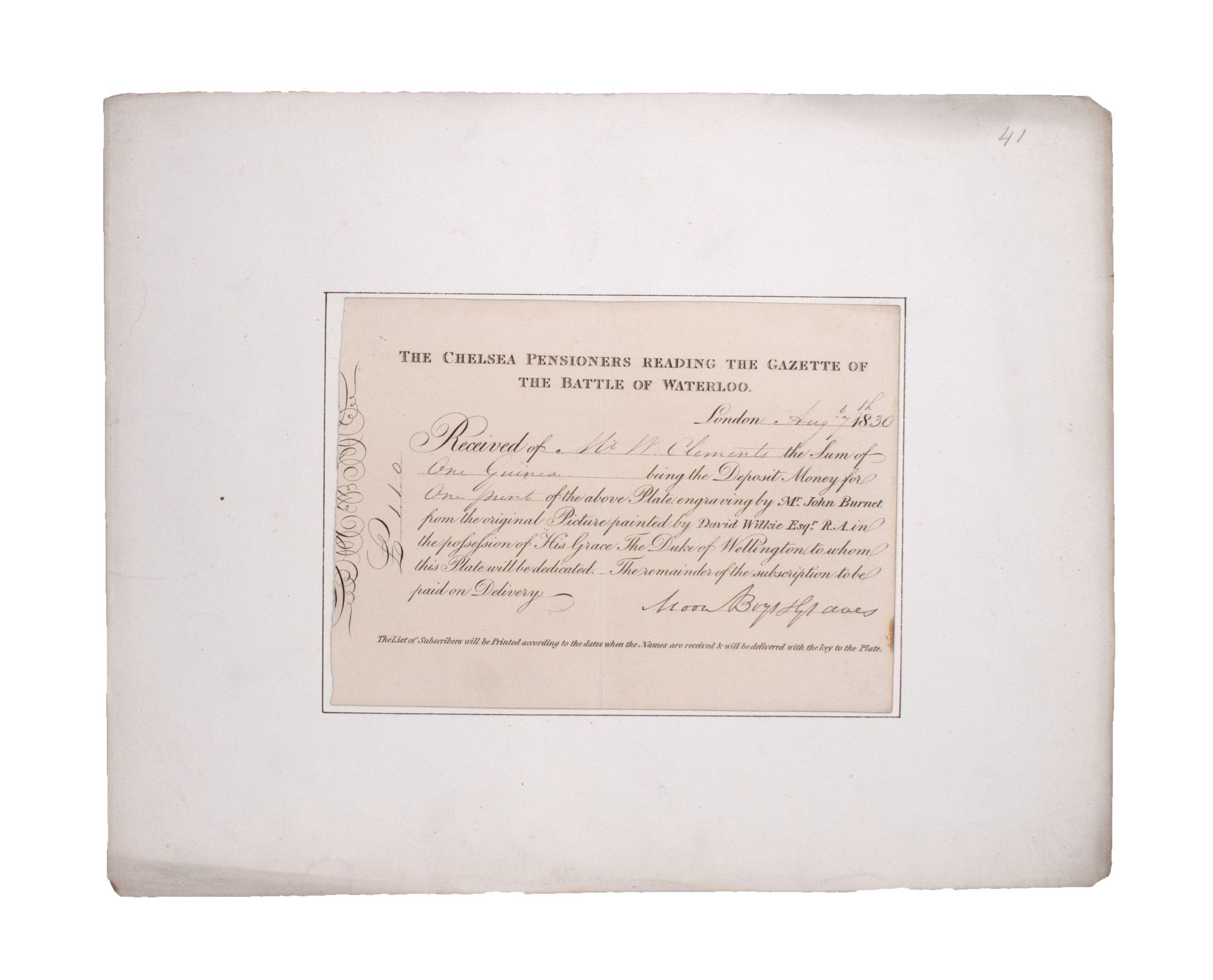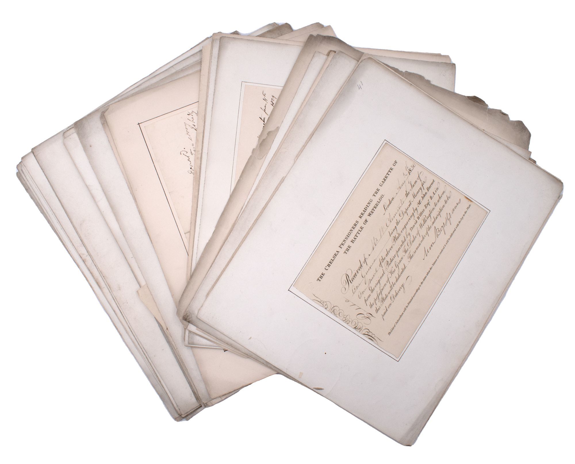 Also included is a pencil drawing of Sir Walter Scott (Wilkie painted 'The Abbotsford Family' in 1817 after visiting Scott, which incorporates Scott's family, friend, and dogs into a group portrait with Scott at the center); 11 lithographic prints; a selection of 13 plates with accompanying pages taken from the posthumous 'The Wilkie Gallery' ca. 1845; an announcement for 'John Knox Administering The Sacrament' engraved by J. Talfourd Smyth, from the unfinished picture by Sir David Wilkie, R.A.; a ticket to a lecture at the Royal Academy London, with Wilkie's manuscript signature, 1816; an Irish Lottery Ticket with the manuscript signature of Wilkie's father, 1790; a royal invitation to a private viewing of Wilkie's portrait of Queen Victoria's commissioned painting, 'The First State Council' (April 1844?); a certificate of purchase for 'The Chelsea Pensioners Reading the Gazette of the Battle of Waterloo', August 6, 1830.