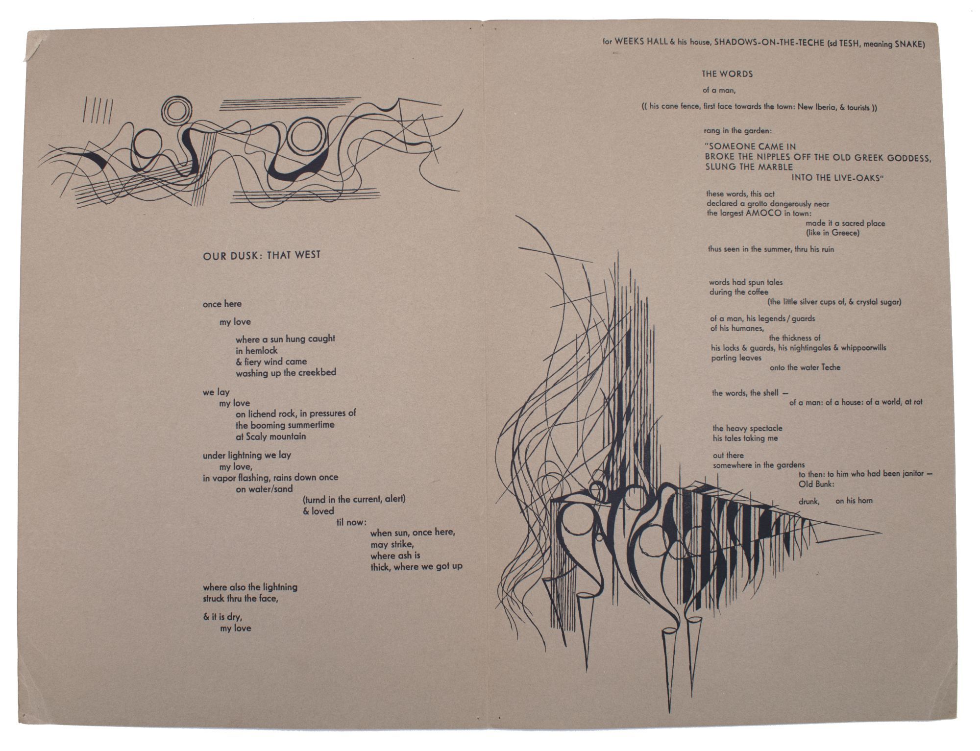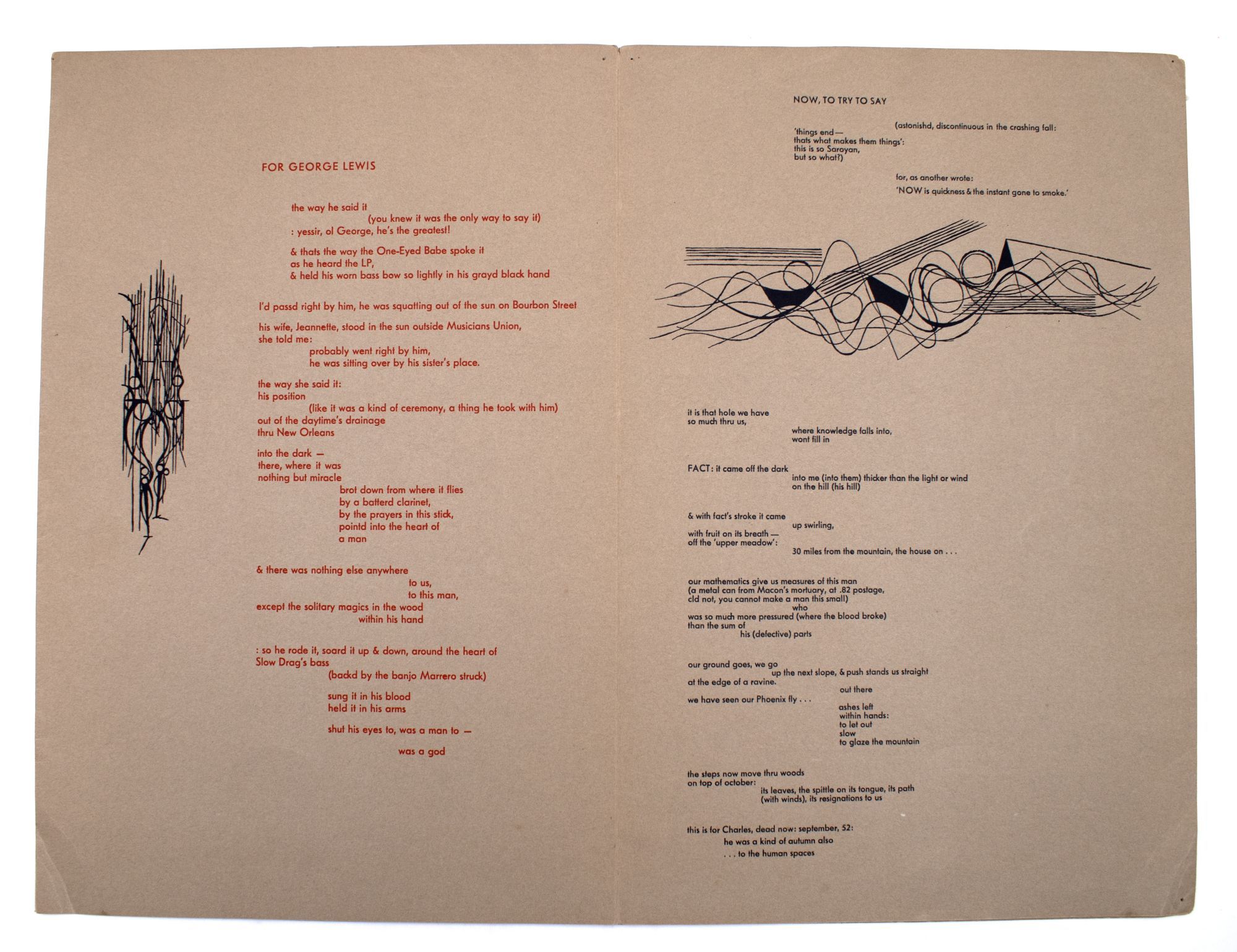 Stuttgart, Germany: Jonathan Williams, 1953. First edition, limited to 200 copies; issued as Jargon 5. [8]pp. printed by Ernst Klett Buchdruckerei ('Erbar Grotesk types, a Kamerun Papier from Firma Martz'). Folio. Stiff cardstock printed in black and red, A very good copy, with light soiling to covers, moderate crease at upper and lower corner, printed text and illustrations are quite fresh and clean. First edition, limited to 200 copies; issued as Jargon 5. [8]pp. printed by Ernst Klett Buchdruckerei ('Erbar Grotesk types, a Kamerun Papier from Firma Martz'). Folio. An elusive, early Jargon Society publication.