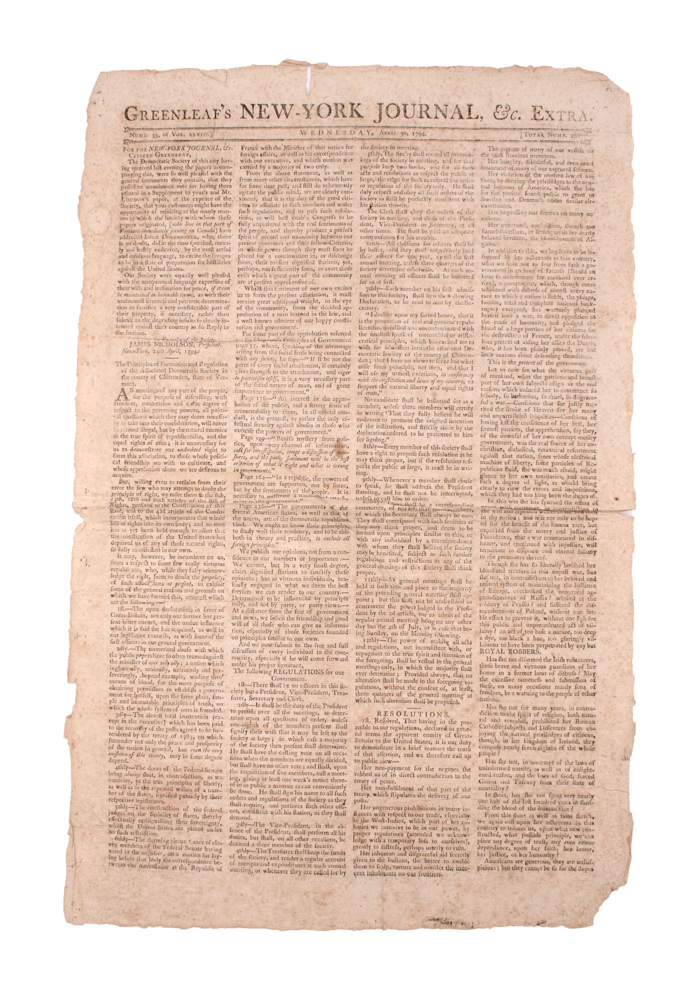 New York: Thomas Greenleaf, 1794. Vol. XLVIII, No. 35. 2pp. Folio. Minor browning, usual folds. Vol. XLVIII, No. 35. 2pp. Folio. The populism of the French Revolution arose in the nascent United States largely in the formation of Democratic Societies. "In their brief career, the societies and their activities provoked considerable controversy. By organizing public or semi-public discussions of political matters, issuing resolutions and addresses to the people, and remonstrating to local and national leaders, the societies challenged Federalist notions of an electorate at a safe remove from their representatives. Branded as 'self-created' and blamed for the Whiskey Rebellion, the societies very soon came under withering attack and by 1796 most of them had disbanded ... Nevertheless, the Democratic-Republican Societies left behind an altered political landscape. By serving as the first media of organized popular political dissent in the new republic, the Democratic Republican Societies expanded the boundaries of poltiical participation, helping to play out the logic of popular soverignty ... the societies forced for the first time a discussion of the place and limites of legitimate poltiical opposition in a republican society" (Schoenbachler).
