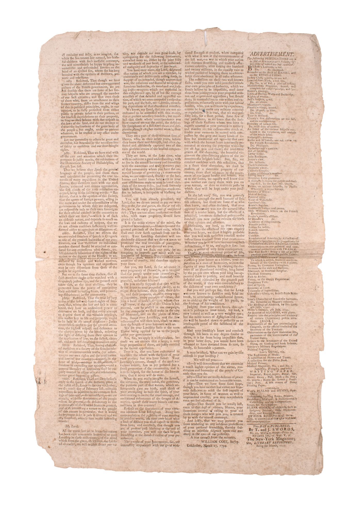 The present newspaper extra, evidently paid for by the Democratic Society of New York, i.e. the Tammany Society, prints the Principles, Regulations and Resolutions of the Associated Democratic Society of Chittenden Vermont – often quoted as one of few such published records of a Democratic Society from the period. According to Adelson the document was also printed within the Patriotic Register and the Diary (Adelson, “The Vermont Democratic-Republican Societies and the French Revolution,” Vermont History, XXXII [1964], 3–23).