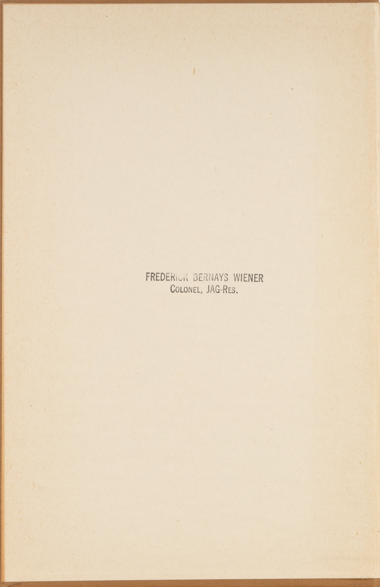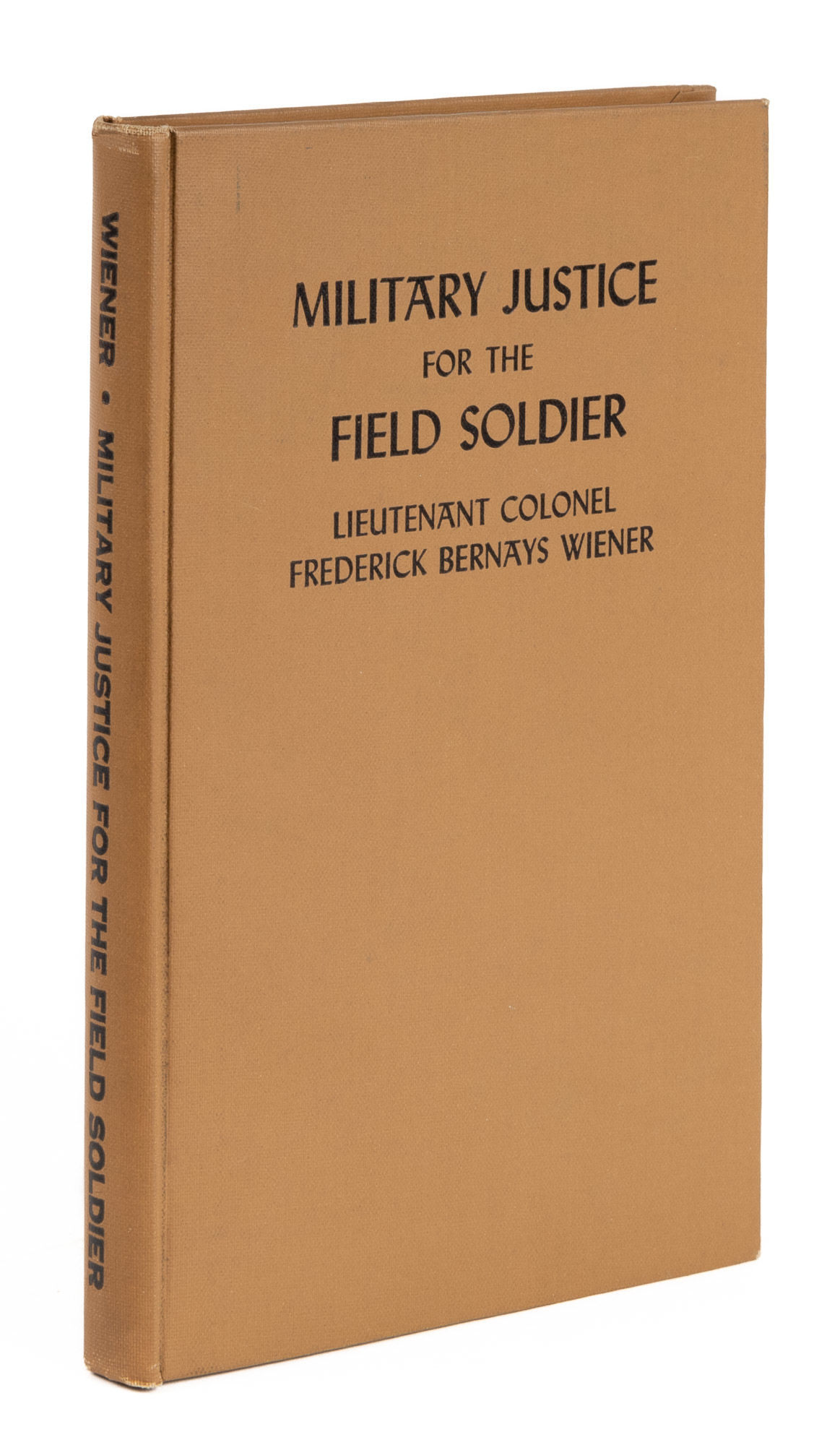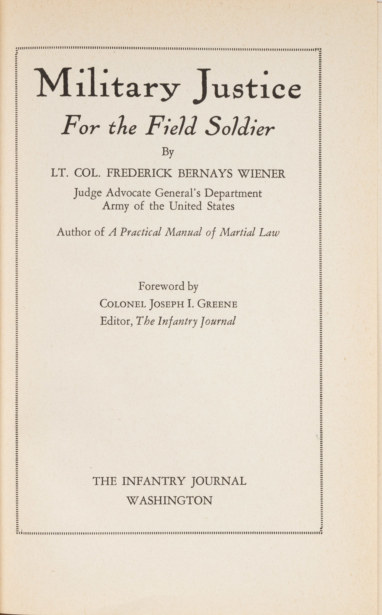 1944. The Author's Personal Copy. The Author's Personal Copy. The Author's Personal Copy Wiener, Frederick Bernays [1906-1996]. Military Justice for the Field Soldier. Washington, DC: Infantry Journal, 1944. Second and Revised edition. xii, 152 pp. Cloth, light shelfwear, "Frederick Bernays Wiener Colonel, JAG-Res" to front pastedown. $85.