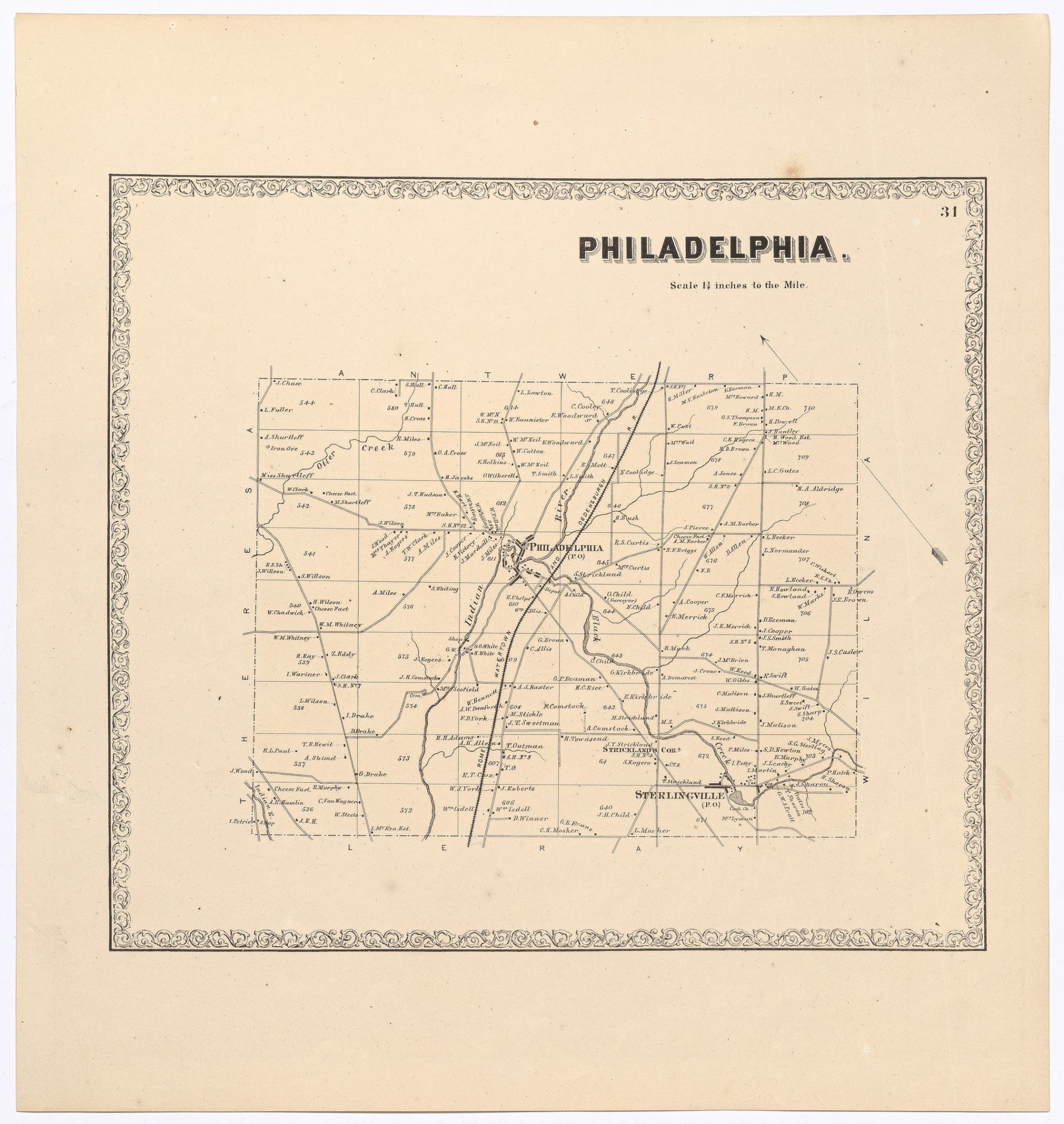 [Philadelphia, New York, 1864. Near Fine. Tinted lithographic map (15” x 16”). A few small spots, near fine. Plate no. 31, displaying the names of property owners, rivers, creeks, and railway lines in the vicinity of Philadelphia and Sterlingville in upstate New York near the Canadian border. Scarce. An attractive, well-preserved copy.