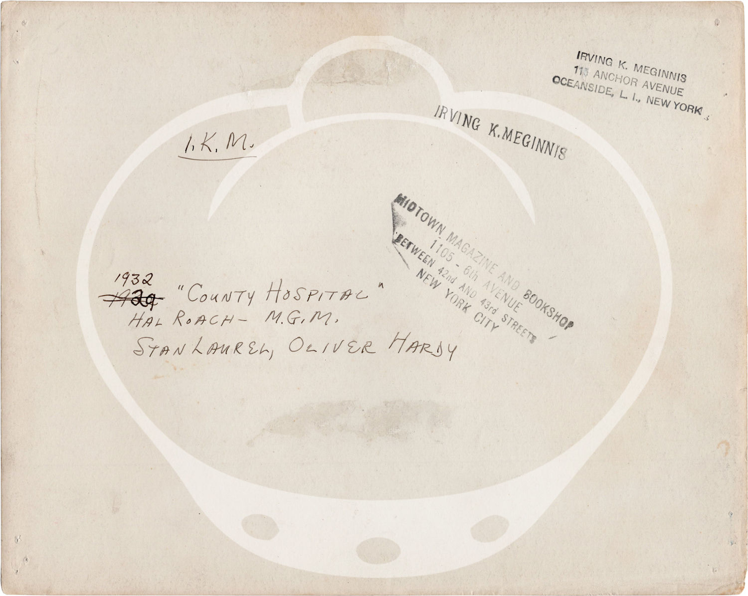 N.p.: N.p., 1932. Vintage reference photograph from the 1932 short film. With provenance stamps on the verso, along with manuscript ink annotations noting the film's title and associated cast and crew members.