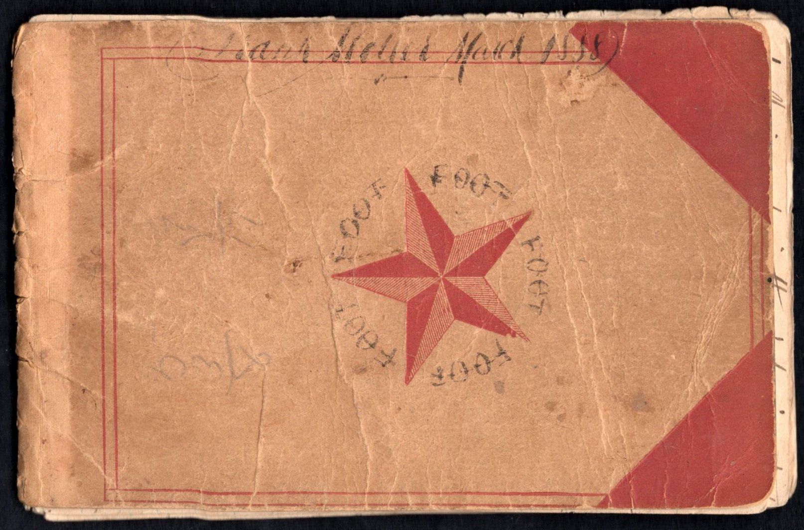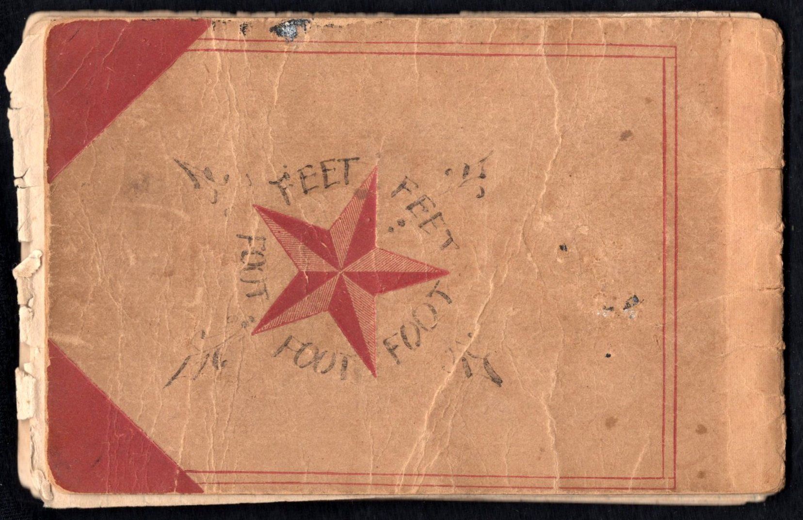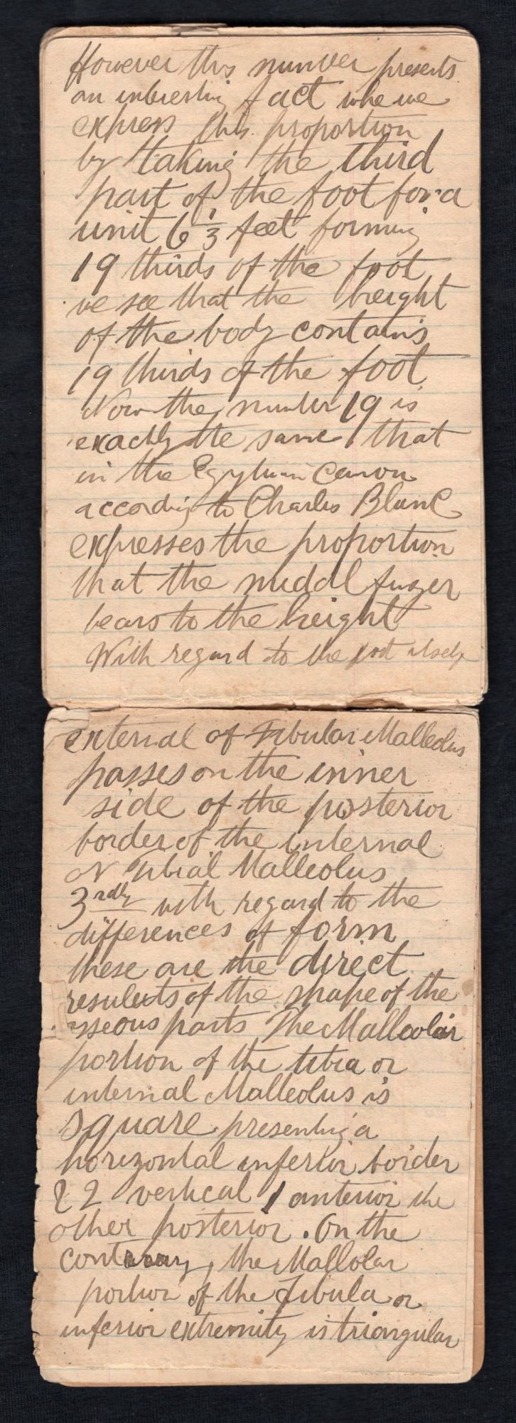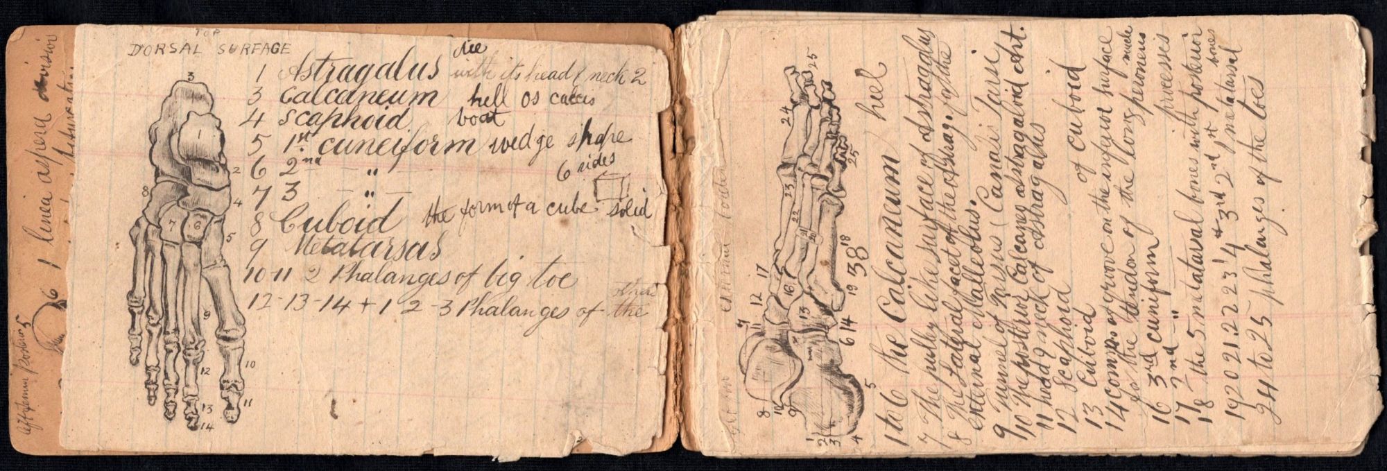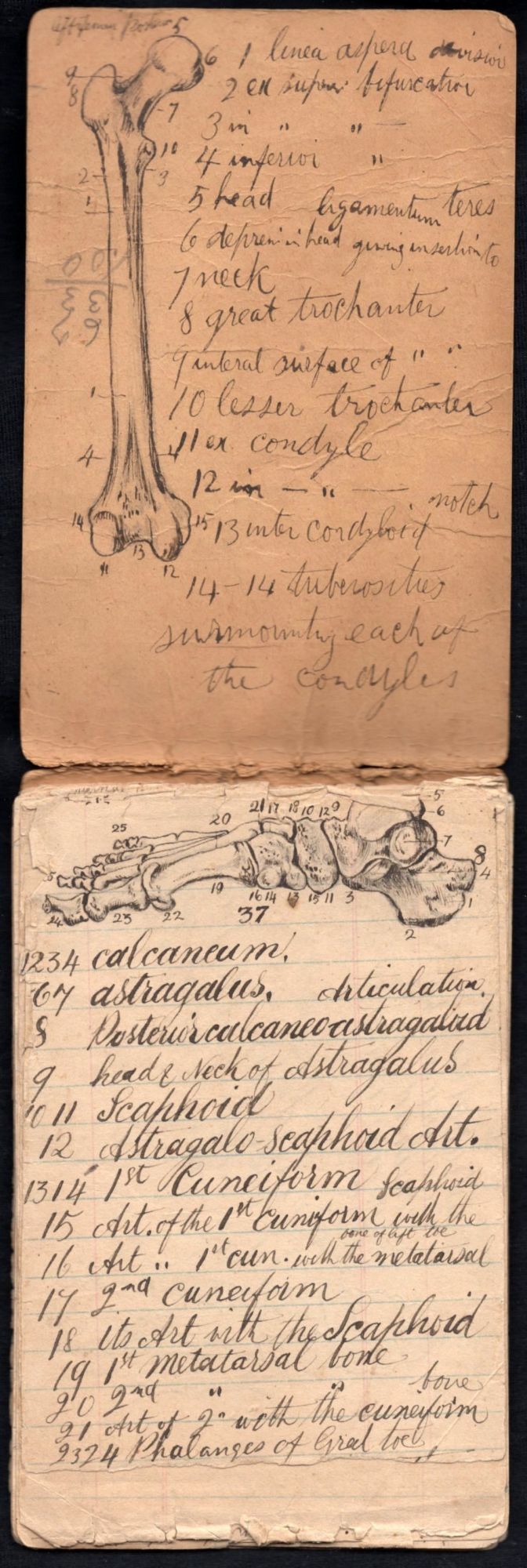 1888. Edge wear, toning and soiling, due to age. Most if not all interior pages are detached from the binding, as such it is unclear if any pages are missing.. A wonderfully detailed notebook which features notes on the skeletal system of the leg and foot, including all of their bones, cartilages, and ligaments that support and give shape to the body structures. The notes are legible, though not easily understood, unless one is familiar with the skeletal system. "The two facets of the calcaneum [Latin form of calcaneus] are also seperated [sic] by a grove traversely [sic, transversely] oblique, it follows therefore that when the astragalus [another name for the talus or ankle bone] is in its place the grove astragalus and the calcaneum meet as a concavity forming a tunnel which may be seen opening outward upon the skeleton of foot which is called the cavity of the tarsus." The notebook also features five detailed, hand drawn ink skeletal anatomical diagrams of the bones of the foot and leg. Each bone in the diagrams are number, and correspond to a list of the names of the bones. The covers features red accents, with a star in the center. In between each point of the star has been written either 'Foot' or 'Feet'. 32 pgs. Completely filled. Measures 5 1/4" x 3 1/2