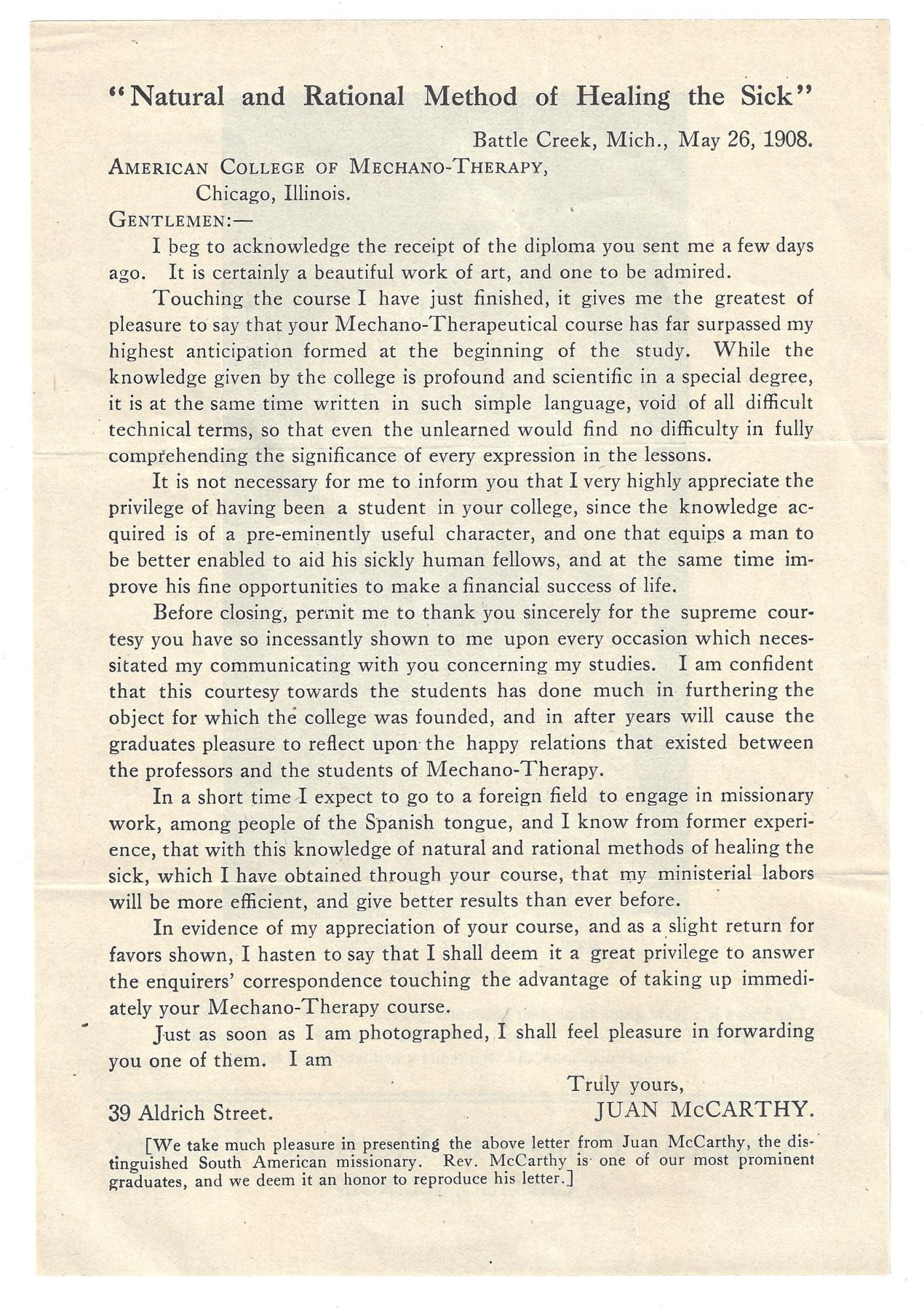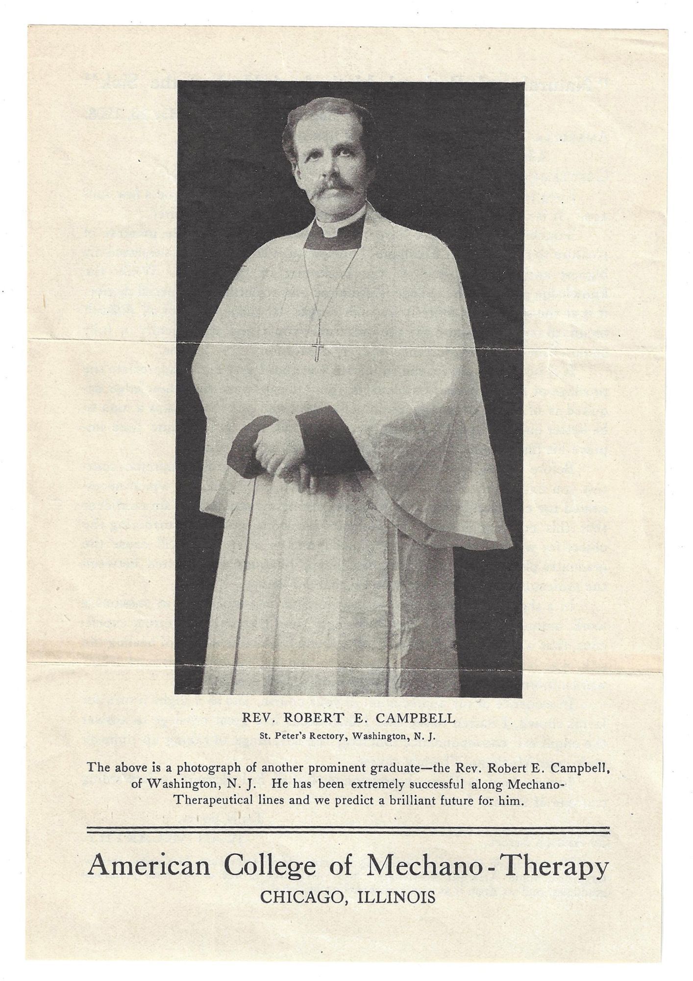 [Chicago]: American College of Mechano-Therapy, 1910. Fine. Lightly toned.. Photographically illustrated promotional flyer (8" by 5.5") for the American College of Mechano-Therapy, which offered its courses to physicians via correspondence. The recto depicts "prominent graduate" Rev. Robert E. Campbell, and the verso features a grateful letter from another graduate, expounding on the benefits of the program for his career as a missionary. Mechanotherapy is most closely related to what we refer to as physical therapy today.