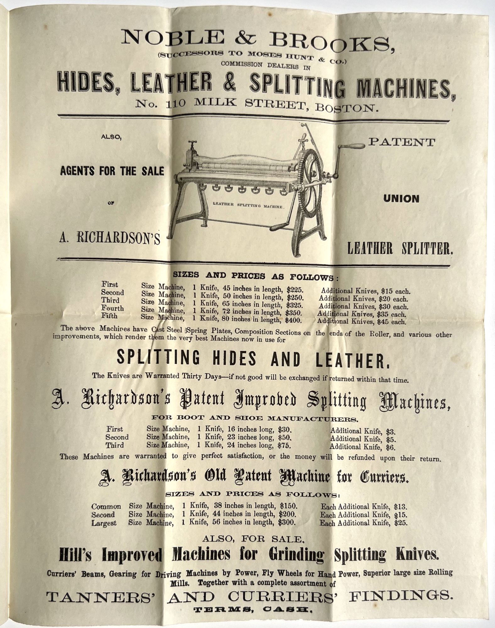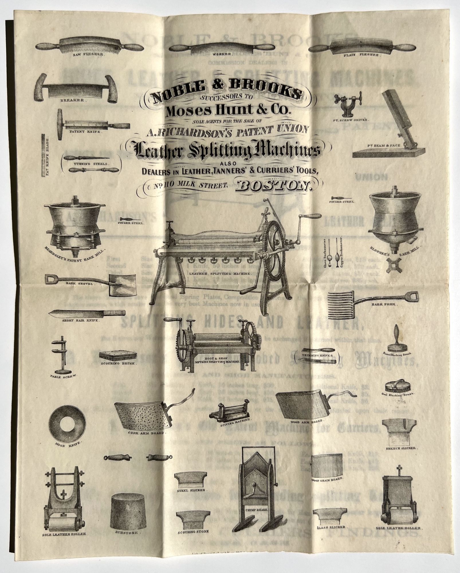 Boston, Massachusetts: Noble & Brooks, 1870. Near fine. Letter folds, one or two spots.. Illustrated advertising bifolium for Noble & Brooks, "sole agents for the sale of A. Richardson's Patent Union Leather Splitting Machines, also Dealers in Leather, Tanners' & Curriers' Tools". Includes lithographed illustrations of the various tools and their names.
