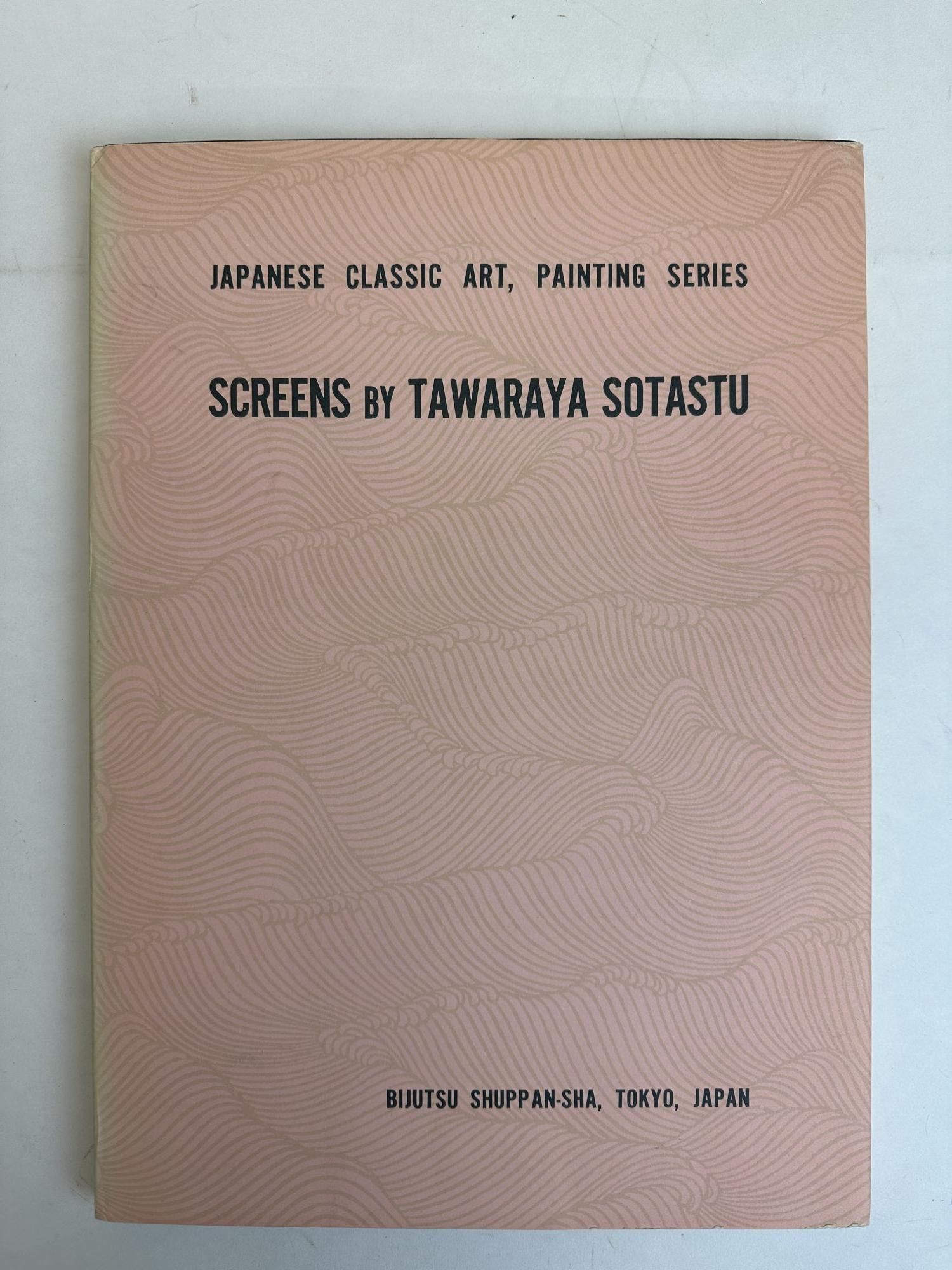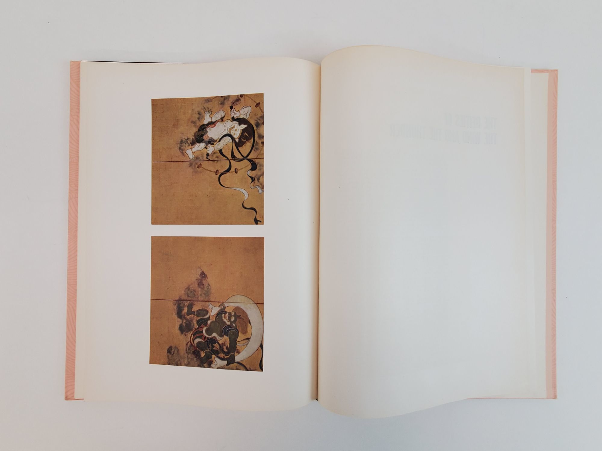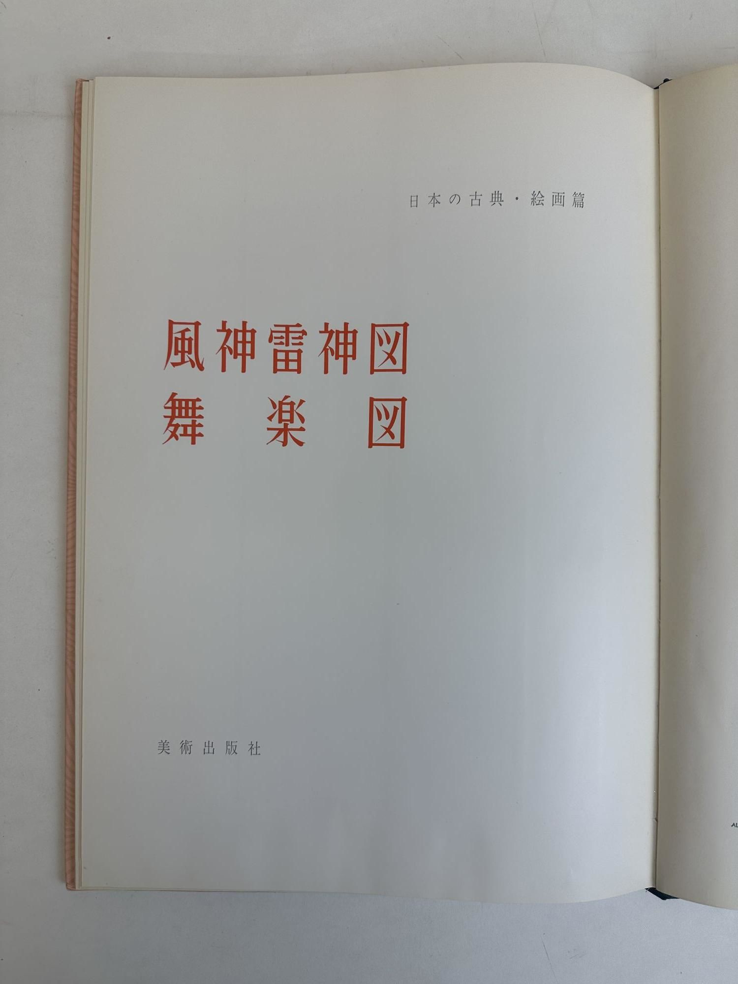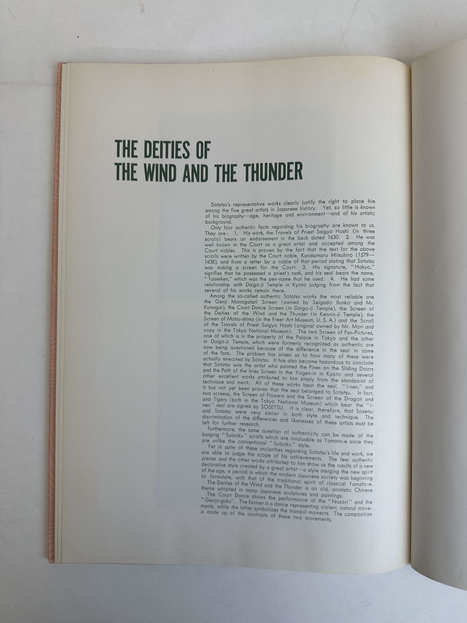 Tokyo, Japan: Bijutsu Shuppan-Sha, 1956. Hardcover. Large quarto, 13 pages, [18], In Very Good Condition with Very Good dust jacket and Good slip case. Slip case is light blue with peach spine and black lettering. Slip cases have Light plus shelf wear with rubbing to corners, small partial tear along bottom edge, and damp staining to spine. Off-white spine with black lettering. Dust jackets show Very Light shelf wear with creasing to spine head and tail. Illustrated with twelve color plates. Introduction in English with eighteen pages of text in Japanese. End pages are light pink. SH Consignment. Shelved in Room A. Catalogue of artworks by Tawaraya Soutatsu of Fuujin (wind god), Raijin (thunder god), court dances and music. 1363285. Special Collections.