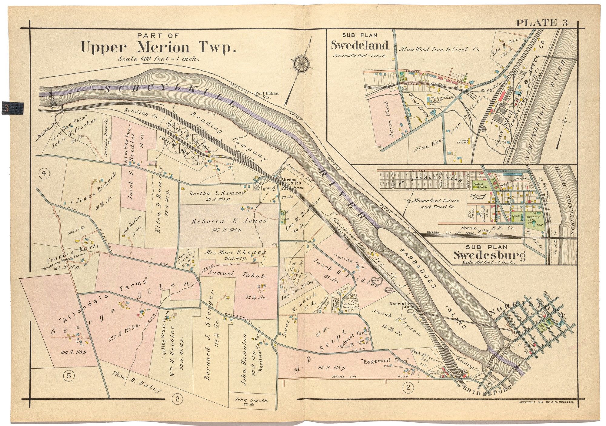 [Philadelphia]: A.H. Mueller, 1912. Near Fine. Linen-backed hand-colored map (31 ½” x 22”). Plate no. 3, with a cloth tab, folded. Near fine. Displays the names of property owners, businesses, railways, etc., in part of Upper Merion Township, a suburb of Philadelphia, together with sub plans of Swedeland, Swedesburg, and part of Norristown. Scarce. An attractive, well-preserved copy.