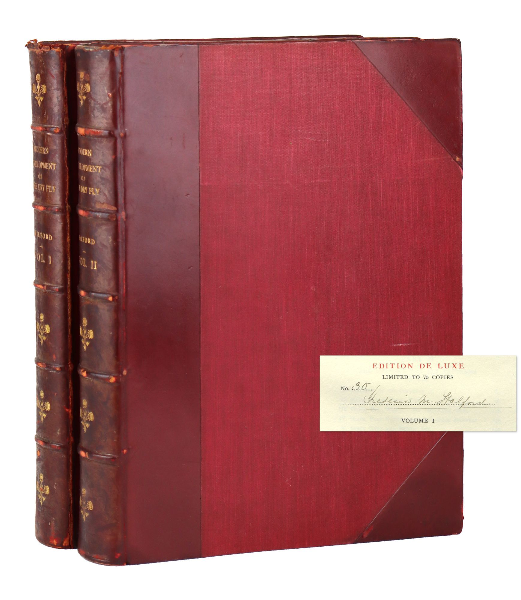 London: George Routledge and Sons, 1910. Very Good +. London: George Routledge and Sons, 1910. Edition De Luxe, one of 75 copies signed by Halford at title page of volume I, with an additional 50 copies published in the U.S. Two quarto volumes. Volume I with frontis portrait; 9 color plates of flies; 18 color samples; 16 photogravures. Vol. II with 33 flies on 9 recessed card mounts, though numbers 24 and 25 damaged and lacking wings and tails. Original half red calf with red cloth boards, six compartments to spine, gilt lettering, top edge gilt. Marbled endpapers. Each volume housed in a custom-made clamshell case with mounted title labels.