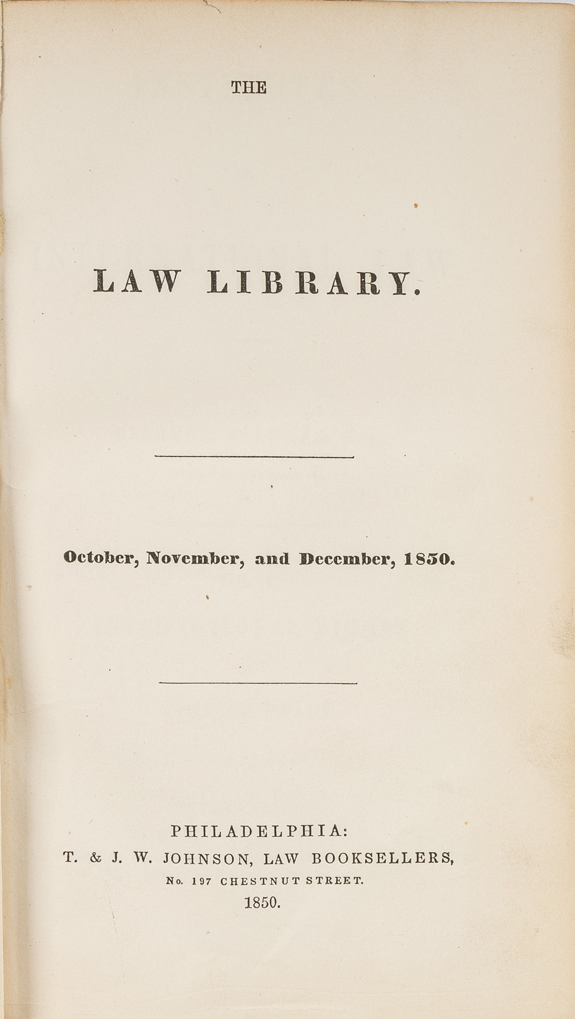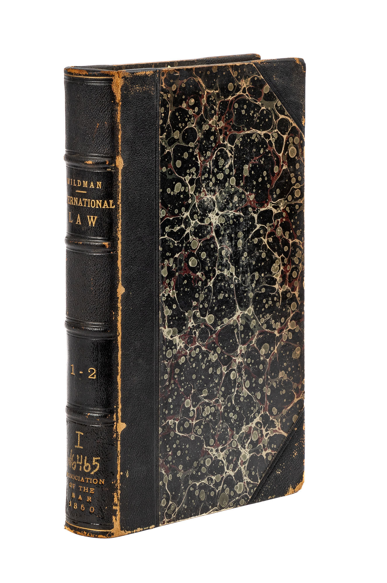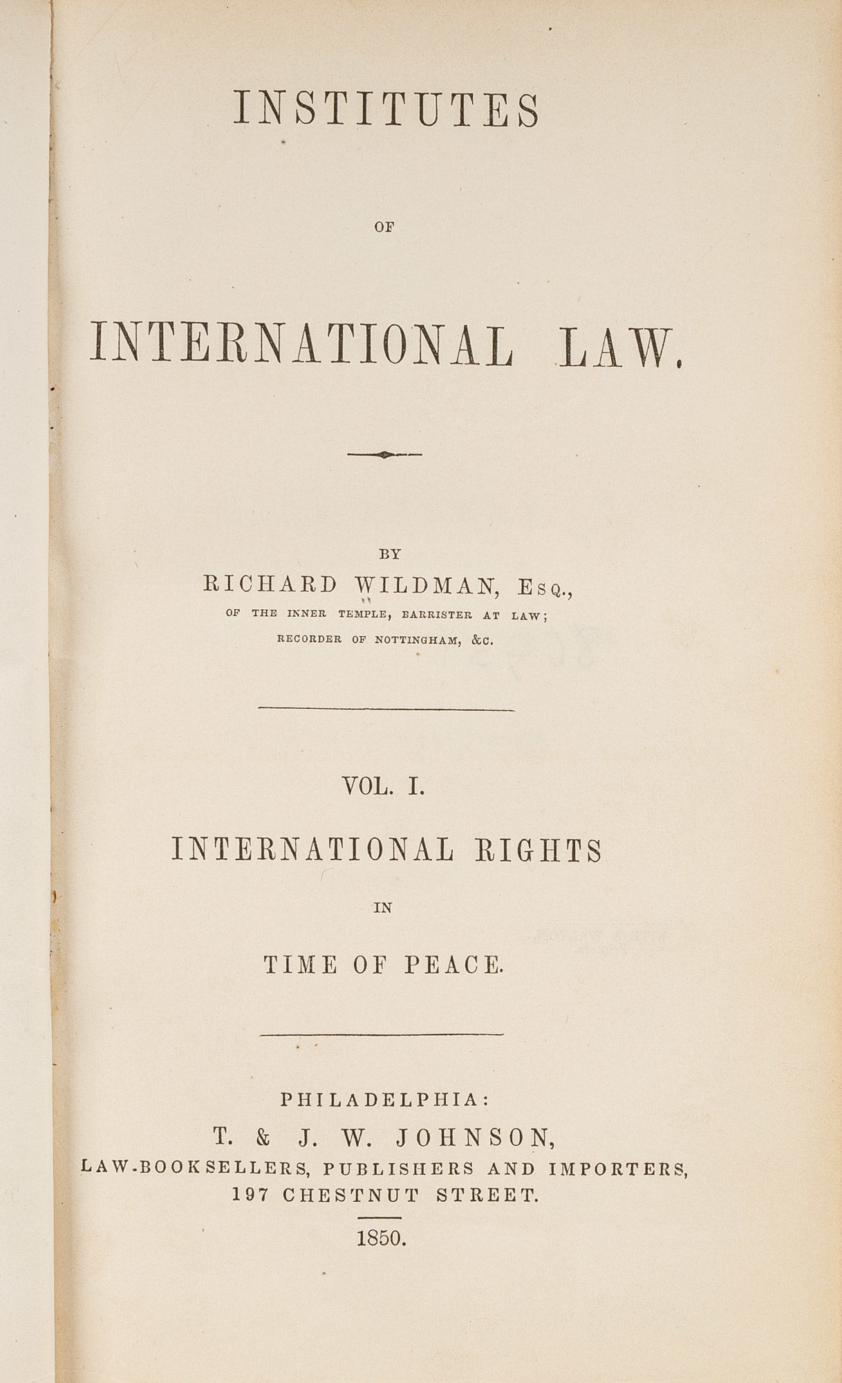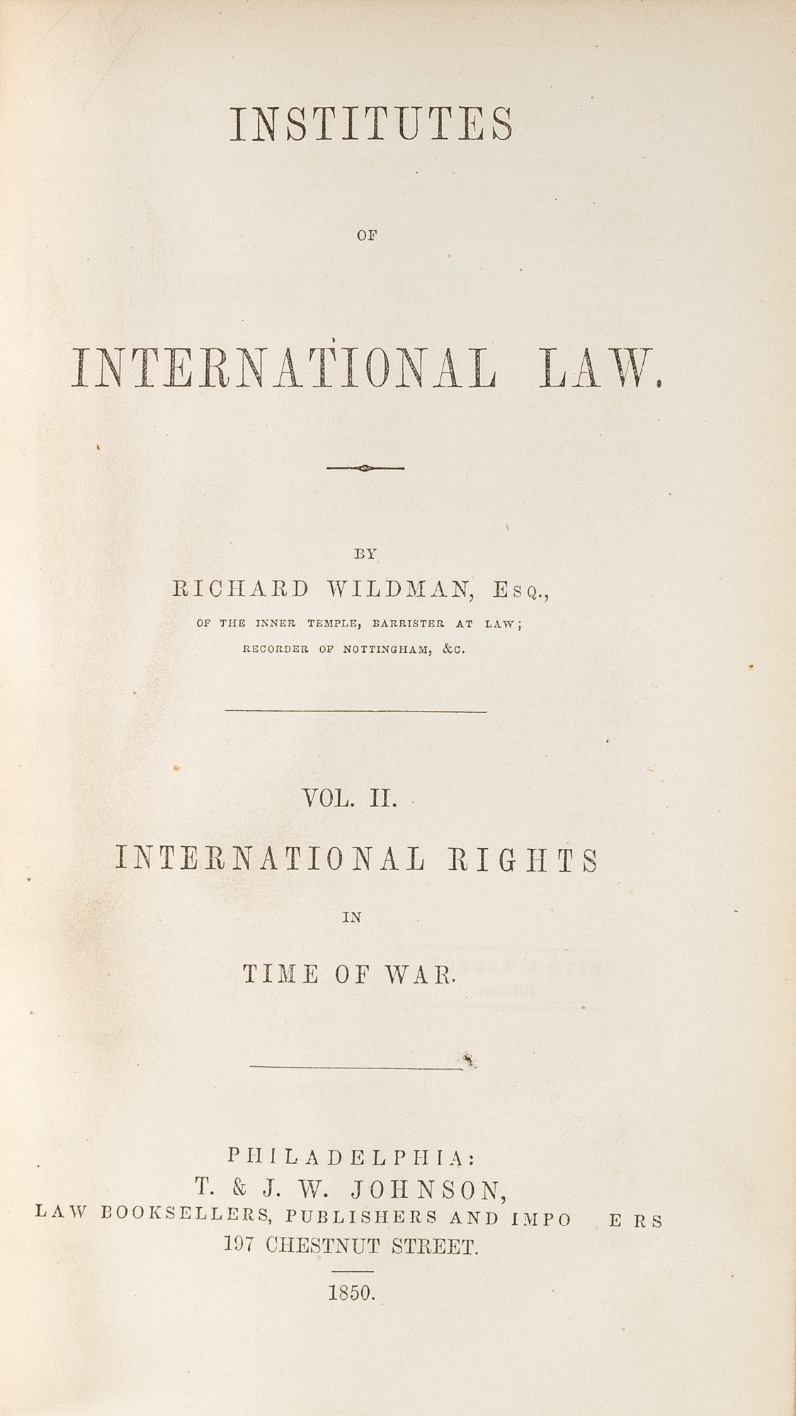 1850. London: William Benning, 1849-1850. 2 vols. in 1. London: William Benning, 1849-1850. 2 vols. in 1. Comprehensive Victorian-Era Treatise on International Law Wildman, Richard [1802-1881]. Institutes of International Law. Philadelphia: T. & J.W. Johnson, 1850. Octavo (9" x 5-1/2"). Later three-quarter morocco over marbled boards. Raised bands, shelf number and gilt title, publication date and institution name to spine, endpapers renewed, cloth hinges. Light rubbing to boards, moderate rubbing to extremities, small institution stamps to rear pastedown. Light toning to interior, somewhat heavier in places, embossed institution stamp to Volume I title page, marking to its verso, embossed stamps to following two leaves, tiny chip to foot of dedication leaf. $250. * Only American edition, a reissue of the only London edition (1849-1850). Wildman's comprehensive history and overview of the provides an excellent summary of the field as it was understood by practicing lawyers in Great Britain during the mid-1800s. The volumes are sub-titled: International Rights in Time of Peace and International Rights in Time of War. This title was part of the Law Library series issued by Johnson. Not in Cohen.