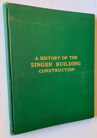 New York: Shumway & Beattie, 1908. Cloth. Very Good +. The uncommon 1908 1st edition of this fascinating history of the construction of the Singer Building in New York, a Beaux-Arts masterpiece located at Liberty St. and Broadway in the Financial District. One of Manhattan's early skycrapers, construction was completed in 1908 when, for its first glorious year, the building (also known as the Singer Tower) was the tallest building in the world at 612 ft. The chief architect was Ernest Flagg, who designed the building in multiple phases between 1897 and 1908. This copy, in its original dark-green cloth, has held up nicely. Clean, tight and VG+, with bright gilt-titling along the front panel. Just a touch of light spotting and streaking at the panels, mild spotting to the title page. Tall quarto, lovely marbled endpapers and pastedowns. Dozens of remarkable black-and-white photographs (and engravings) chronicling the construction of the building. A nice example --scarce in its original iteration-- of turn-of-the-century New York architecture.