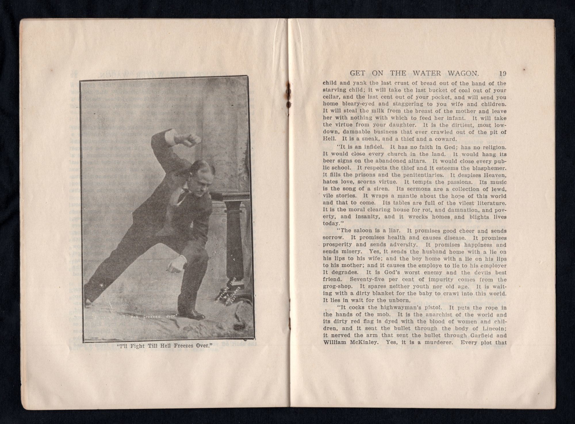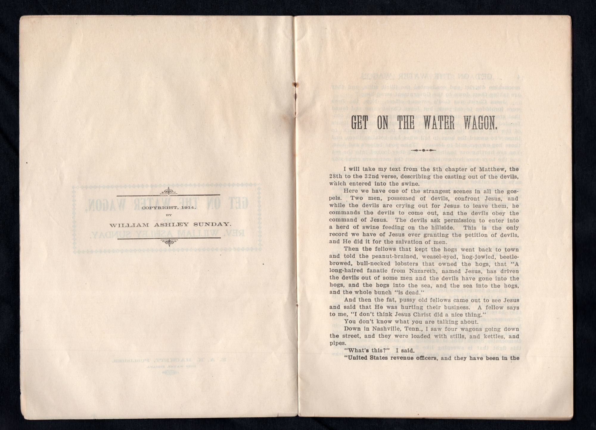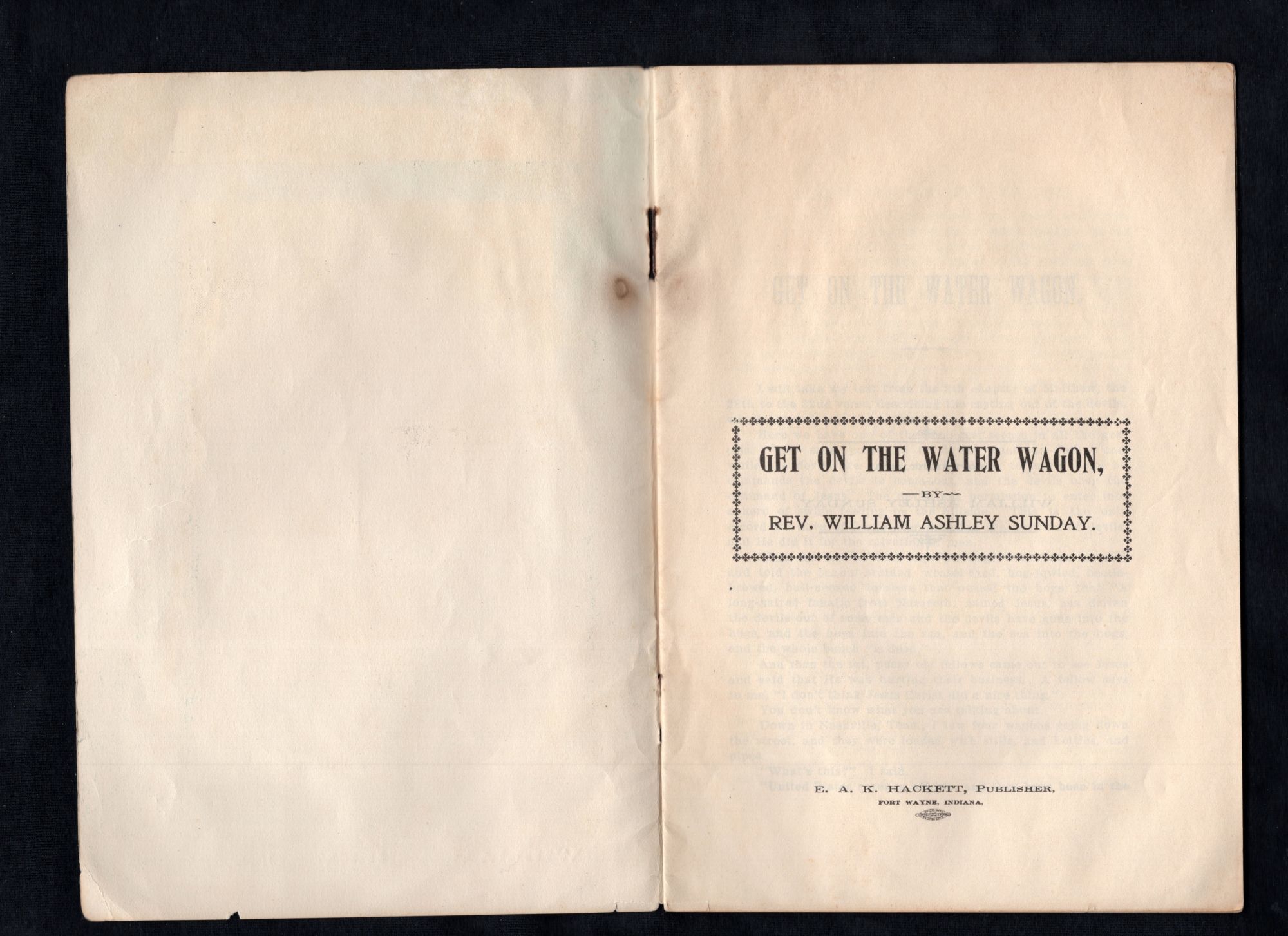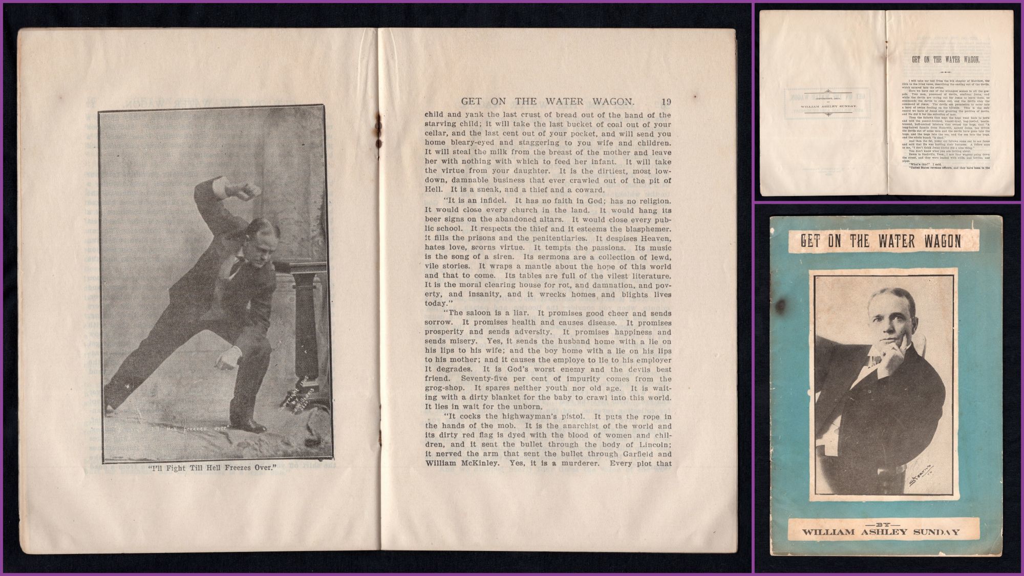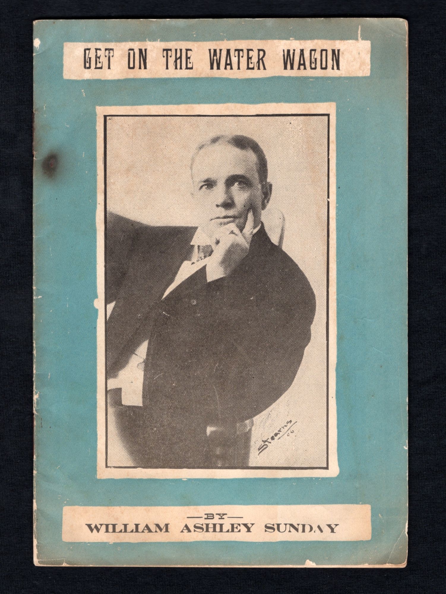 Fort Wayne, IN: E. A. K. Hackett, 1914. General wear and toning due to age. Covers partially detached. Burn mark by upper staple binding.. A printed copy of the sermon, "Get on the Water Wagon" by Rev. William Ashley Sunday (1862-1935). Perhaps better known as Billy Sunday, he was an American baseball player, who played as an outfielder in the National League, who later became one of the most celebrated American Evangelists of the late 20th century. "Get on the Water Wagon" was Sunday's most famous sermon, and as such he preached it on countless occasions. The sermon was about temperance, a movement of which Sunday was a most ardent champion of. "Listen! Seventy-five per cent of our idiots come from intemperate parents; eight per cent of the paupers; eighty-two per cent of the crime is committed by men under the influence of liquor; ninety per cent of the adult criminals are whisky made... The saloon is the sum of all villainies. It is worse than war or pestilence. It is the crime of crimes. It is the parent of crimes and the mother of sins." Within is a single printed halftone black and white image of man, with the caption "I'll Fight Till Hell Freezes Over". Front cover has a printed halftone black and white photograph of a portrait of the Reverend. 32 pgs. Printed wrappers. Staple binding. OCLC 0 (March 2021, there are other editions). Measures 8 3/4" x 5 3/4" Rev. William Ashley "Billy" Sunday was born on November 19, 1862 to William Sunday (1828-1862) and Mary Jane Corey/Cory (1840-1916) in Ames, IA. He had two older siblings: Albert Monroe Sunday (1858-1900) and Howard Edward Sunday (1861-1938). After the death of his father, his mother remarried James Mattison Heizer (1821-?) and she had two more children, Billy's younger half siblings: Leroy C. Heizer (1866-1944) and Mary Elizabeth Heizer (1868-1871). He married Helen Amelia "Nell" Thompson (1868-1957) on September 5, 1888 in Cook, IL, and had four children: Helen Edith Sunday (1890-1932), George Marquis Sunday (1892-1933), William A. Sunday Jr. (1901-1938), and Paul Thompson Sunday (1907-1944). Billy grew up playing baseball and in 1883 he was signed to the Chicago White Stockings a National League team. He played in the major leagues for eight years, and was an average hitter and a good fielder known for his base-running. He converted to Evangelical Christianity in either 1886 or 1887, and became heavily involved in the Temperance movement. He became well-known for his sermons and played a significant role in getting prohibition passed in 1918. Sunday's popularity waned after WWI, and even though scandal never touched him, his sons often engaged in the behavior he so often preached against. In order to keep that quiet, Sunday often paid blackmailers. In early 1935 he had a mild heart attack, and after refusing to follow his doctor's order to take it easy, he died on November 6, 1935, a week after preaching his last sermon, entitled "What Must I Do to Be Saved?