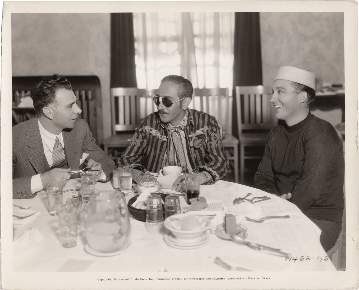 Los Angeles: Paramount Pictures, 1934. Vintage double weight photograph of director Wesley Ruggles (left) eating lunch with actors Bing Crosby (right) and Adolphe Menjou (center) in the Paramount commissary in 1934. Mimeo snipe on the verso.