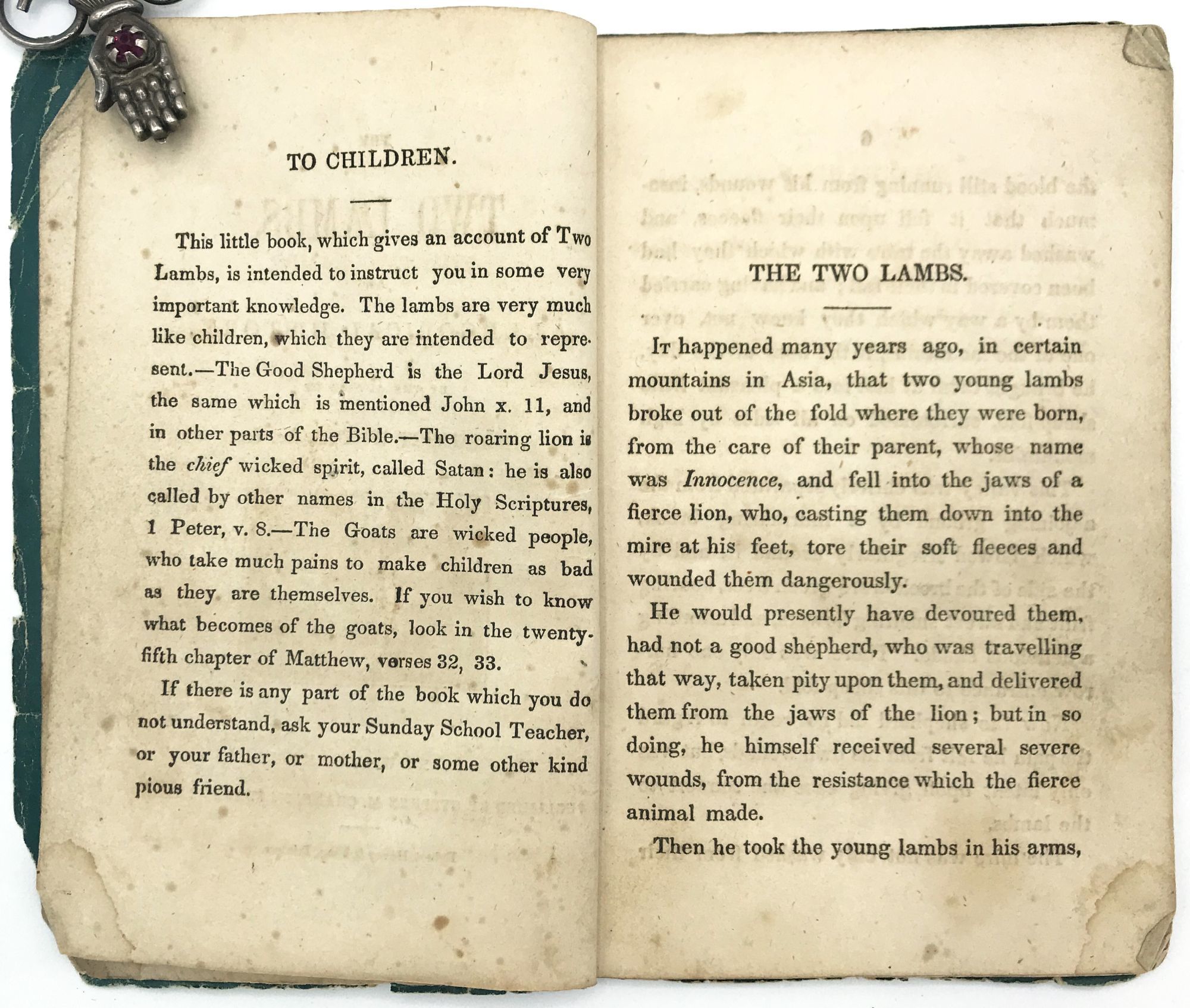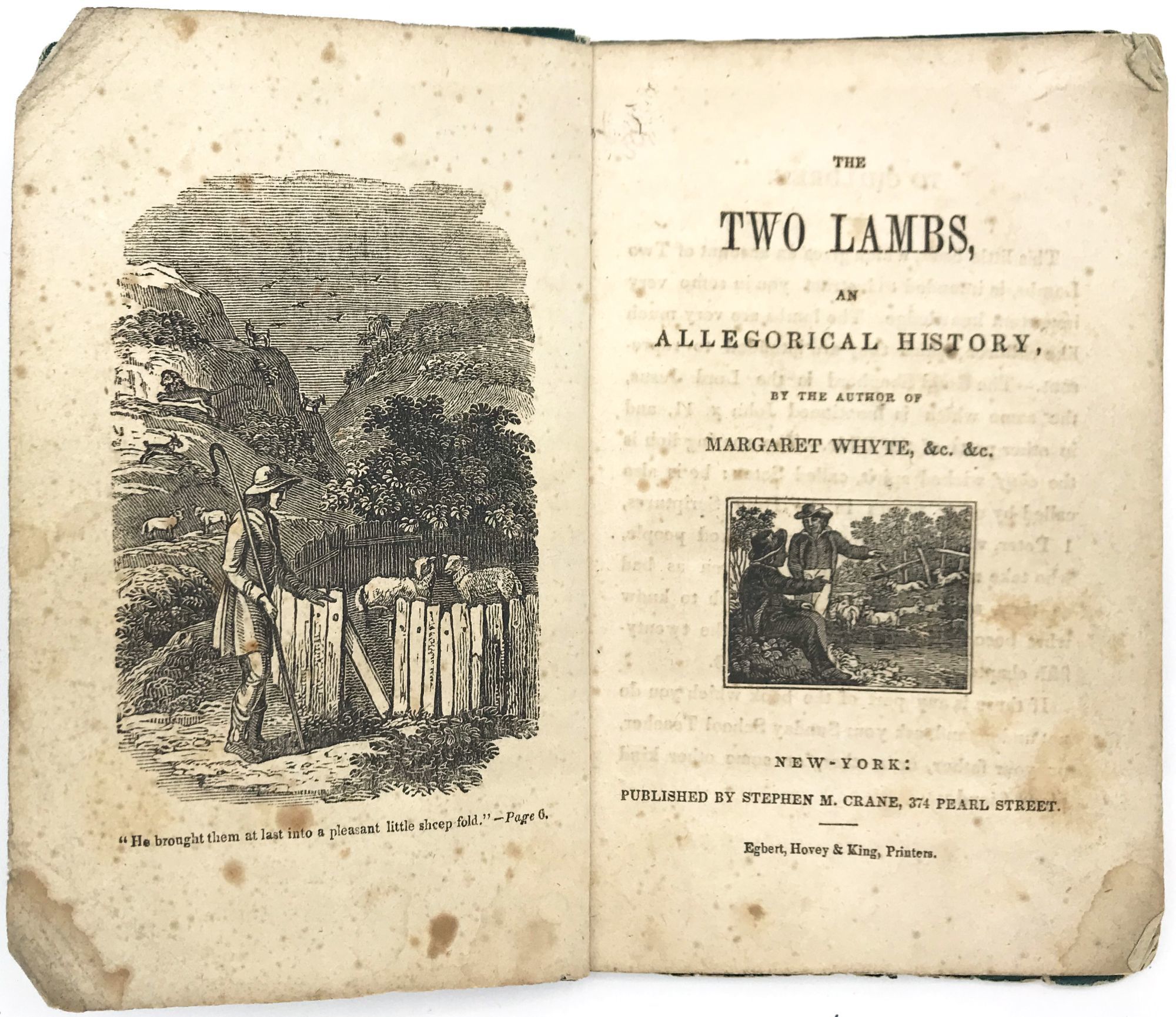New York, New York: Stephen M. Crane, 1845. Very good. Some light toning/foxing. Wrappers chipped.. A children's book about two lambs "intended to instruct you in some very important knowledge. The lambs are very much like children, which they are intended to represent. The Good Shepherd is the Lord Jesus ... the roaring lion is the chief wicked spirit, called Satan ... The Goats are wicked people, who take much pains to make children as bad as they are themselves" (p. [4]). The book goes on to instruct its reader to consult a "Sunday School teacher, or your father, or mother, or some other kind of pious friend" for further moral instruction. The volume ends with a transcription of The Lord's Prayer.