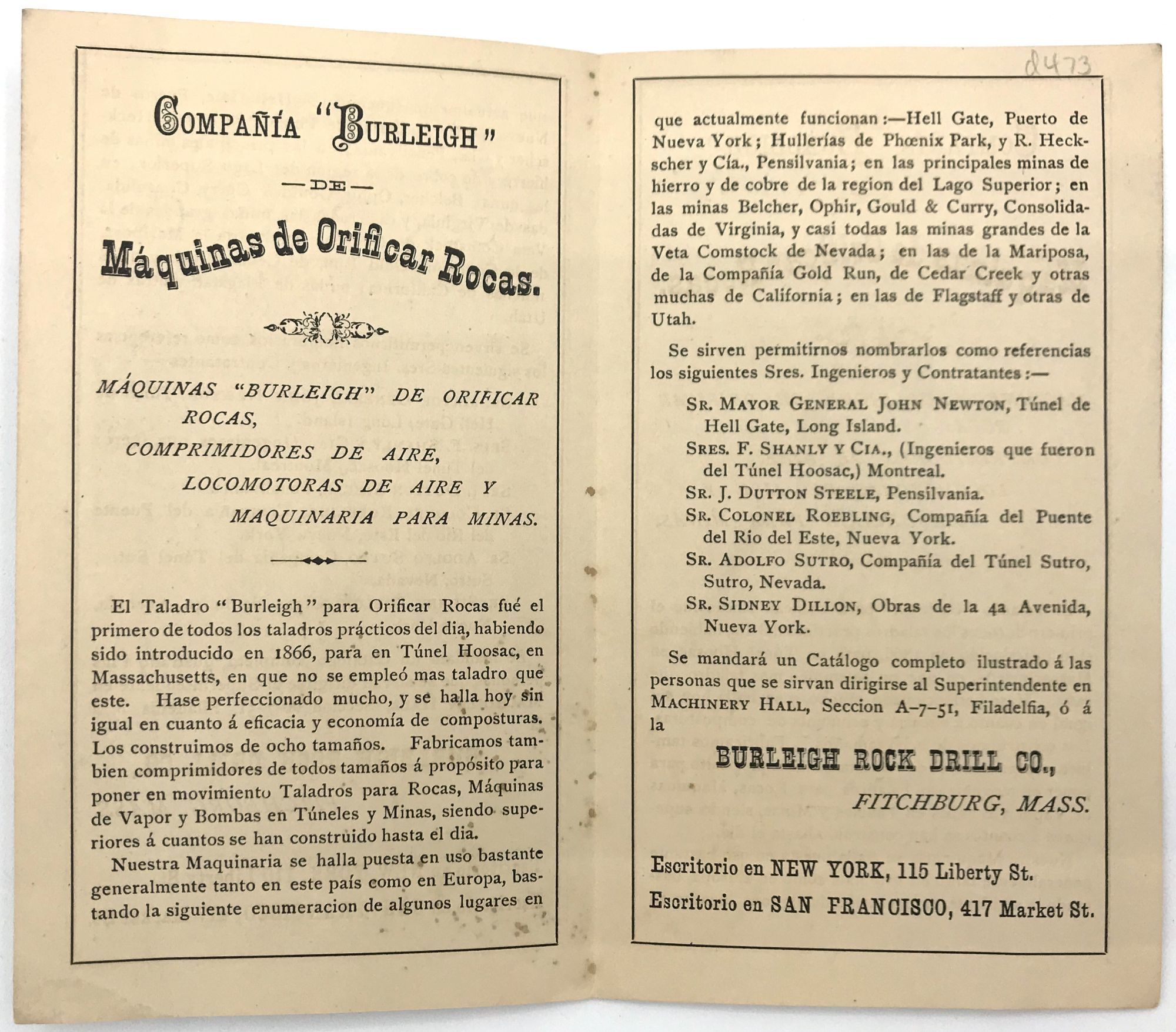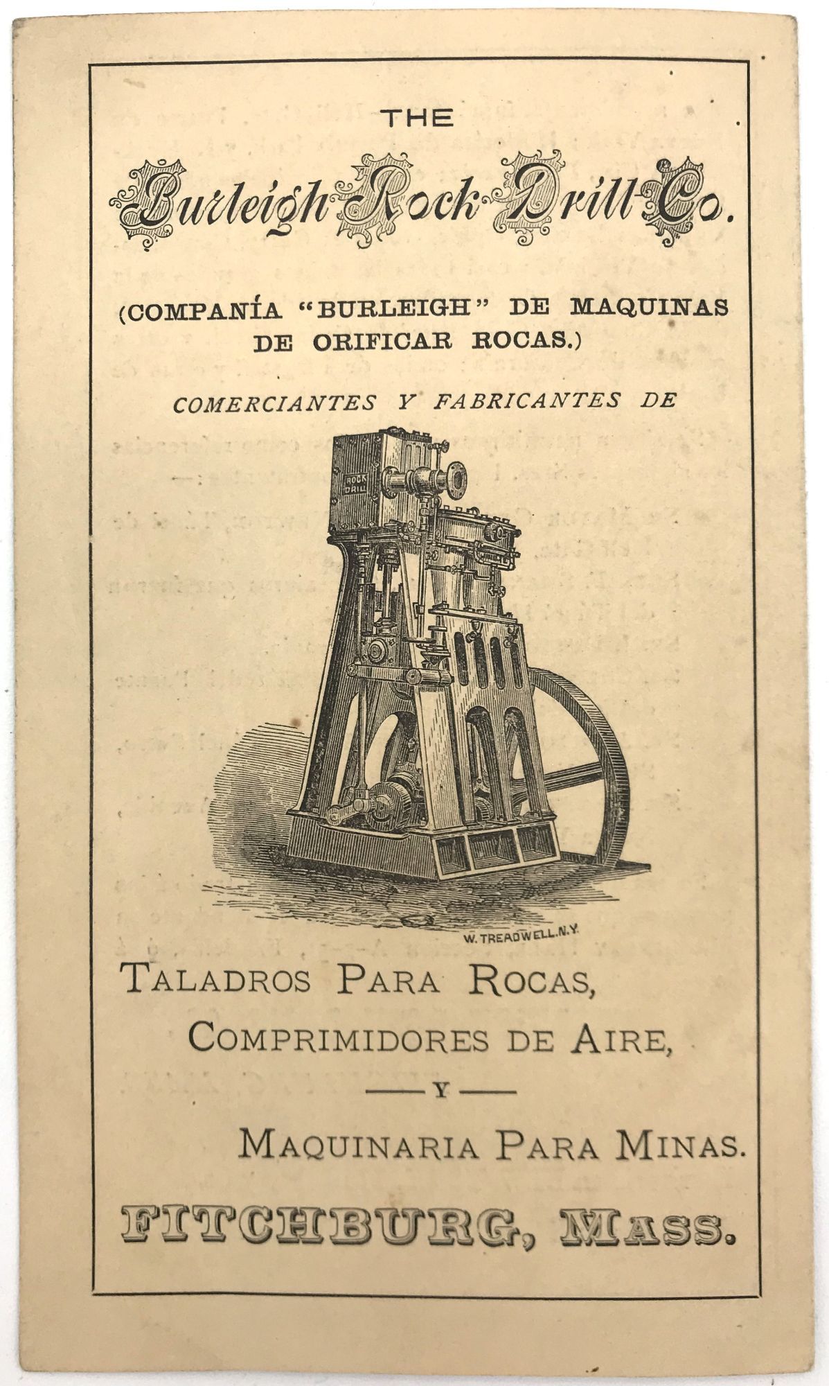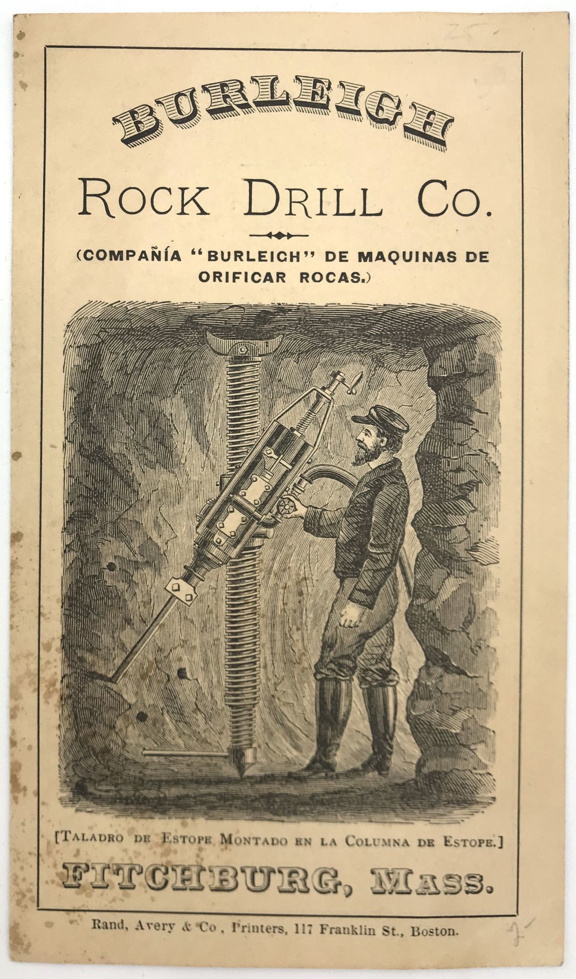 Boston, Massachusetts: Rand, Avery & Co, Printers, 1870. Some light toning and spotting, else fine.. Illustrated Spanish-language advertising bifolium for Burleigh Rock Drill Co., a highly successful manufacturer of industrial mining equipment based in Fitchburg, Massachusetts. Includes large illustration of gentleman operating the Burleigh rock drill on the upper cover, and another illustration of the drill on the lower cover. Inside, the efficiency and efficacy of the equipment is discussed alongside a list of successful mines and contractors currently using the product.