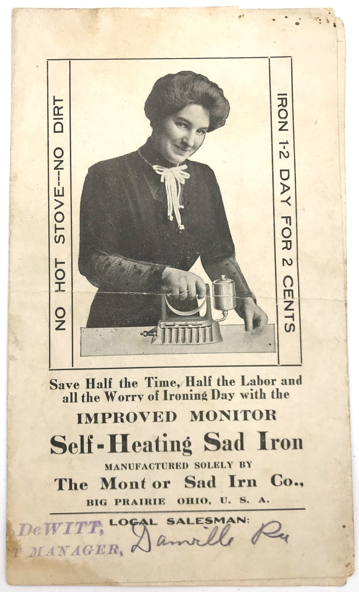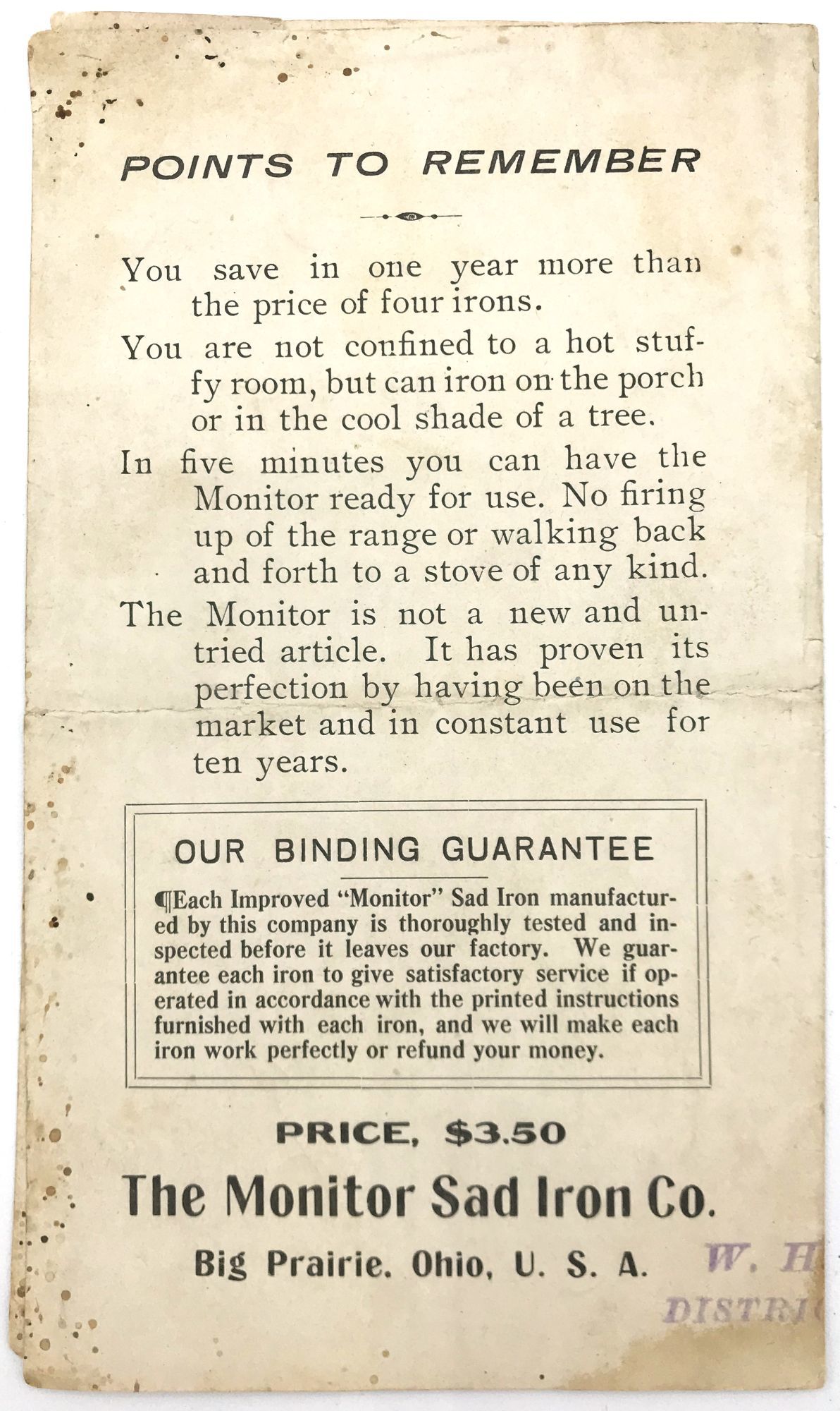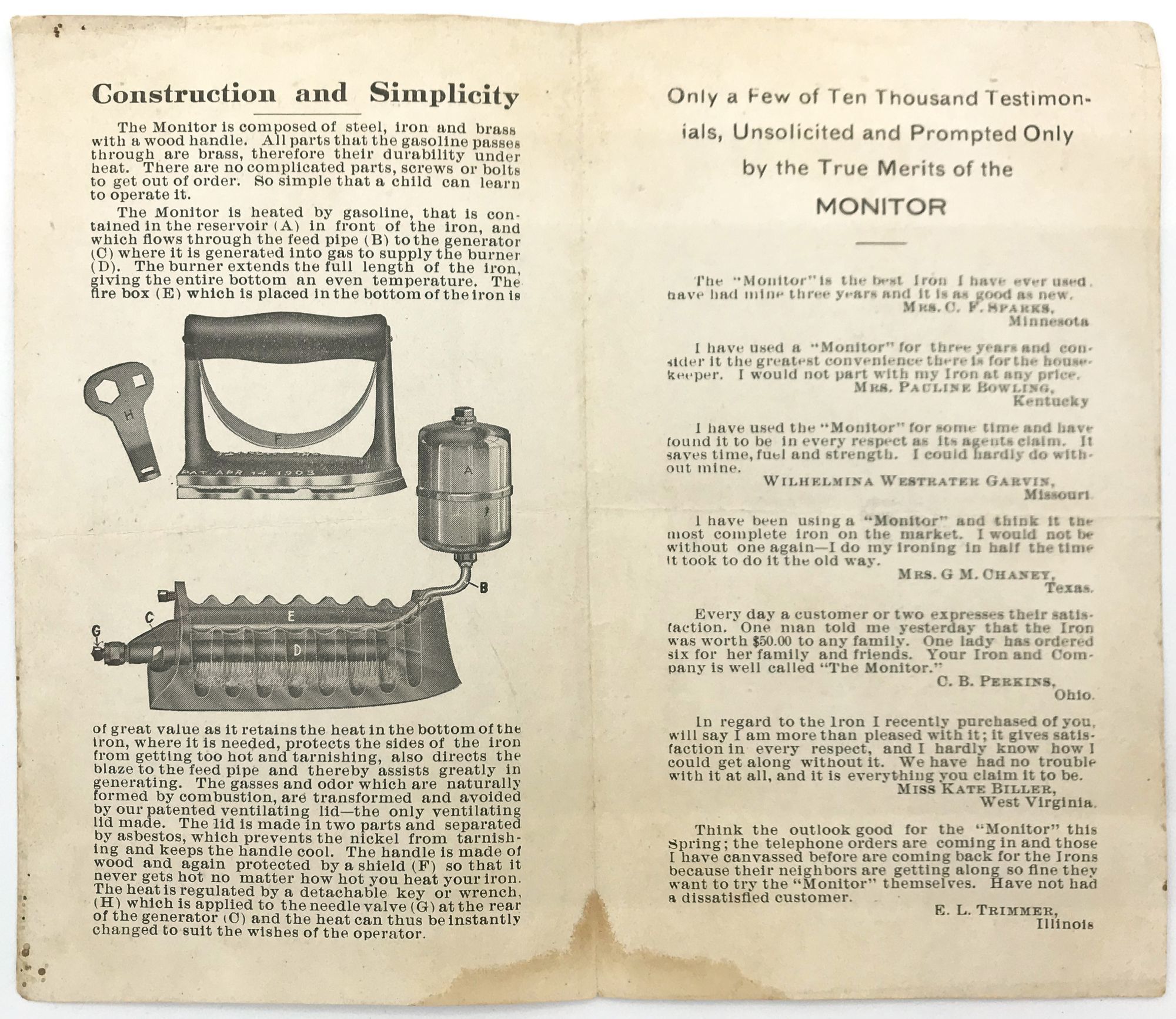 Big Prairie, Ohio: The Monitor Sad Iron Co, 1910. Very good to fine. Some light toning, dust soiling.. Save half the time, half the labor and all the worry of ironing day with the Improved Monitor Self-Heating Sad Iron", manufactured by The Monitor Sad Iron Co. Marketed towards homemakers and and domestic workers, this illustrated advertising bifolium includes a photograph of a smiling woman using the product, as well as a diagram of the product's simplistic construction. Several testimonials from happy customers are offered, as well as several "Points to Remember" about this product, such as: "You save in one year more than the price of four irons" and "In five minutes you can have the Monitor ready for use".
