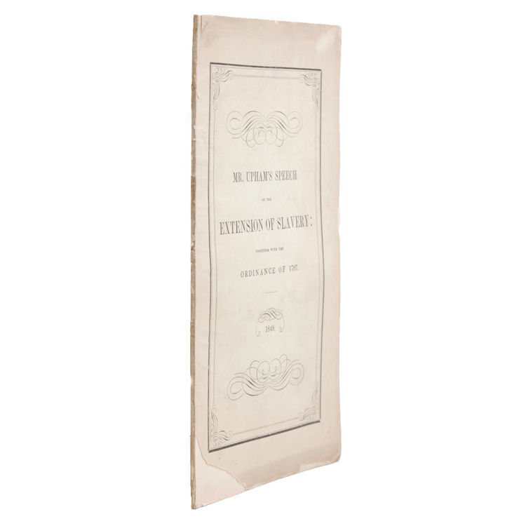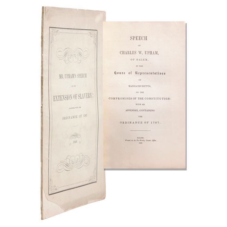 Salem: Printed at the Tri-Weekly Gazette Office, 1849. 40 pp. 1 vols. 8vo. Printed wrappers. Some chipping at bottom of front wrapper. Very good. 40 pp. 1 vols. 8vo. “Resolved, That with these views we, the people of Massachusetts … hereby pronounce the attemot, by the southern States or any portion therein, to establish the institution of slavery upon any territory now free, and the common property of the United States, a violation of the compromises of the Constitution...”