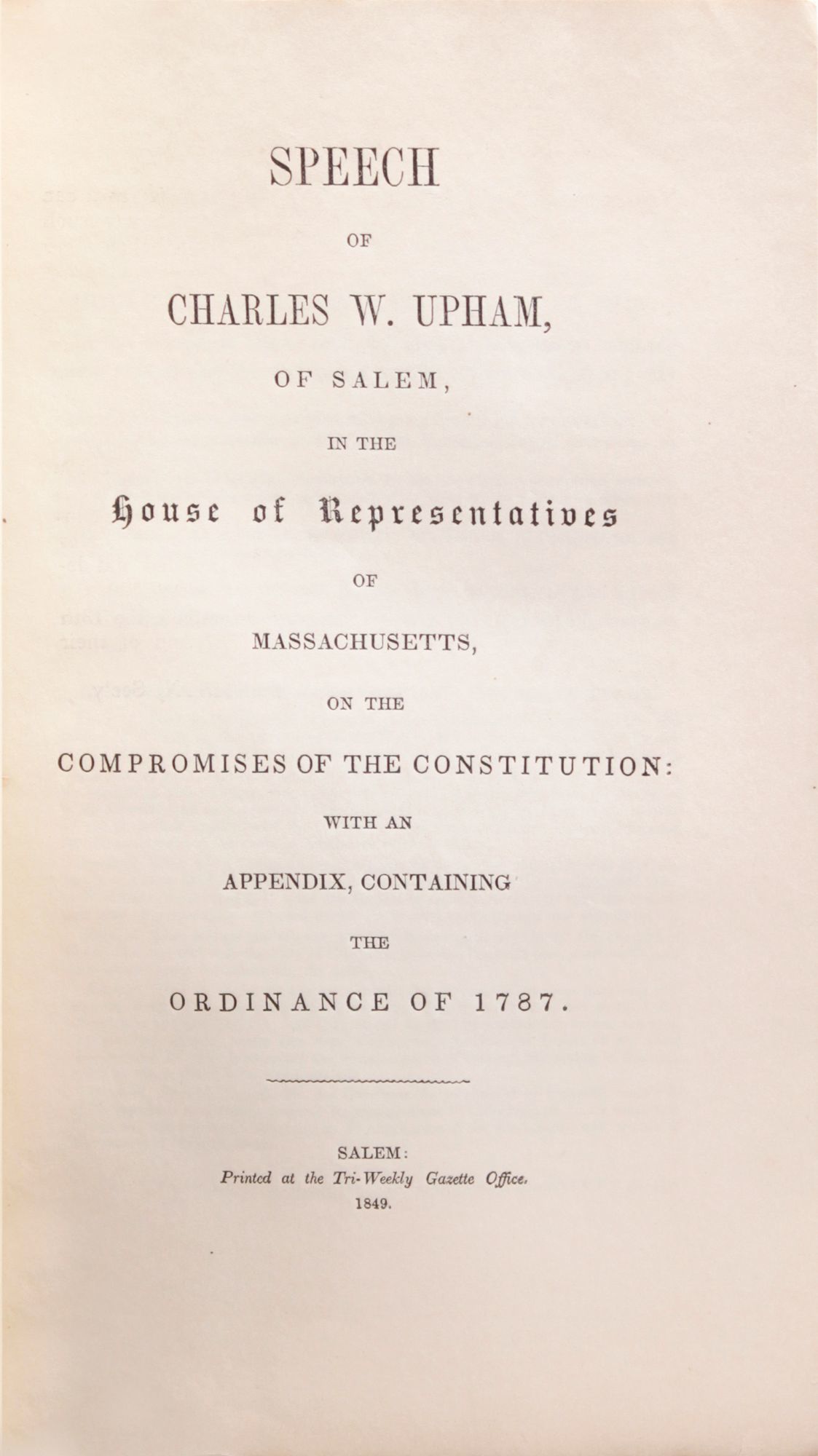 Speech of Charles W. Upham, of Salem in the House of Representatives of Massachusetts on the Compromises of the Constitution: with an Appendix, containing the Ordinance of 1787