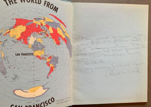 San Francisco: World Trade Center Authority, 1945. Pictorial boards. Very Good. WARMLY INSCRIBED BY LELAND CUTLER, CHAIRMAN OF THE SAN FRANCISCO WORLD TRADE CENTER AUTHORITY, on the front free endpaper. A solid copy to boot of the 1945 1st edition. Tight and VG in its light-blue boards, with mild scuffing to the rear panel and light, closed splitting along the base of the spine. Tall quarto, crisp photos and plans throughout for a project that never came to fruition.